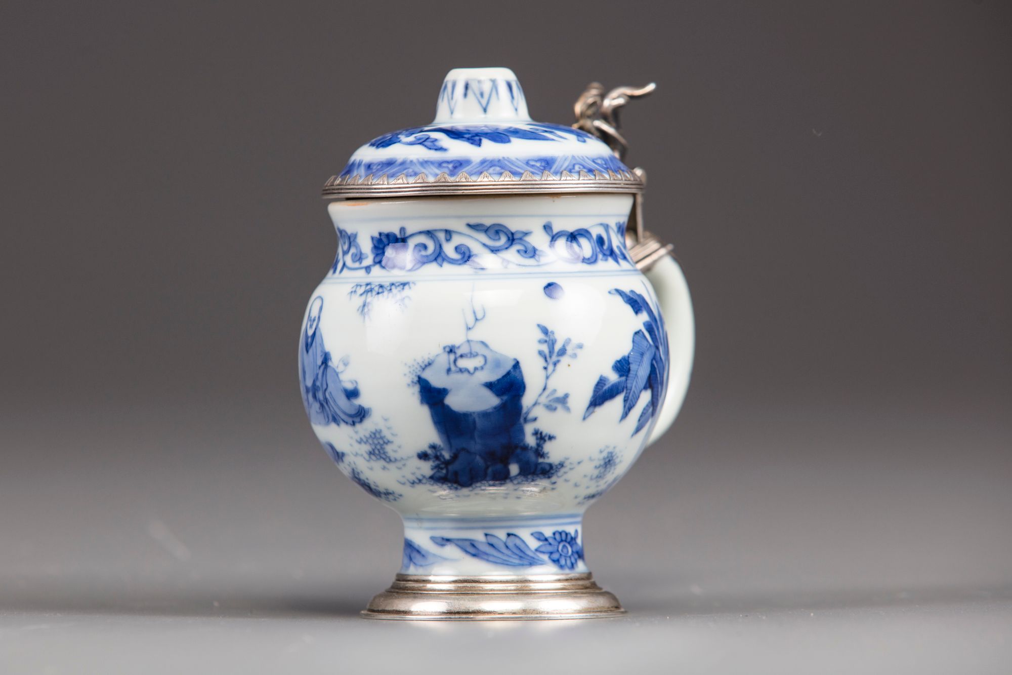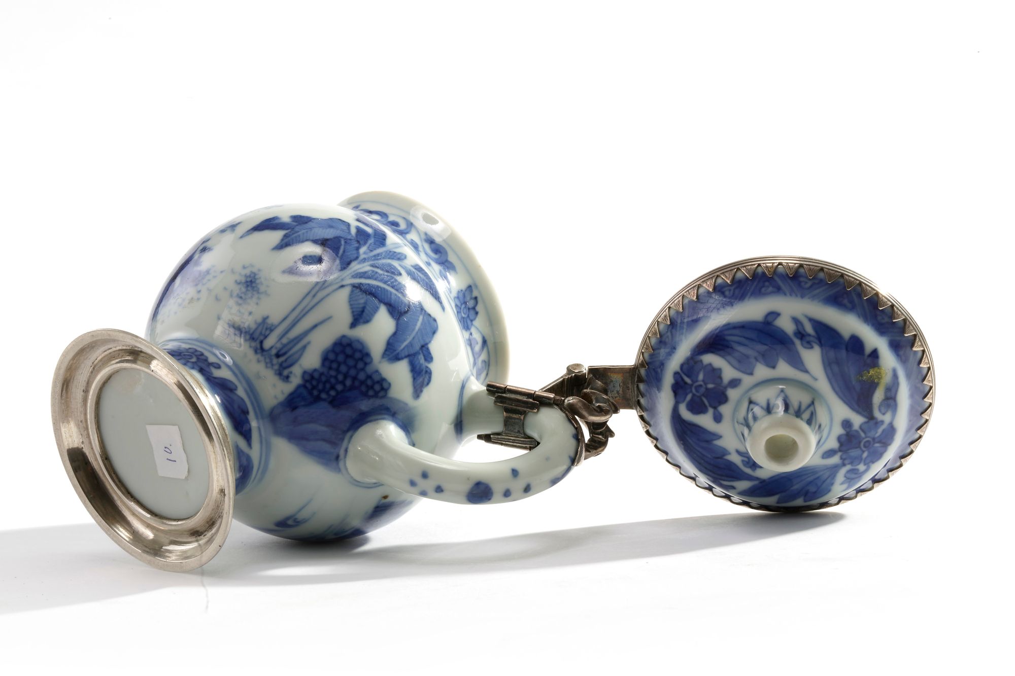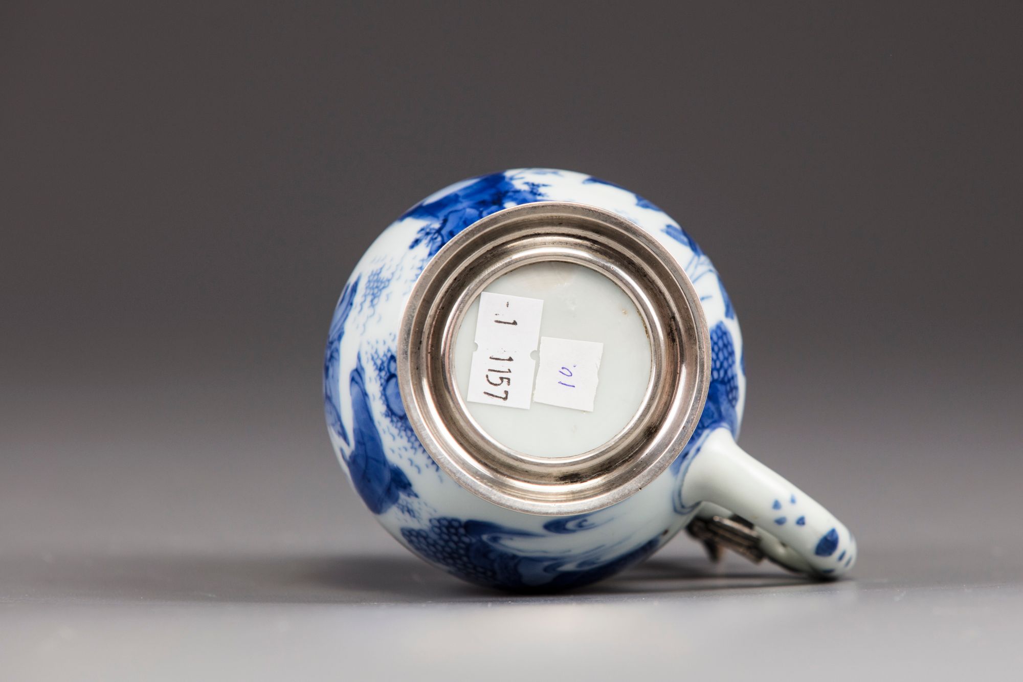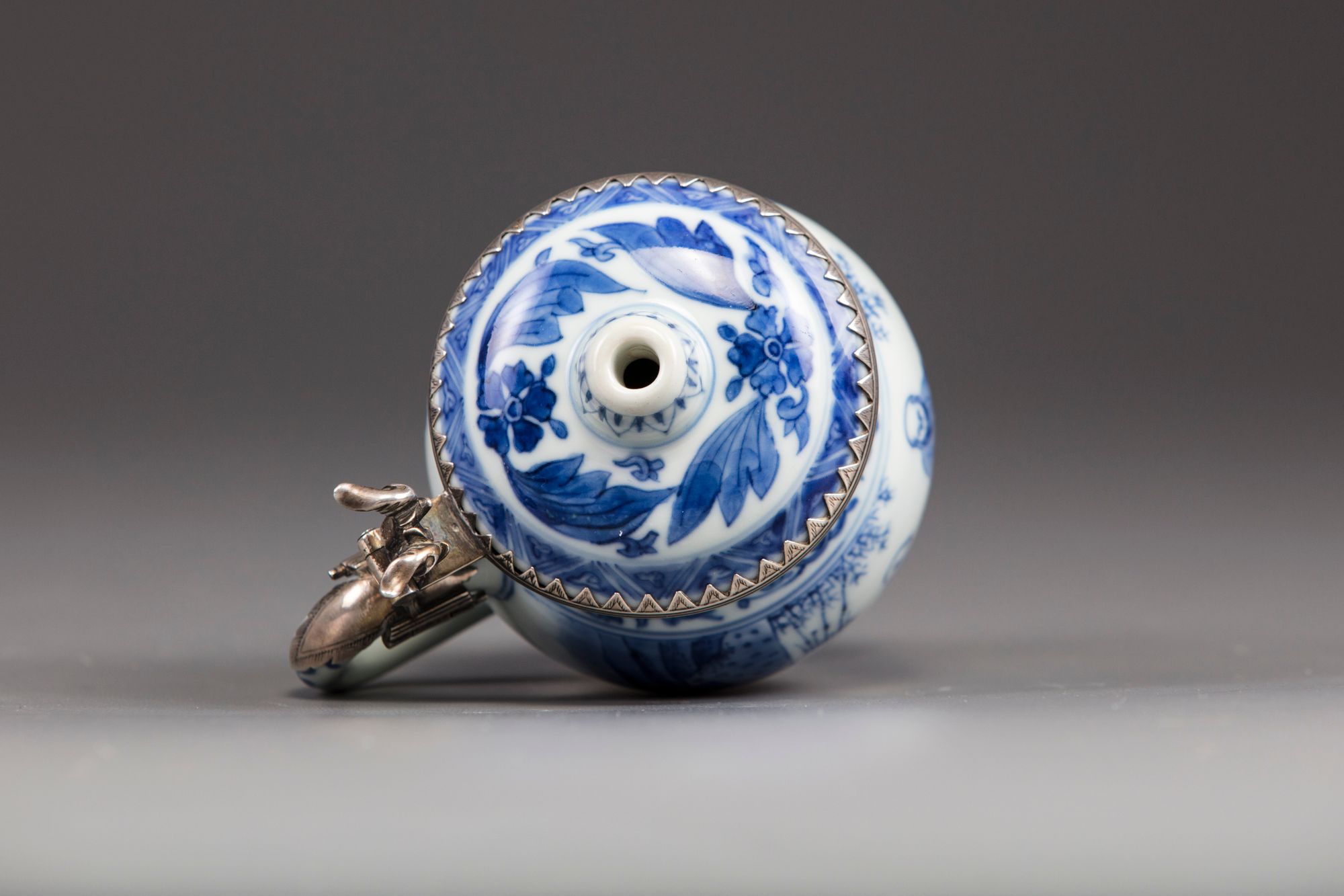 The bulbous body decorated with a continuous scene of two Luohan seated next to a censer on a rocky base amongst plants and plantain, all below a scrolling floral band. The foot is decorated with a further floral band. The domed cover is similarly decorated with a pierced finial. The silver mounts to the rim of the cover and to the foot, the hinge is modelled as a ram's horns.