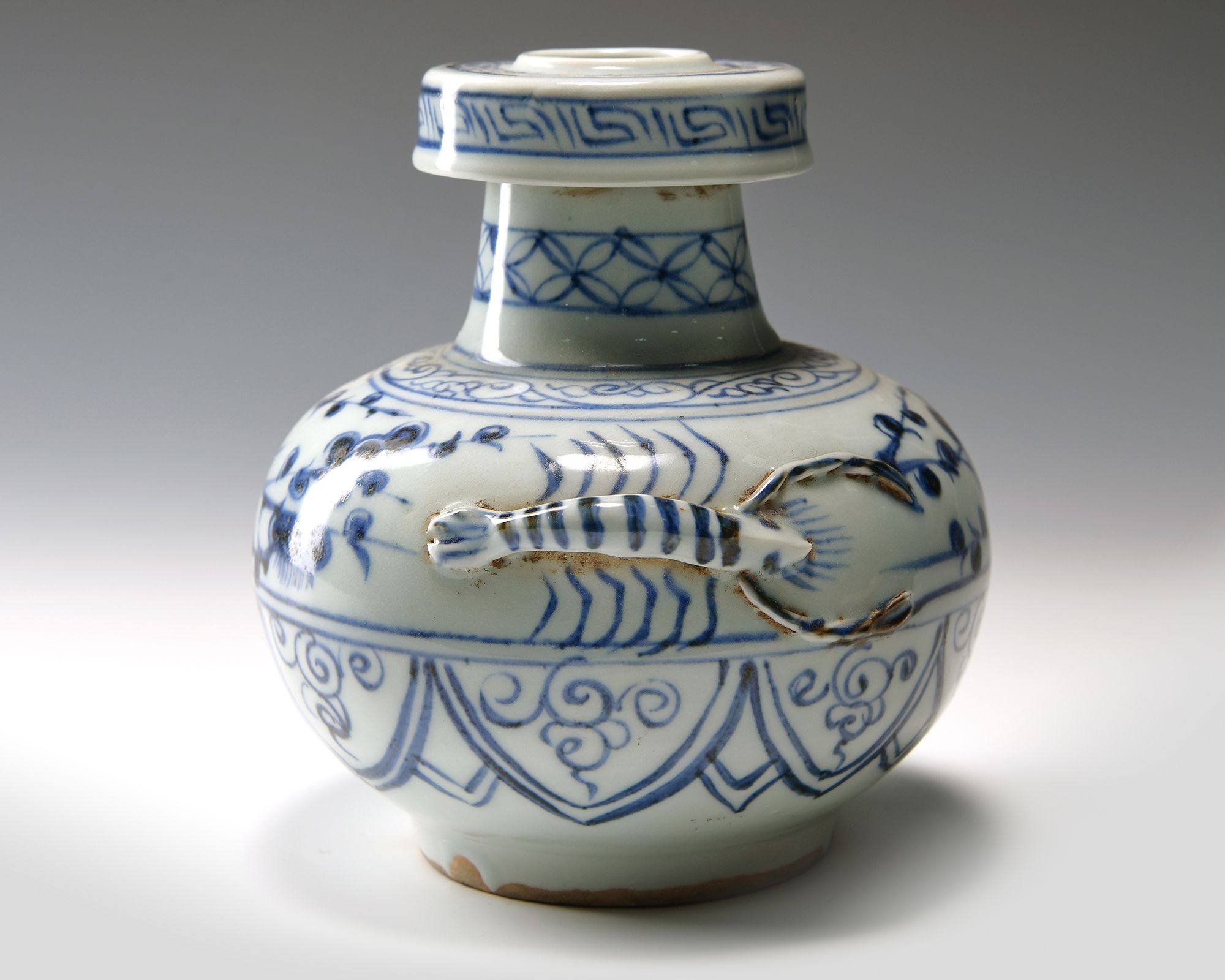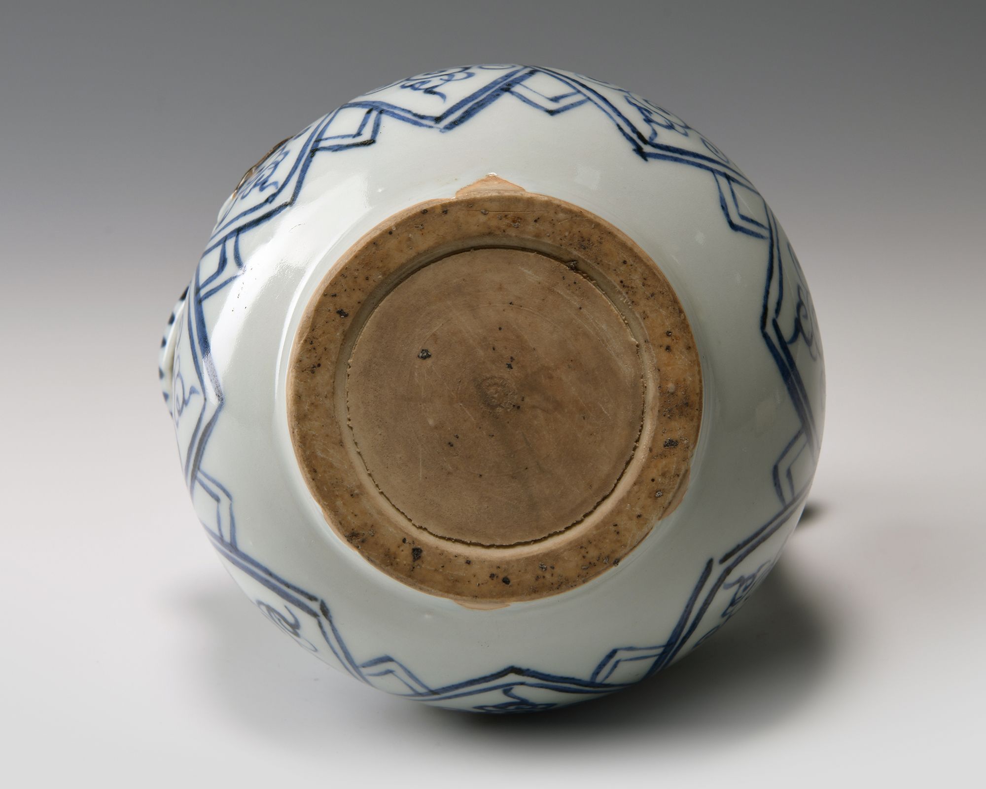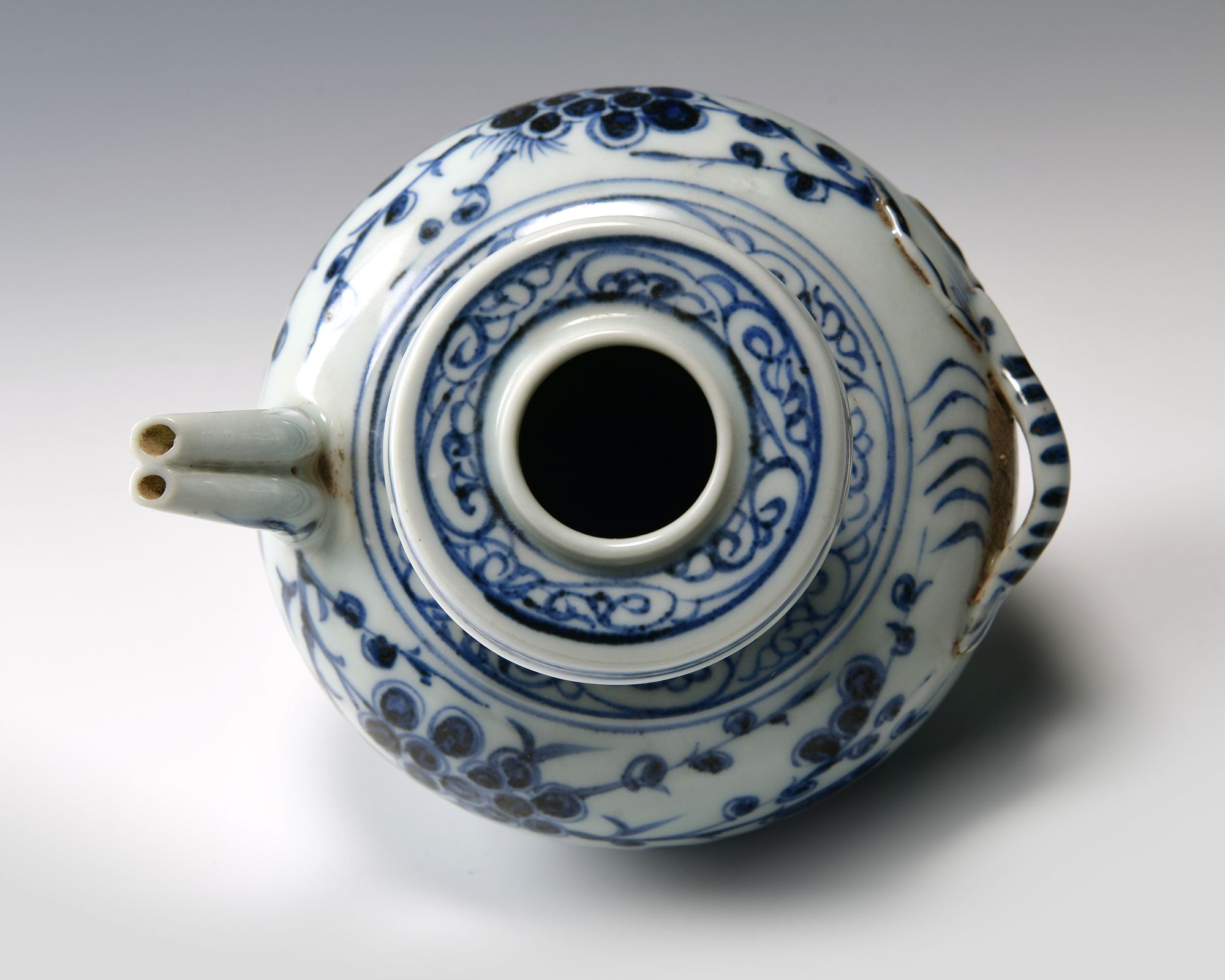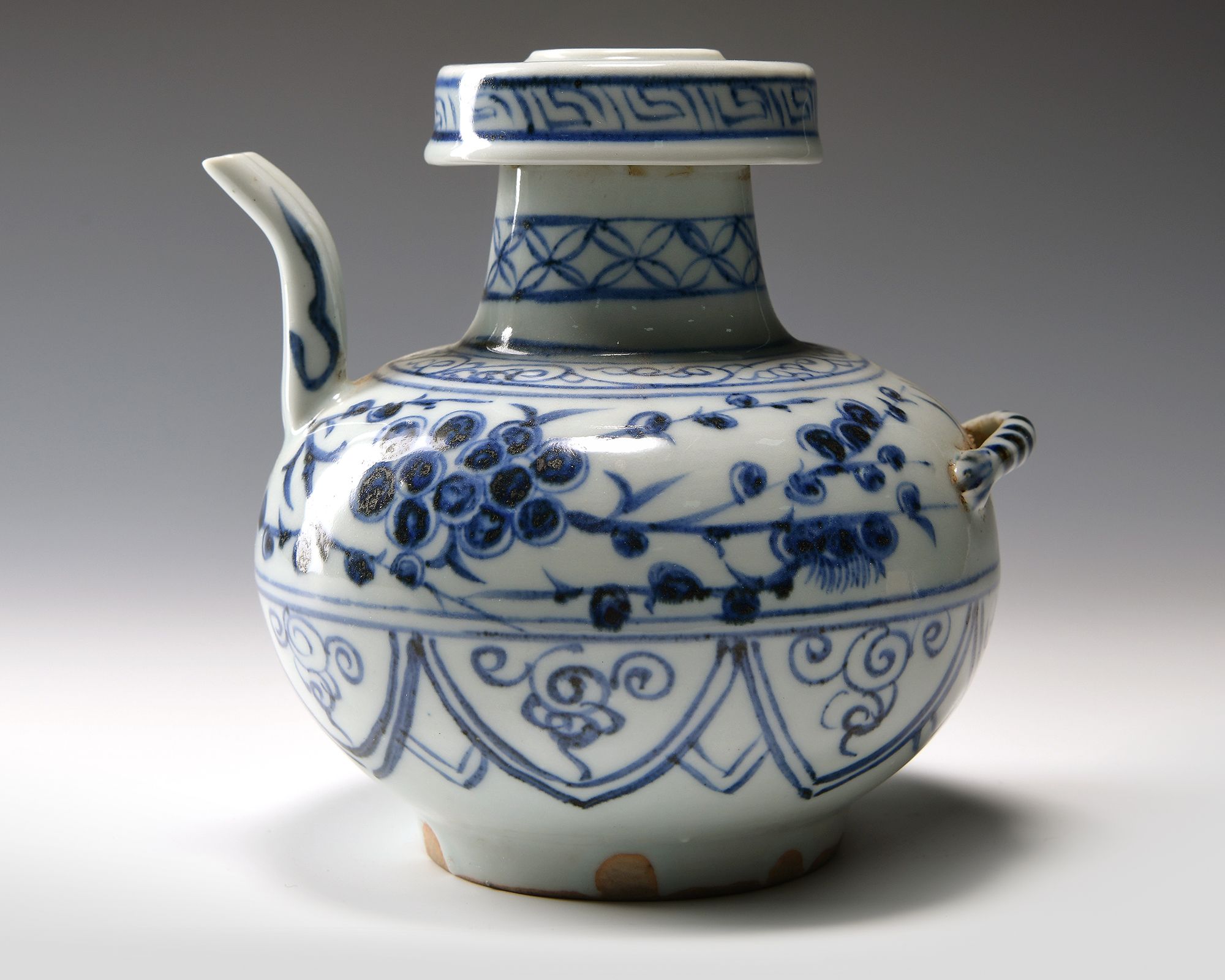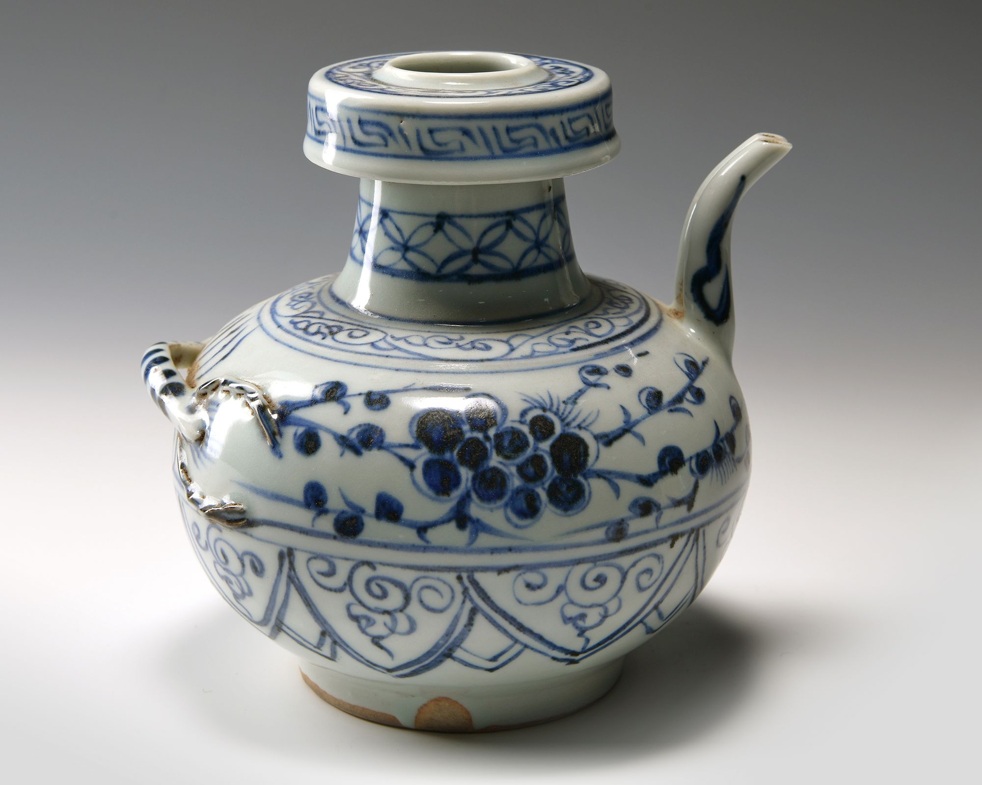 A Chinese porcelain ewer stylised with a small spout and a lobster handle in high relief, decorated with flower heads, geometric designs and grapes fruiting branches.
