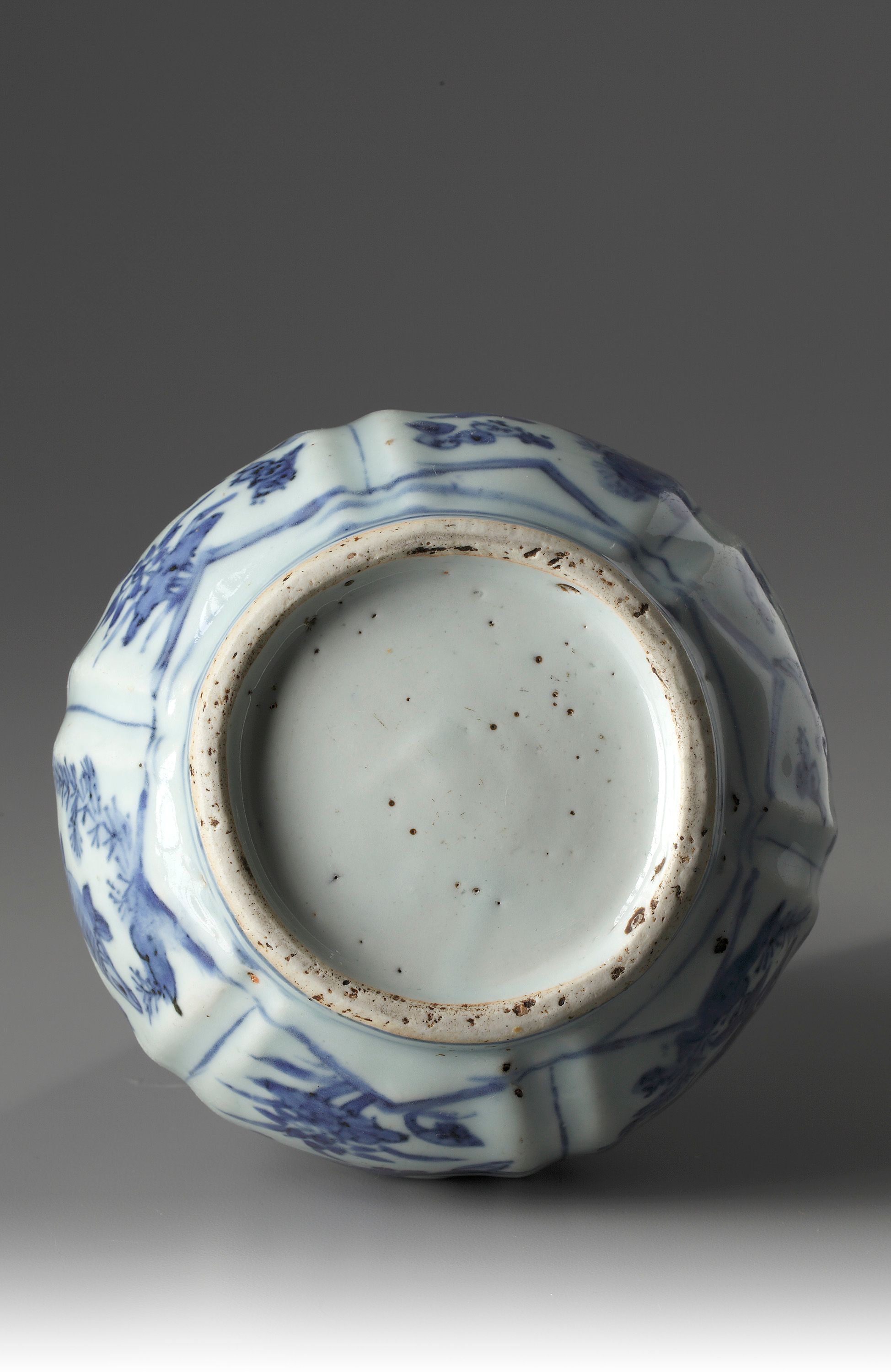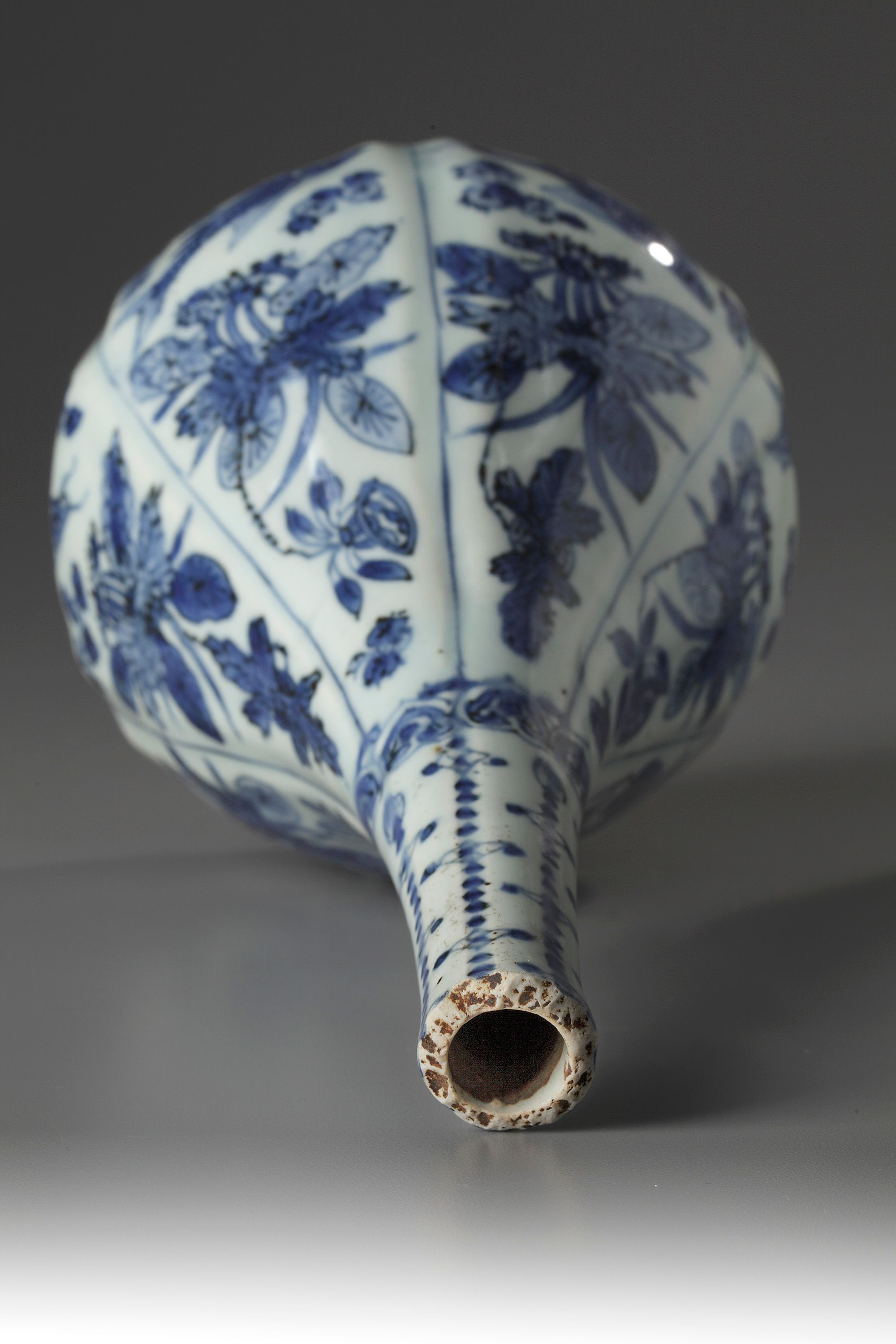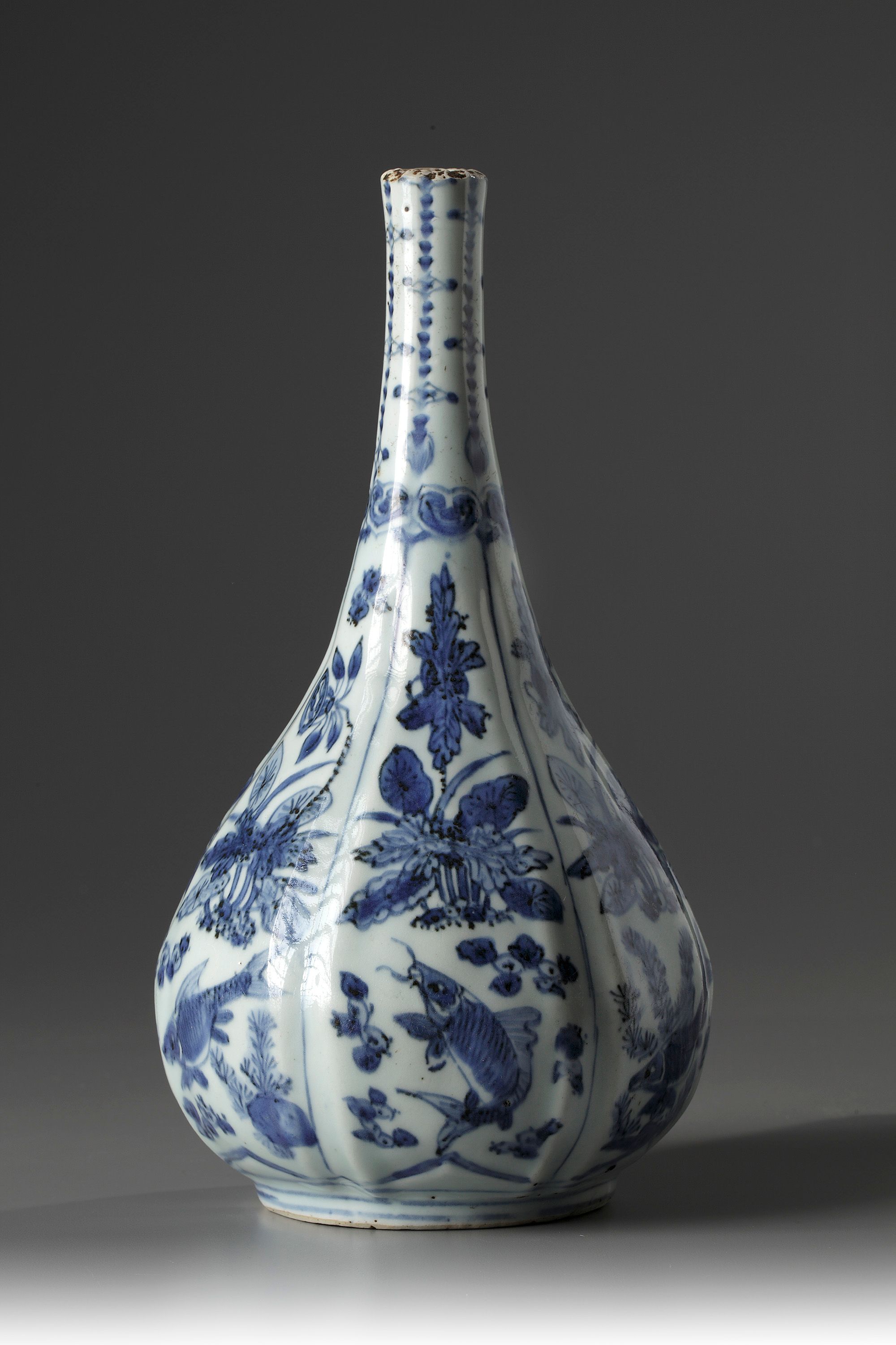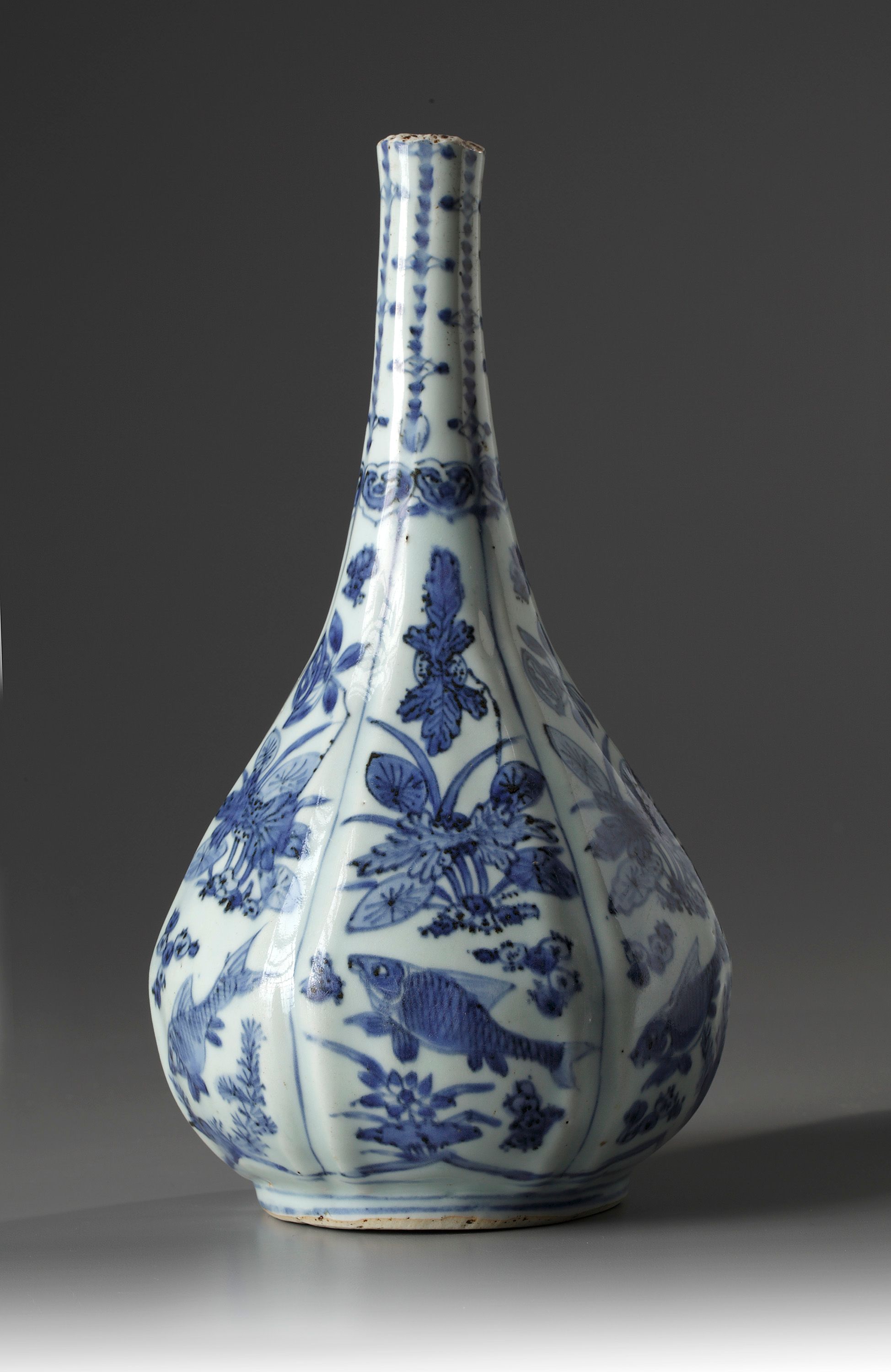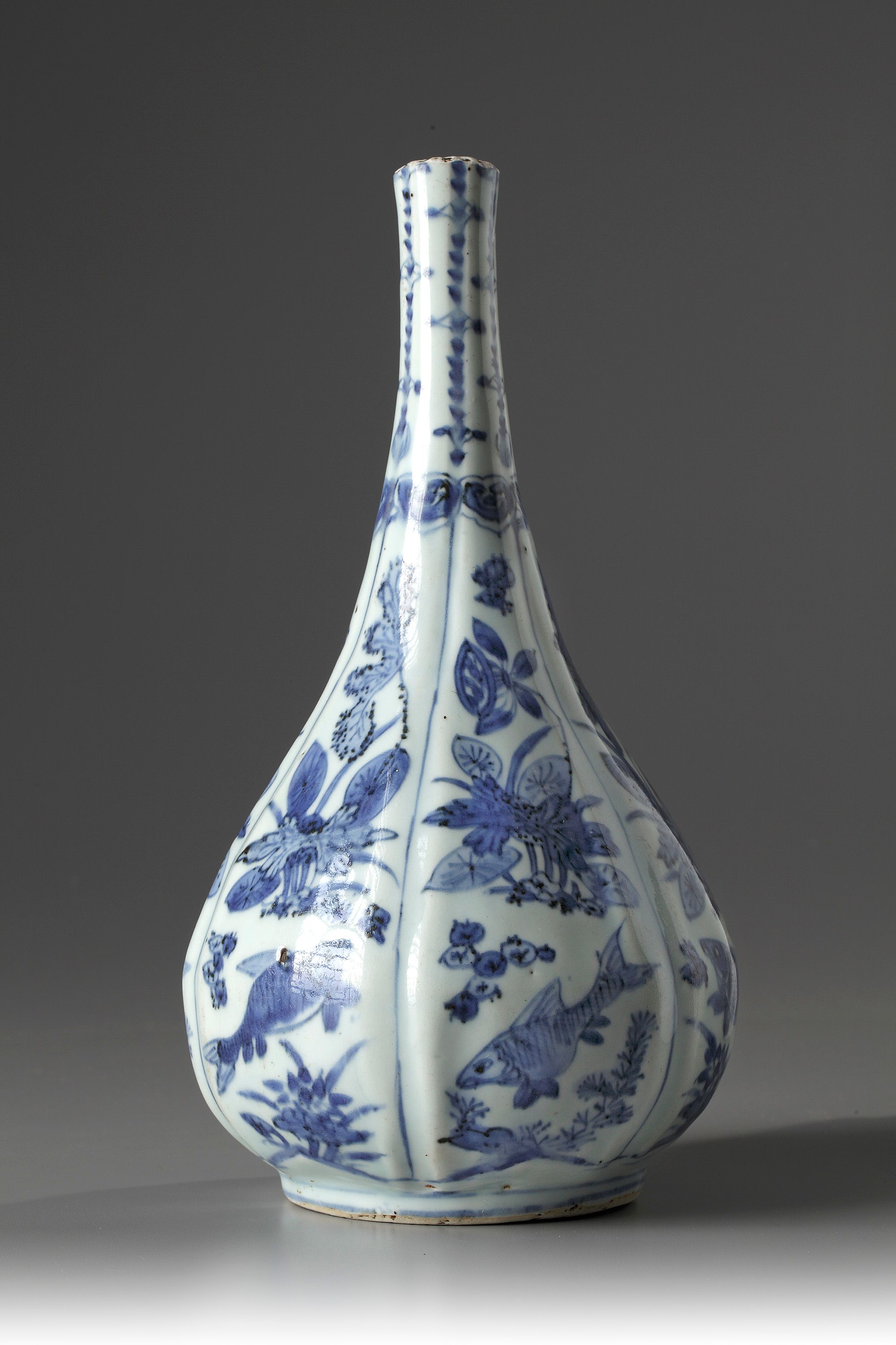 pear-shaped lobed vase, decorated in underglaze blue with 6 panels to the body, each panel showing a pond scene with lotus and carp, all under a band of ruyi heads.