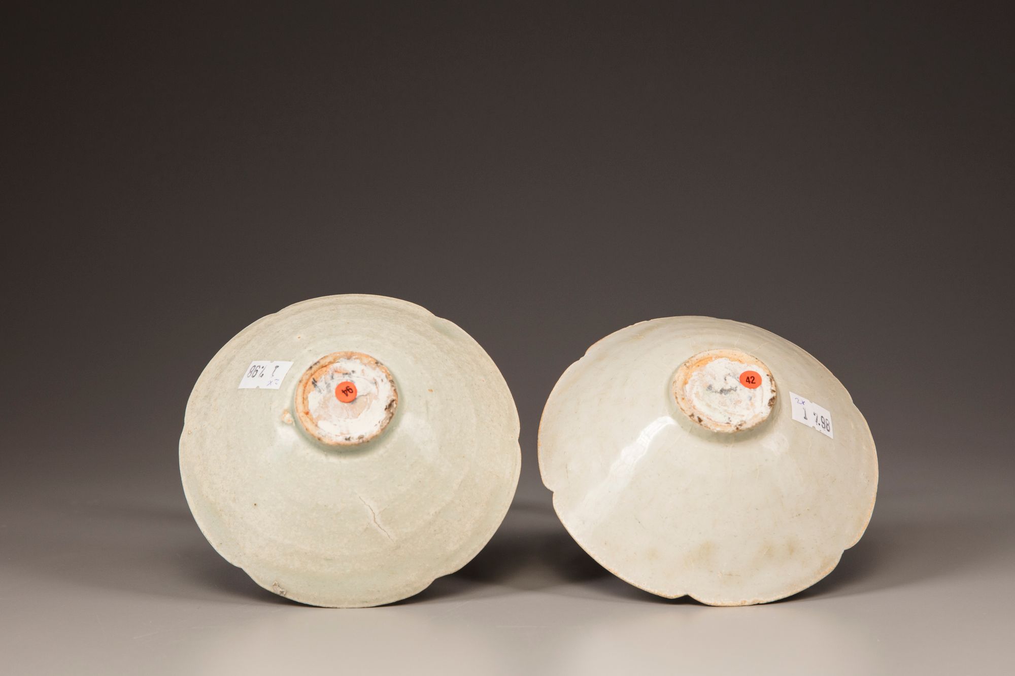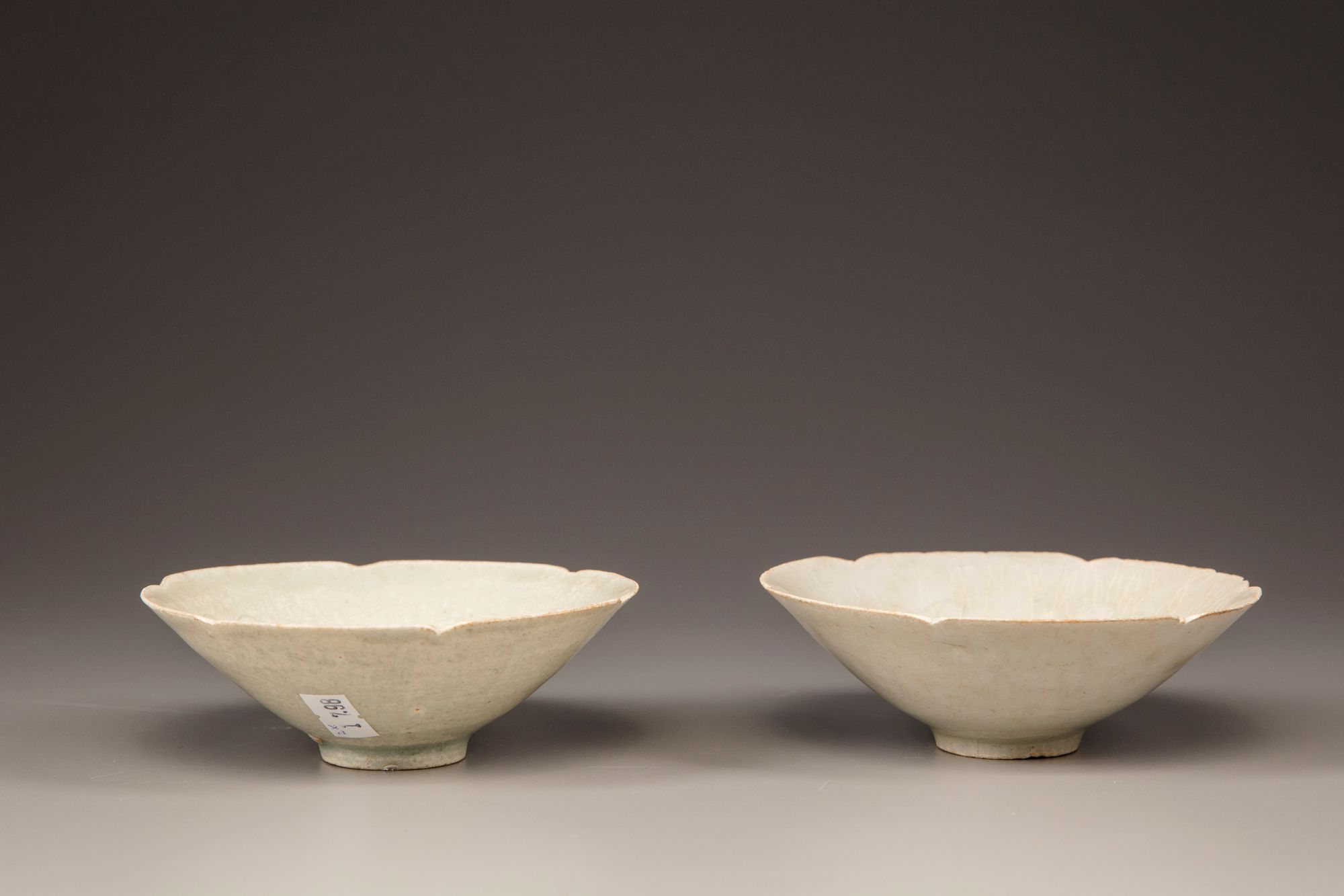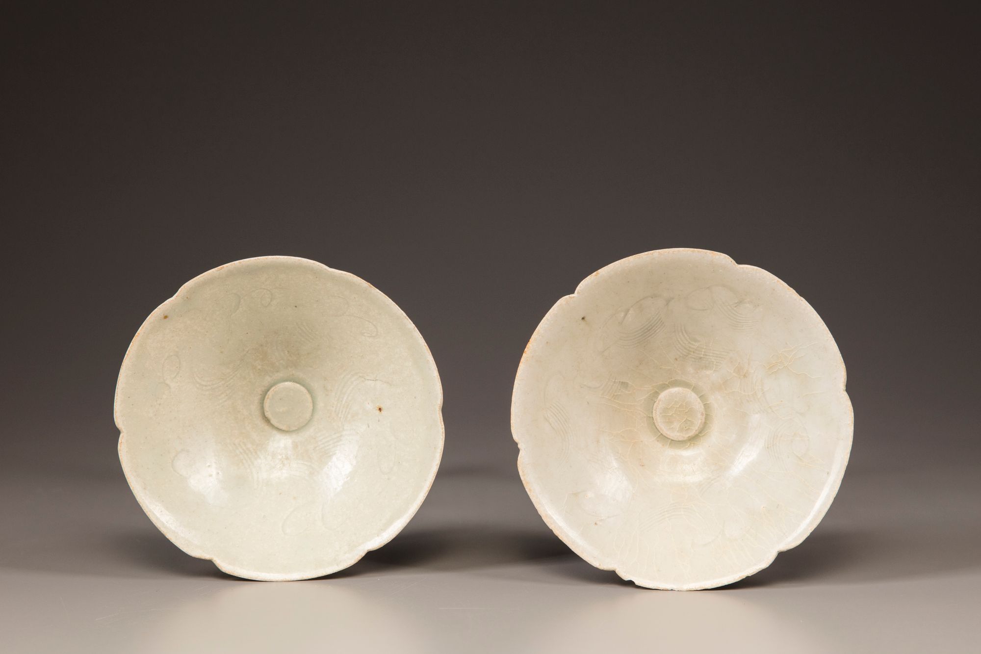 The interior of each conical bowl with carved and combed decoration imitating waves and clouds. The bowls are covered with a light blue glaze except for the base.