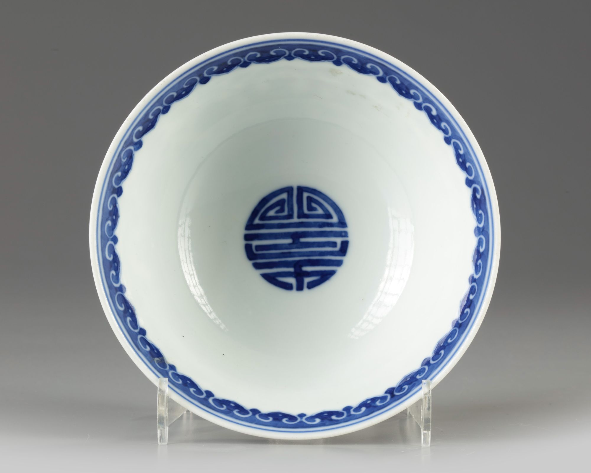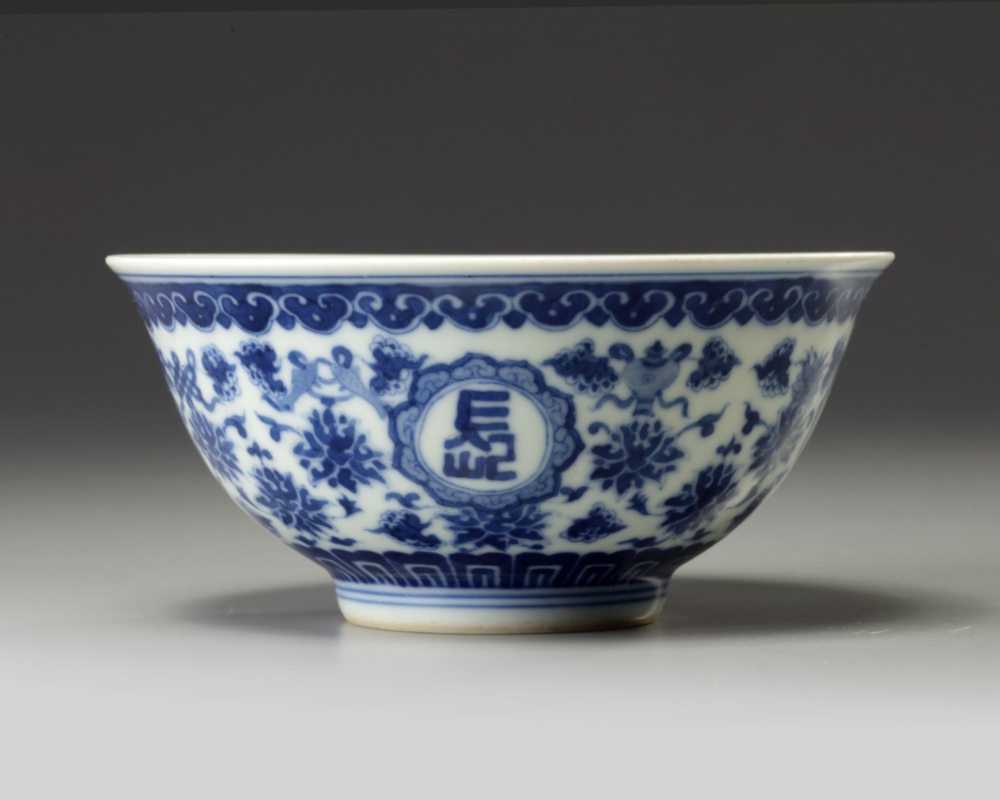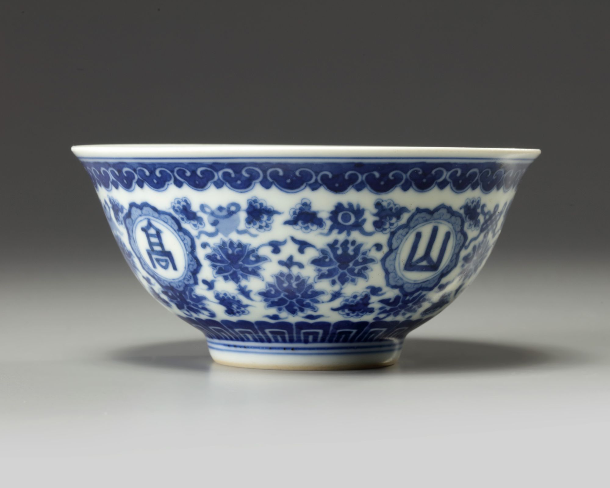 The bowl is decorated to the exterior with four roundels enclosing the characters 'shan gao shui chang' in seal script (which means 'as high as the mountains and as long as the rivers', surrounded by the Eight Buddhist Emblems supported on scrolling lotus, all below a ruyi-head band to the rim and lappets to the foot. The base with an apocryphal Guangxu mark.