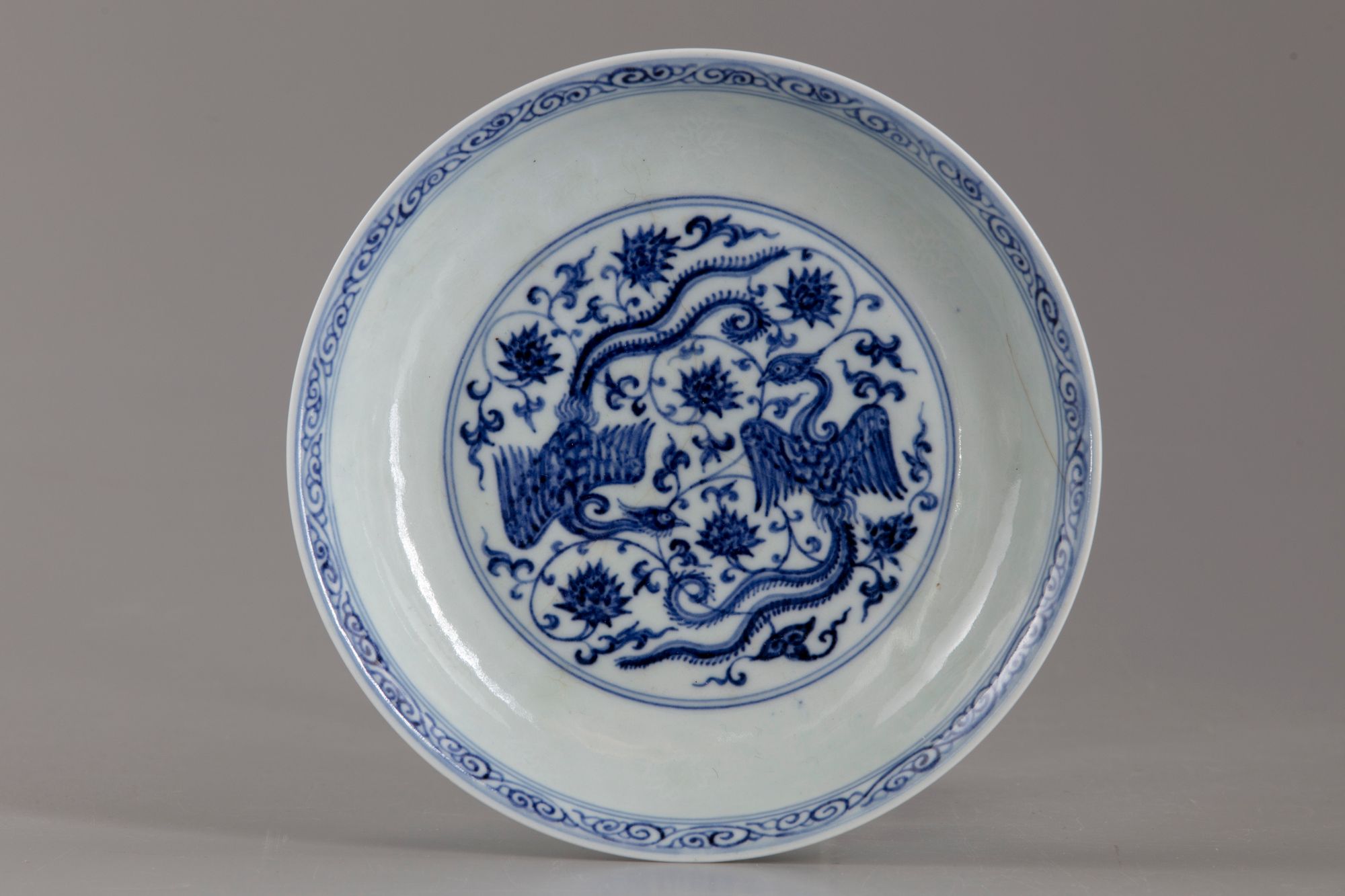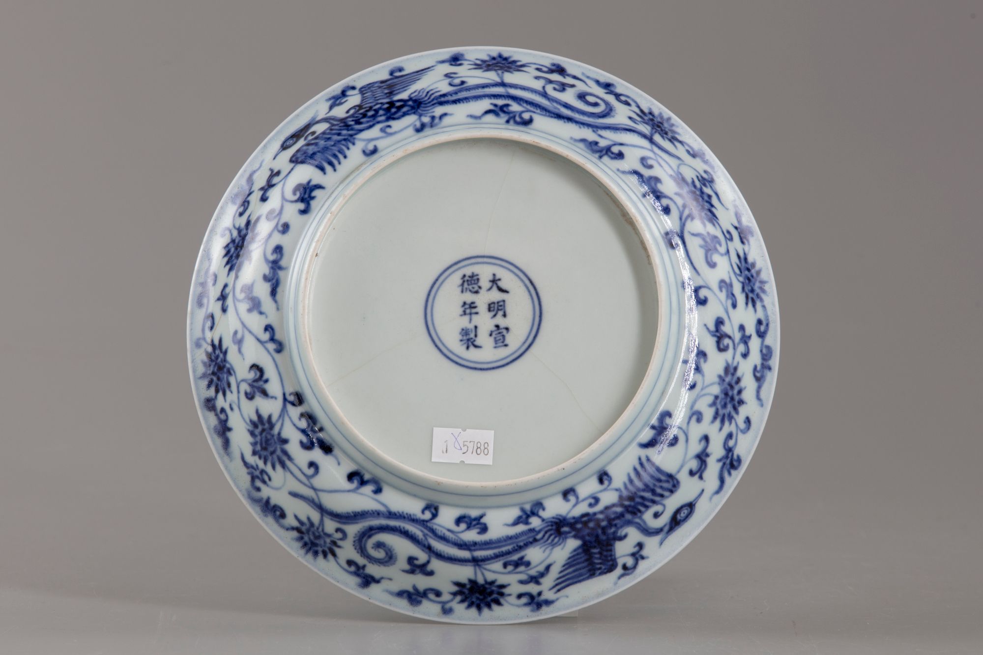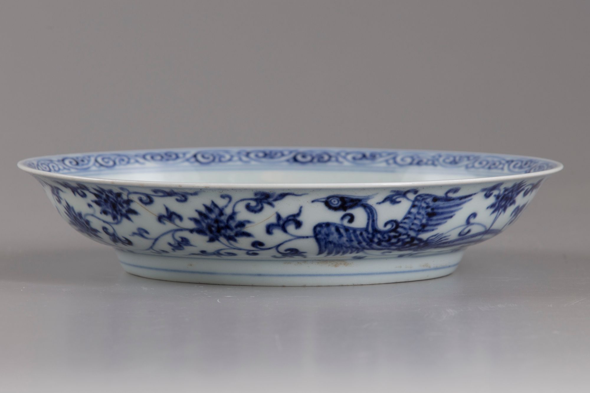 The interior is decorated with two confronting phoenix in flight amongst scrolling lotus, the cavetto is decorated in an anhua design of further phoenix and scrolling lotus, all below a classic scroll to the rim. The exterior is decorated with two further phoenix in flight amongst lotus scrolls. The base bears an apocryphal Xuande mark.