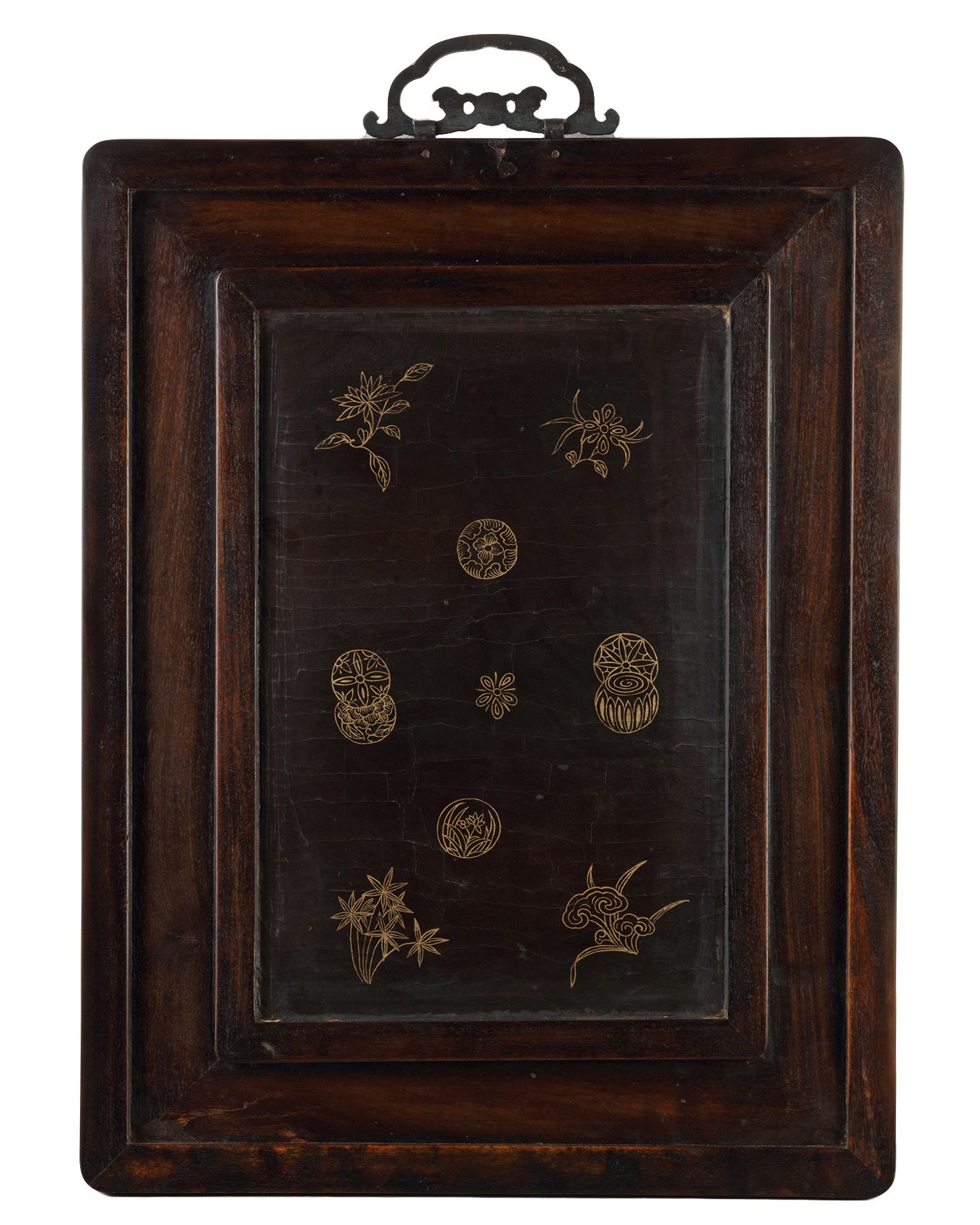 The plaque is decorated in shades of underglaze blue with two long gourds hanging from a leafy vine, the tips of the gourds are executed in underglaze copper red. The lower corner of the plaque has two seal marks. The reverse is decorated with gilt lacquered flowers.
