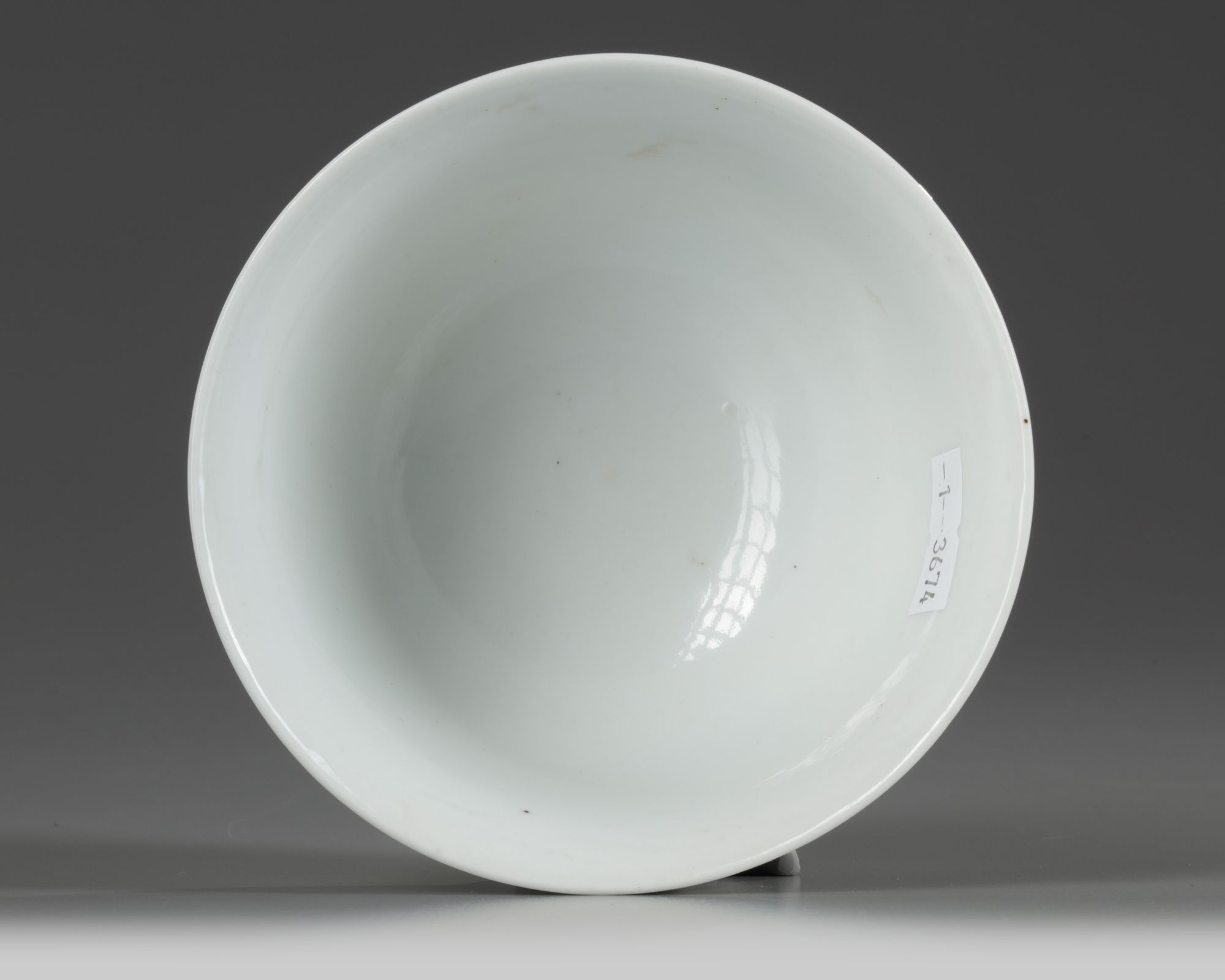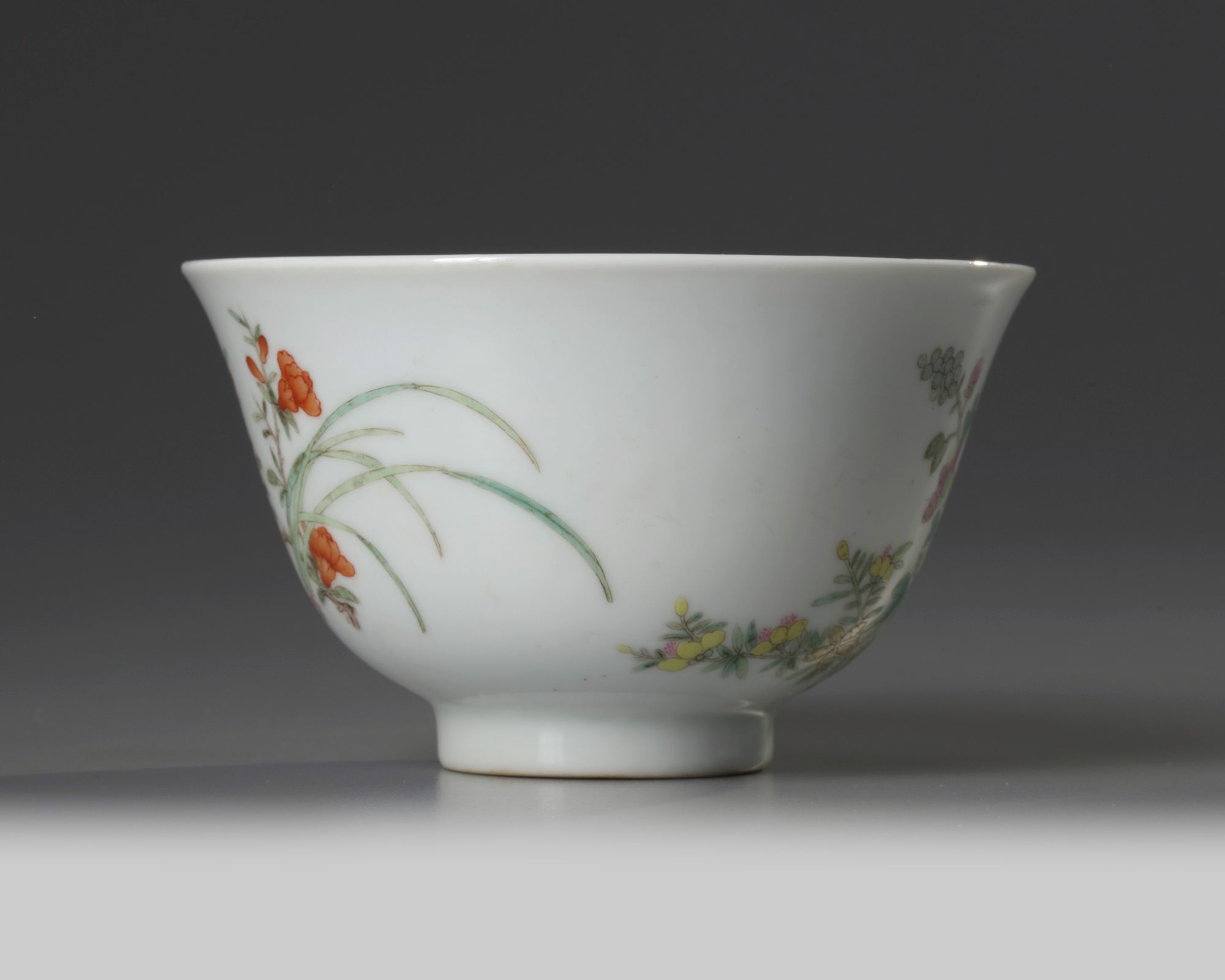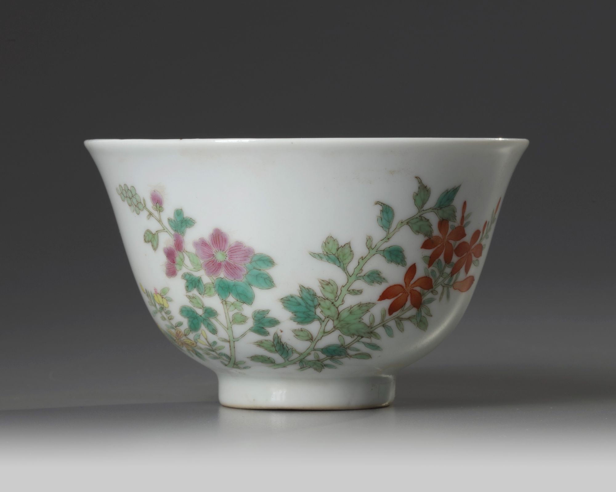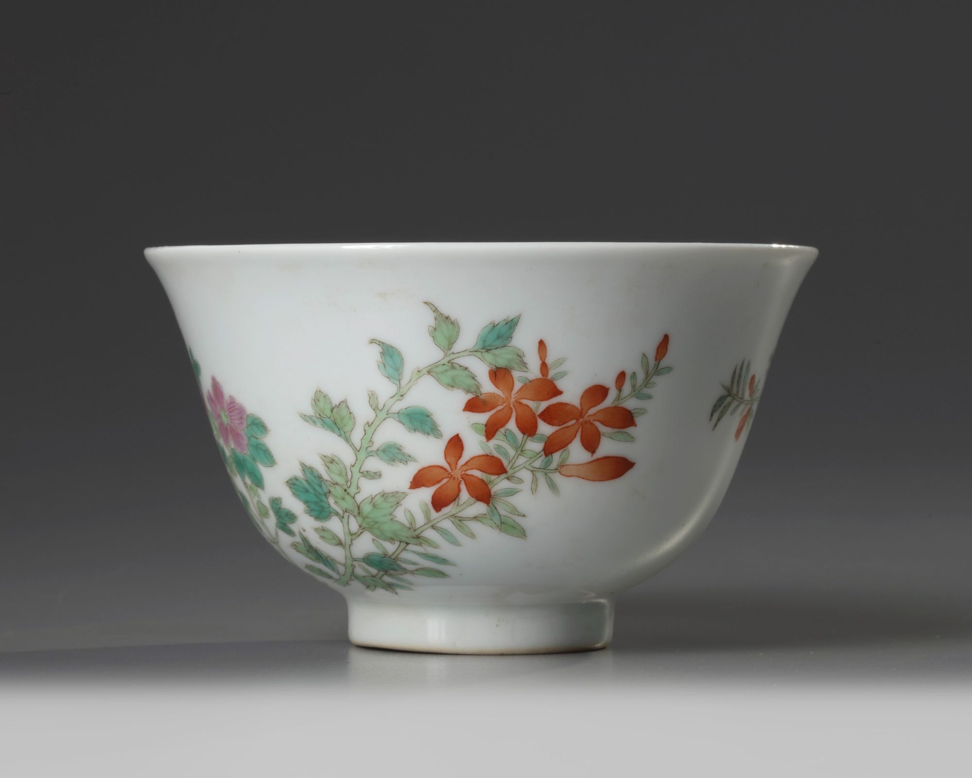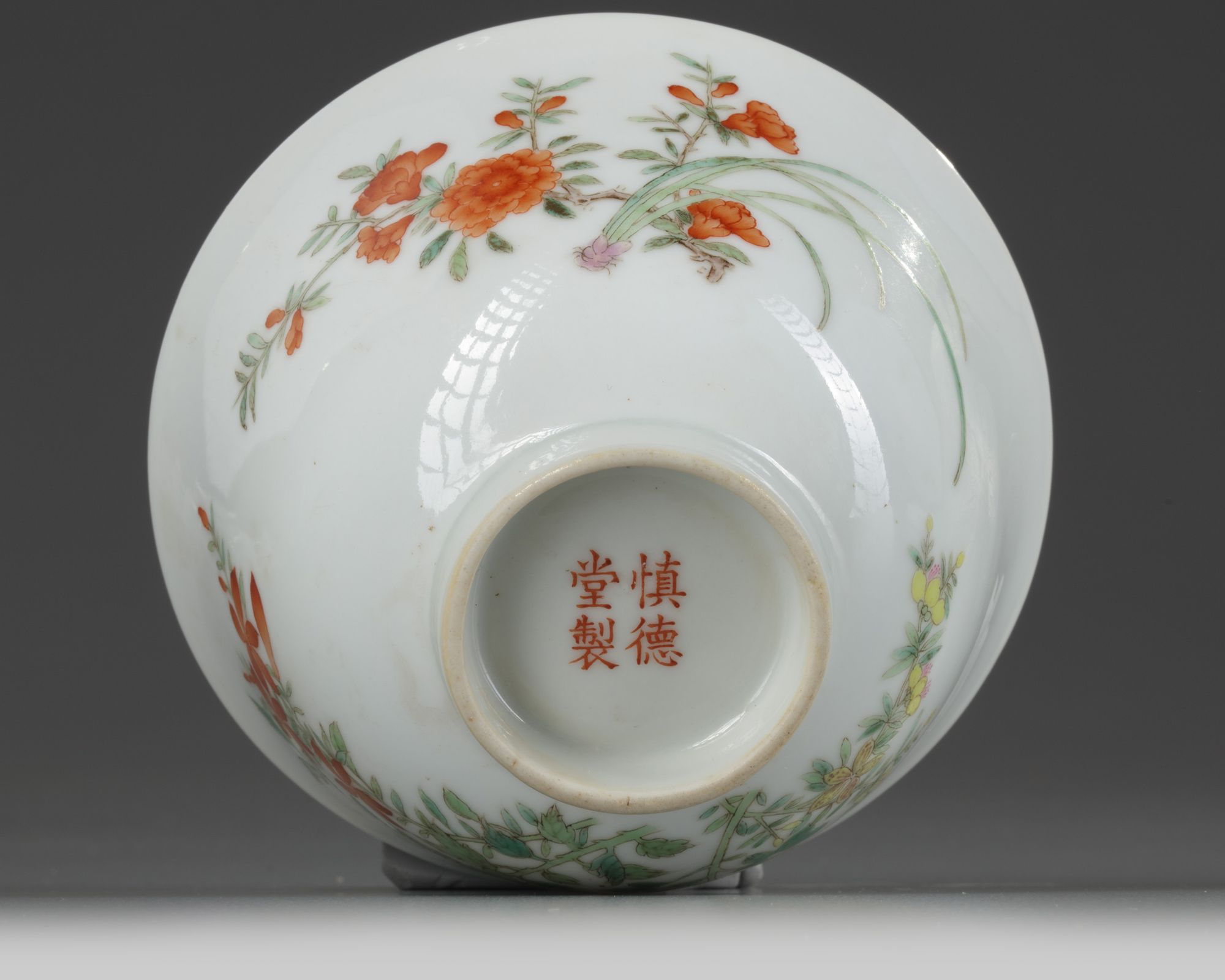 The bowl is delicately decorated to the exterior with two large flower sprays, the base with a 'Shendetang zhi' mark in iron red.