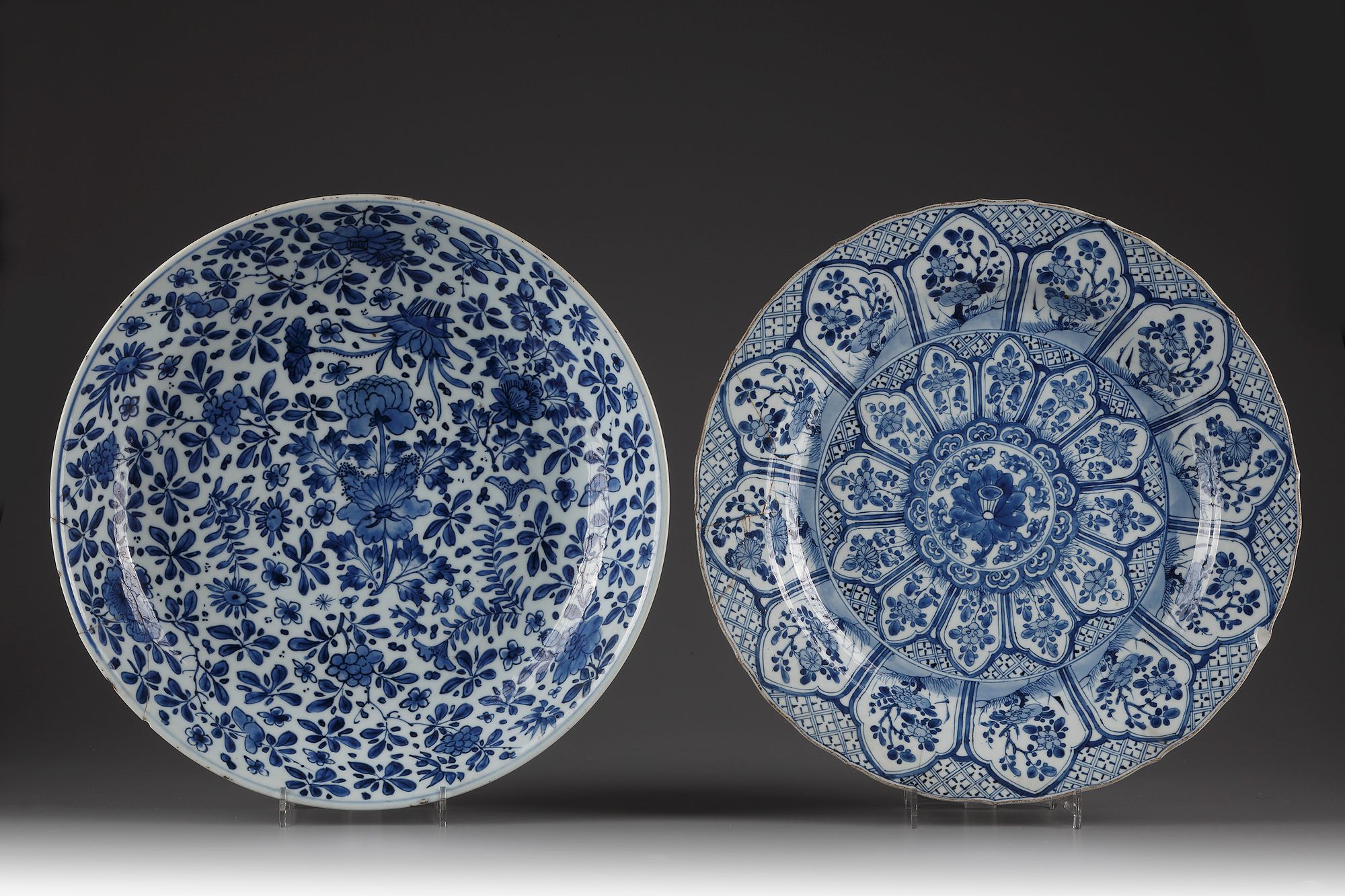 One with shaped rim, painted with petal shaped panels of flower sprays and foliage on hatch pattern grounds, marked with artemisia leaf. The other painted with various flowers of peony and lotus, marked with a lozenge.