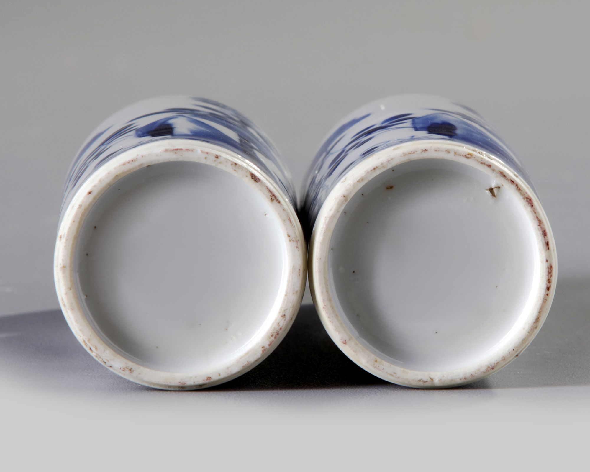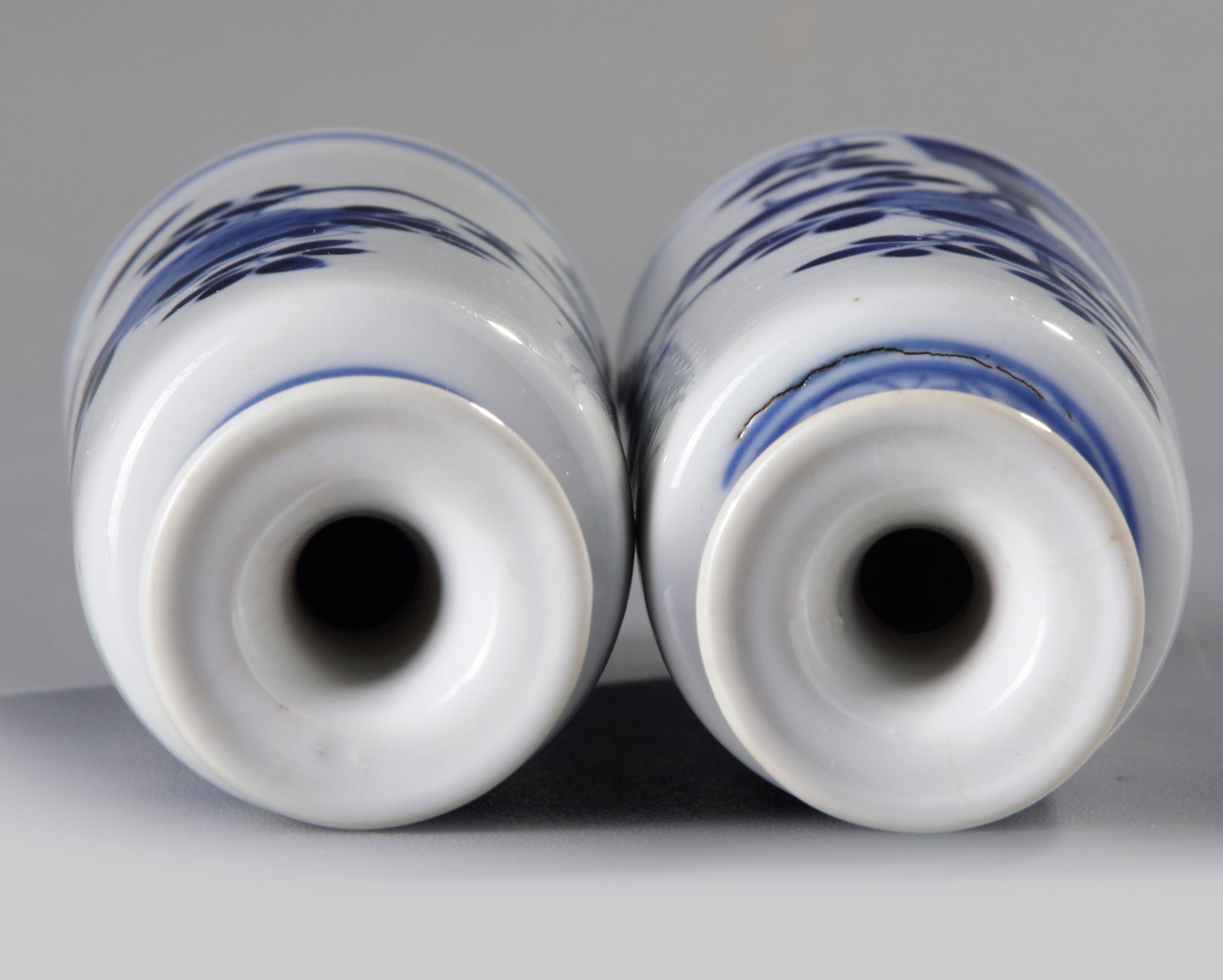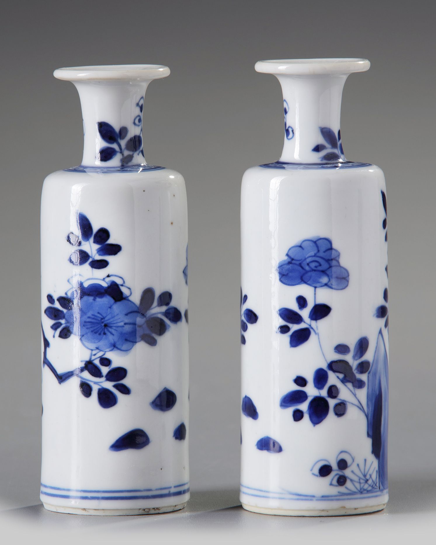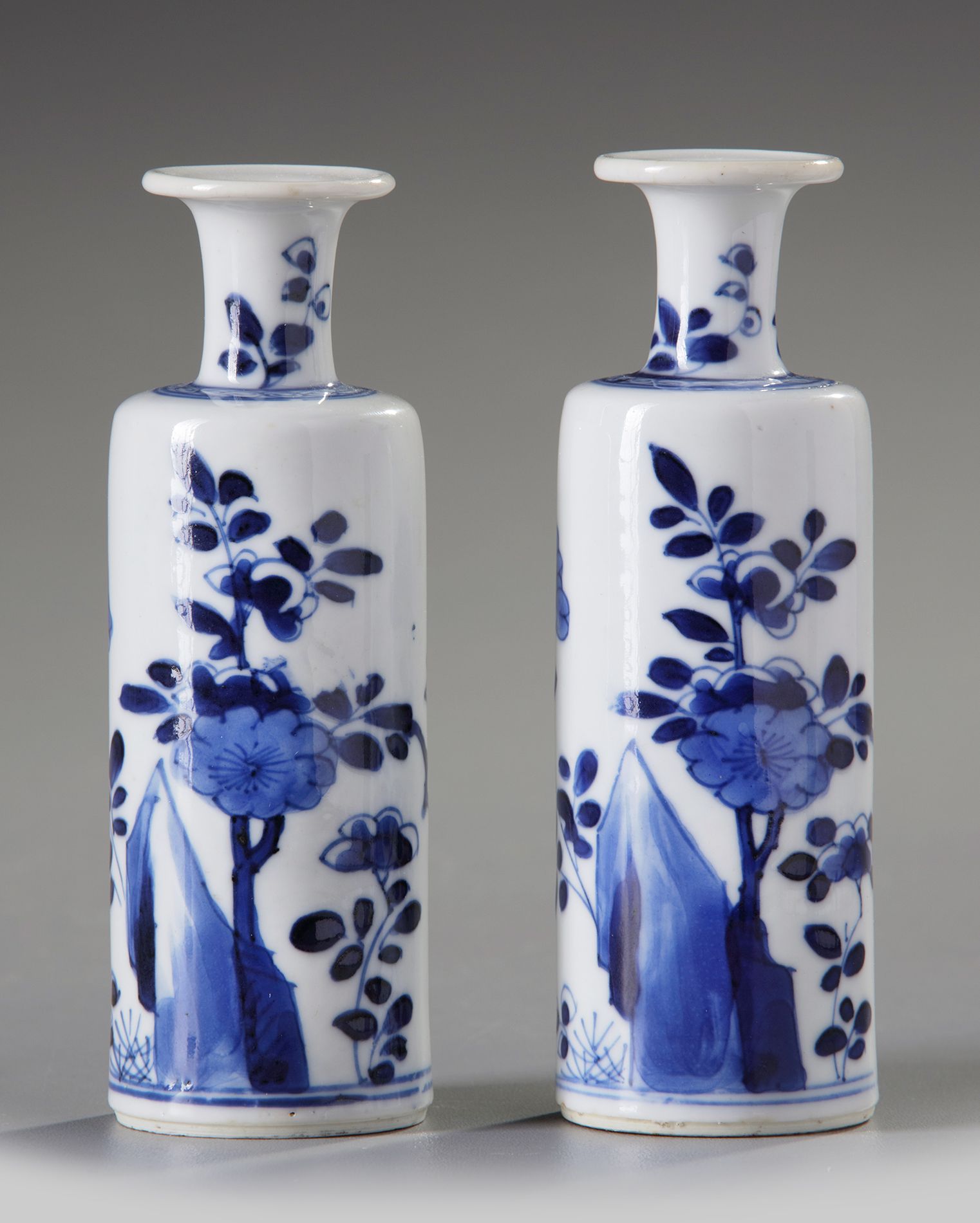 Each vase is decorated with branched flowers growing from rocks to the body, each neck is decorated with further flower sprays.