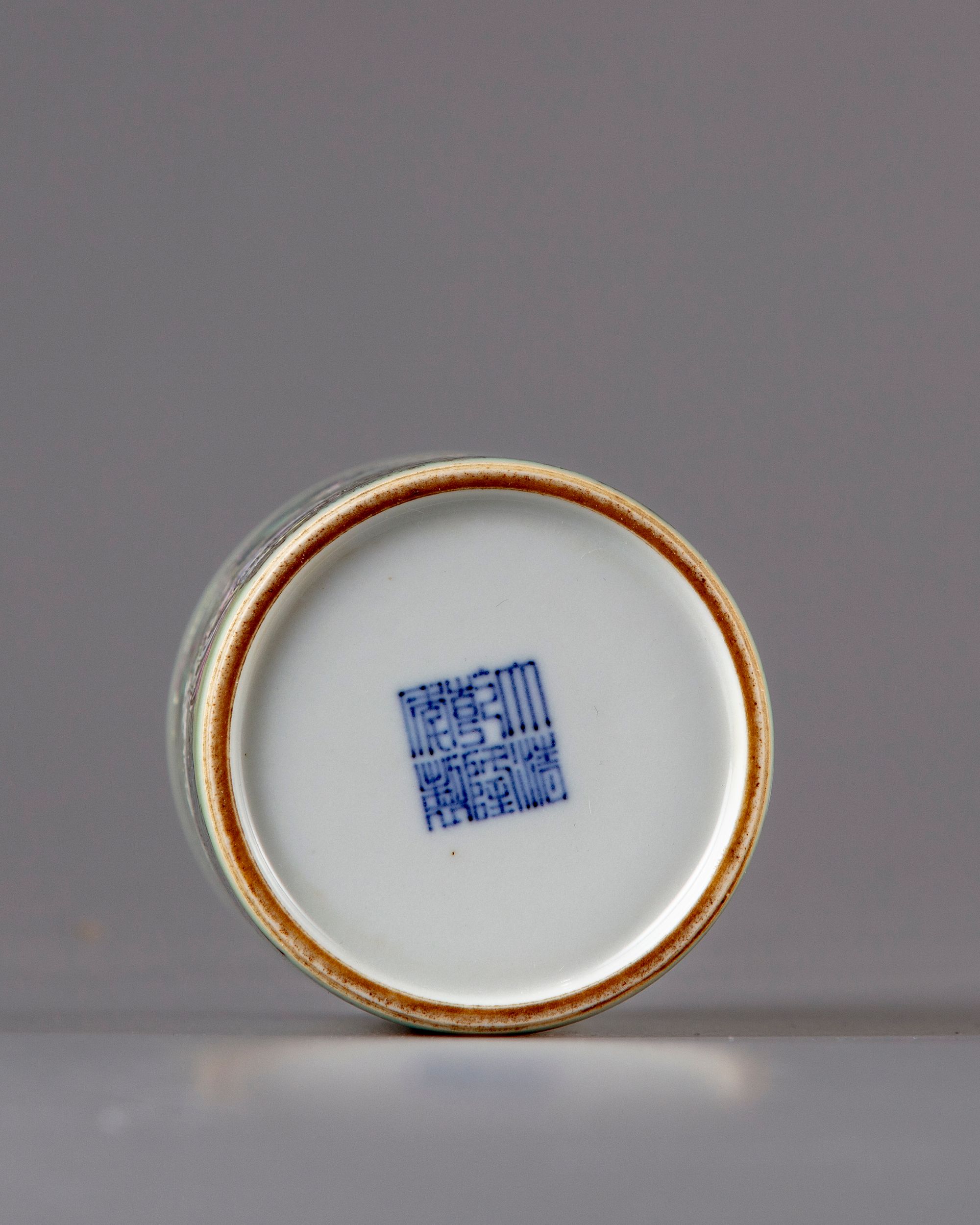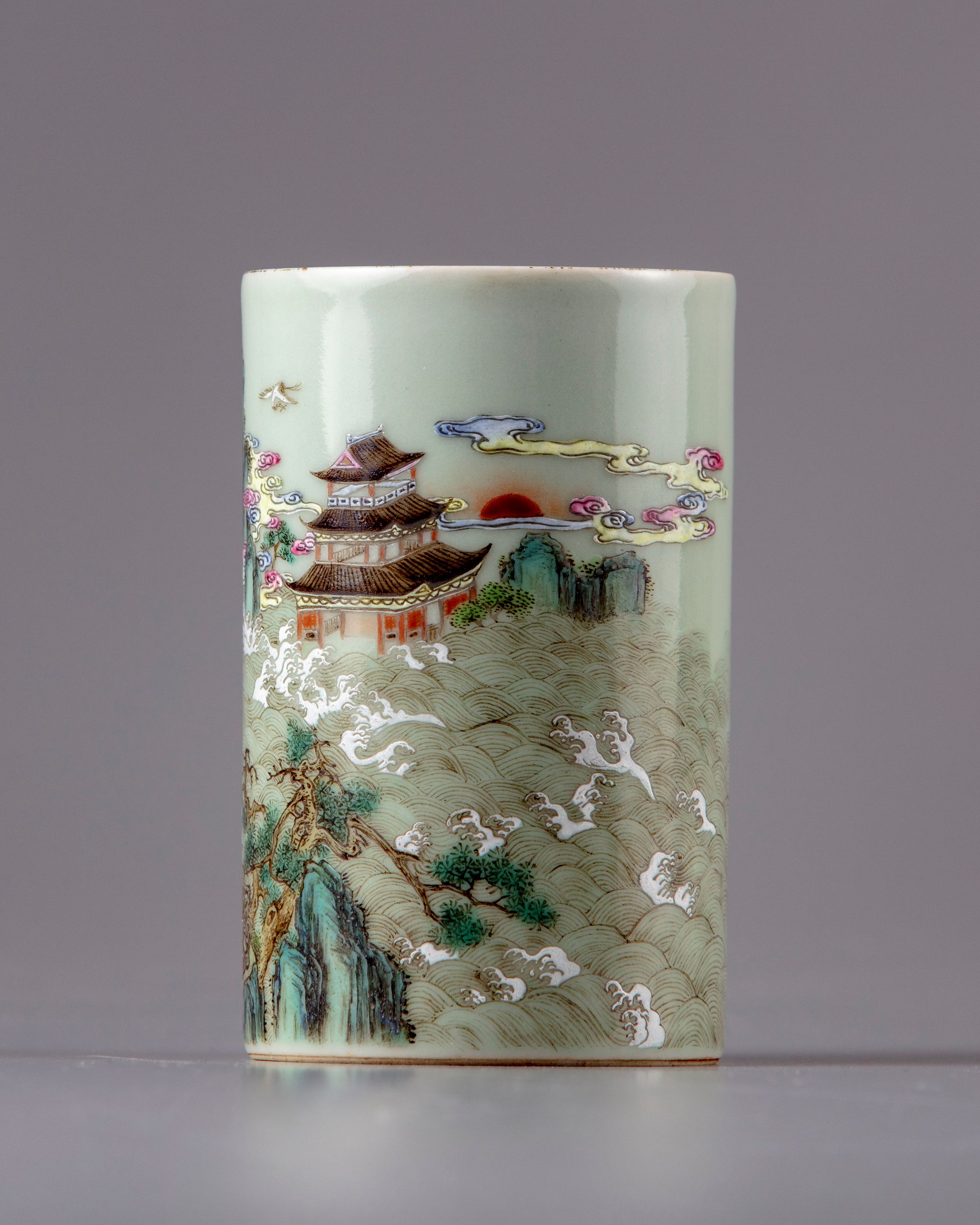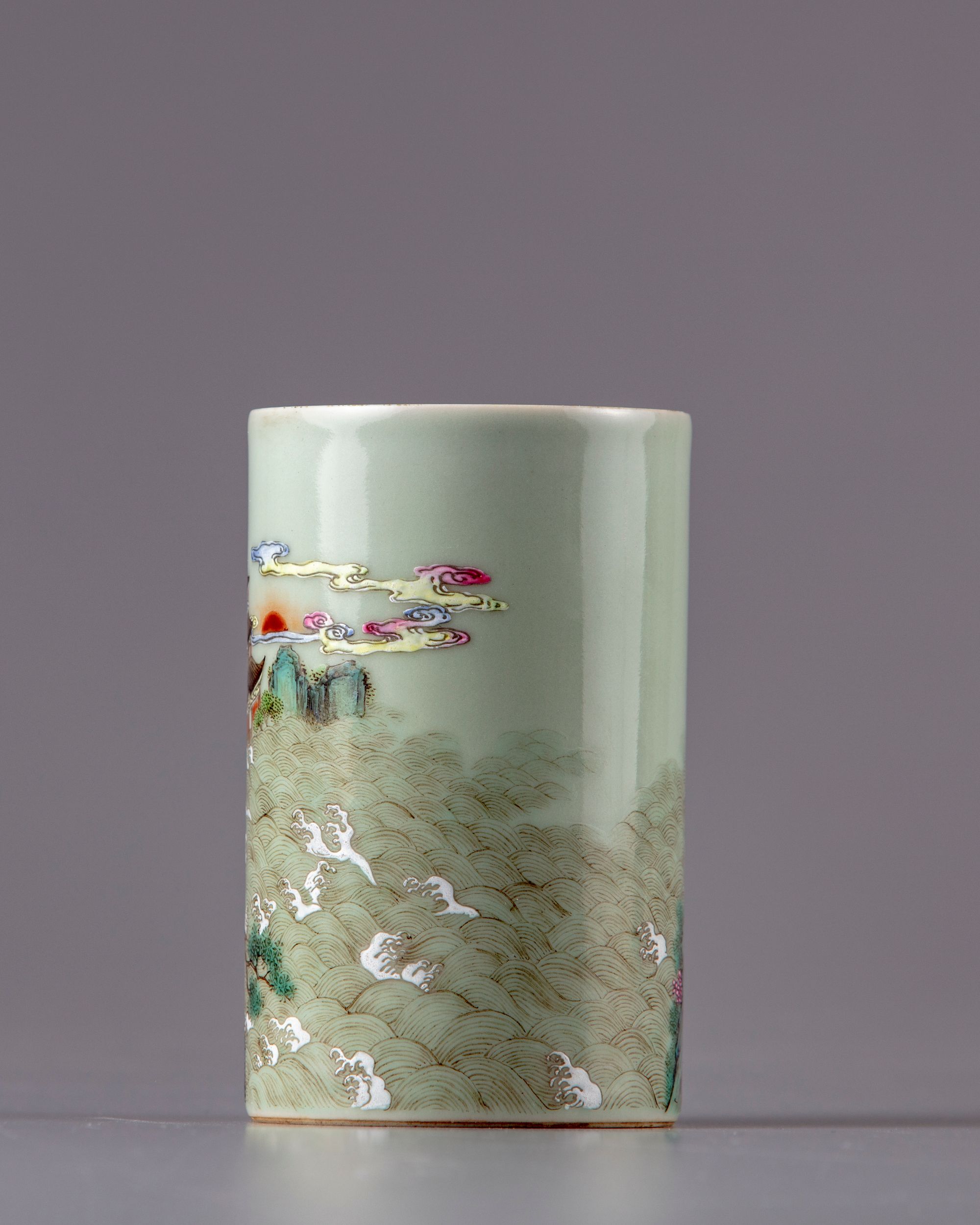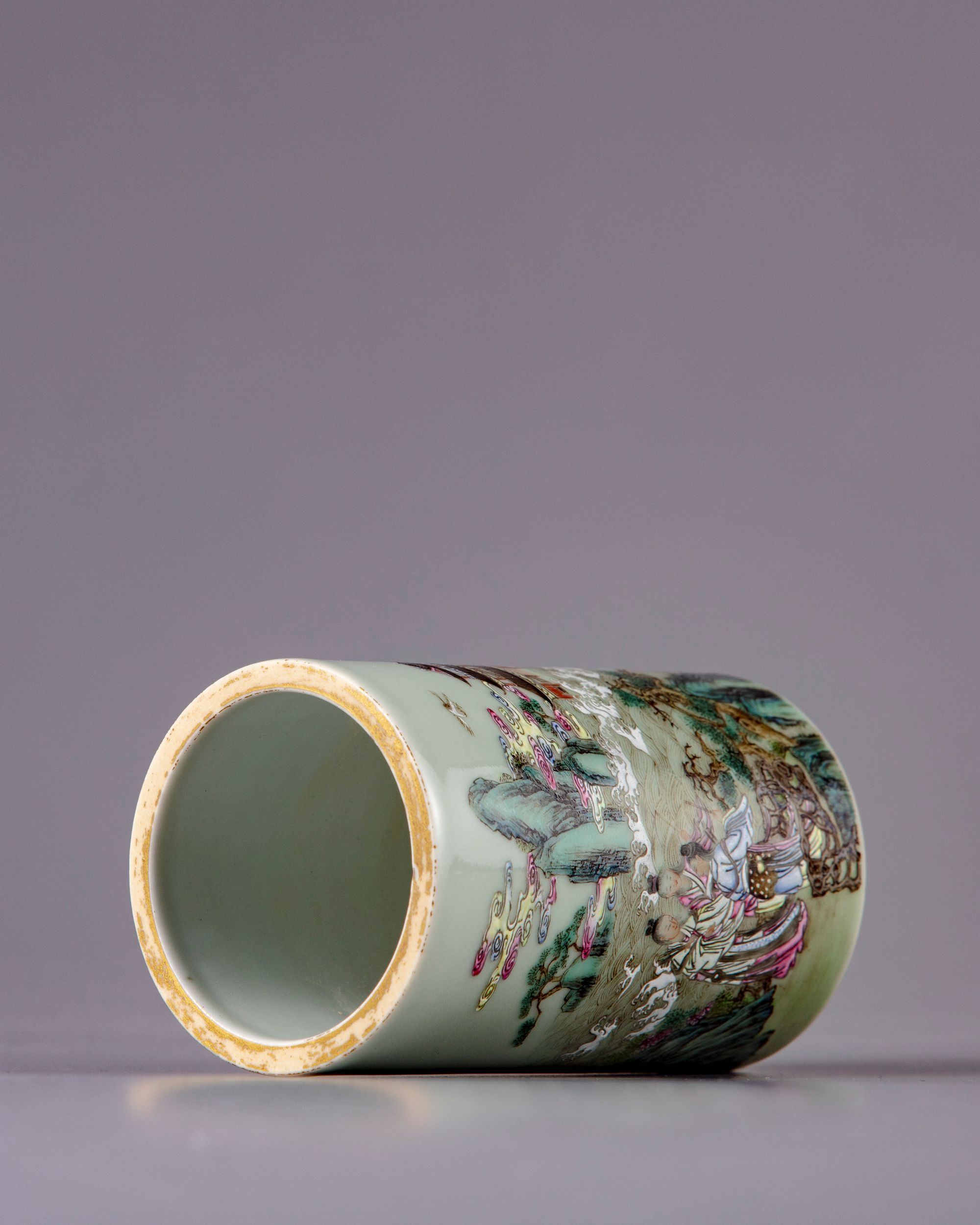 The brush pot is decorated with three ladies standing beside rocks with a large house in the background in a mountain landscape and waves.
