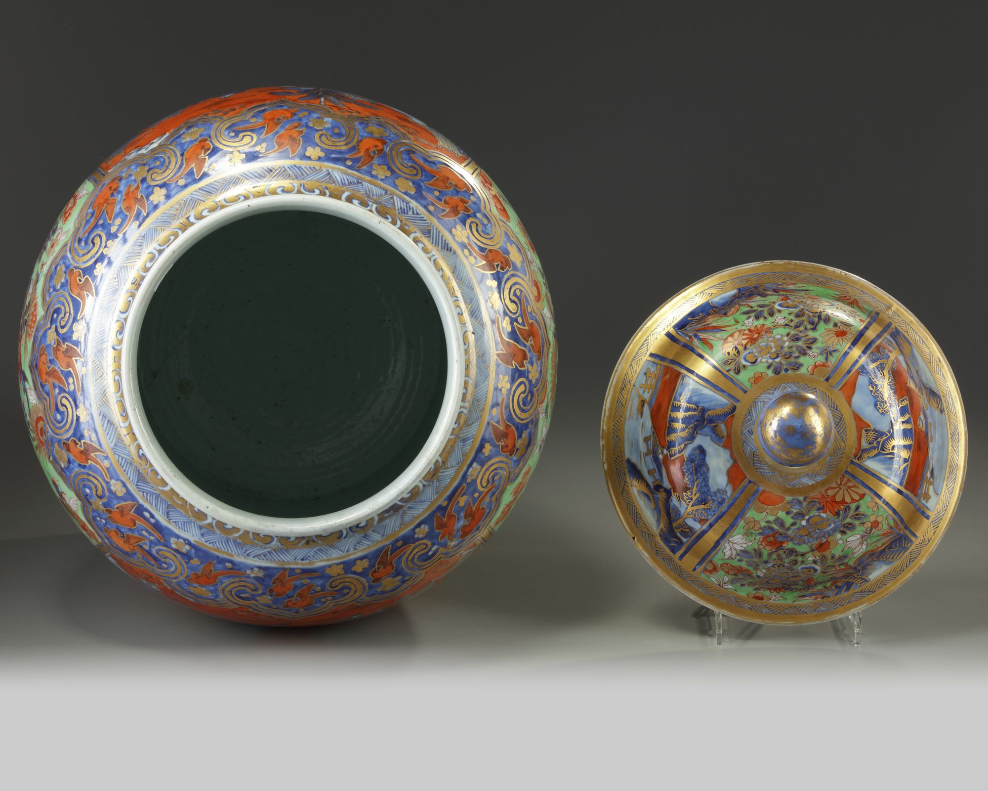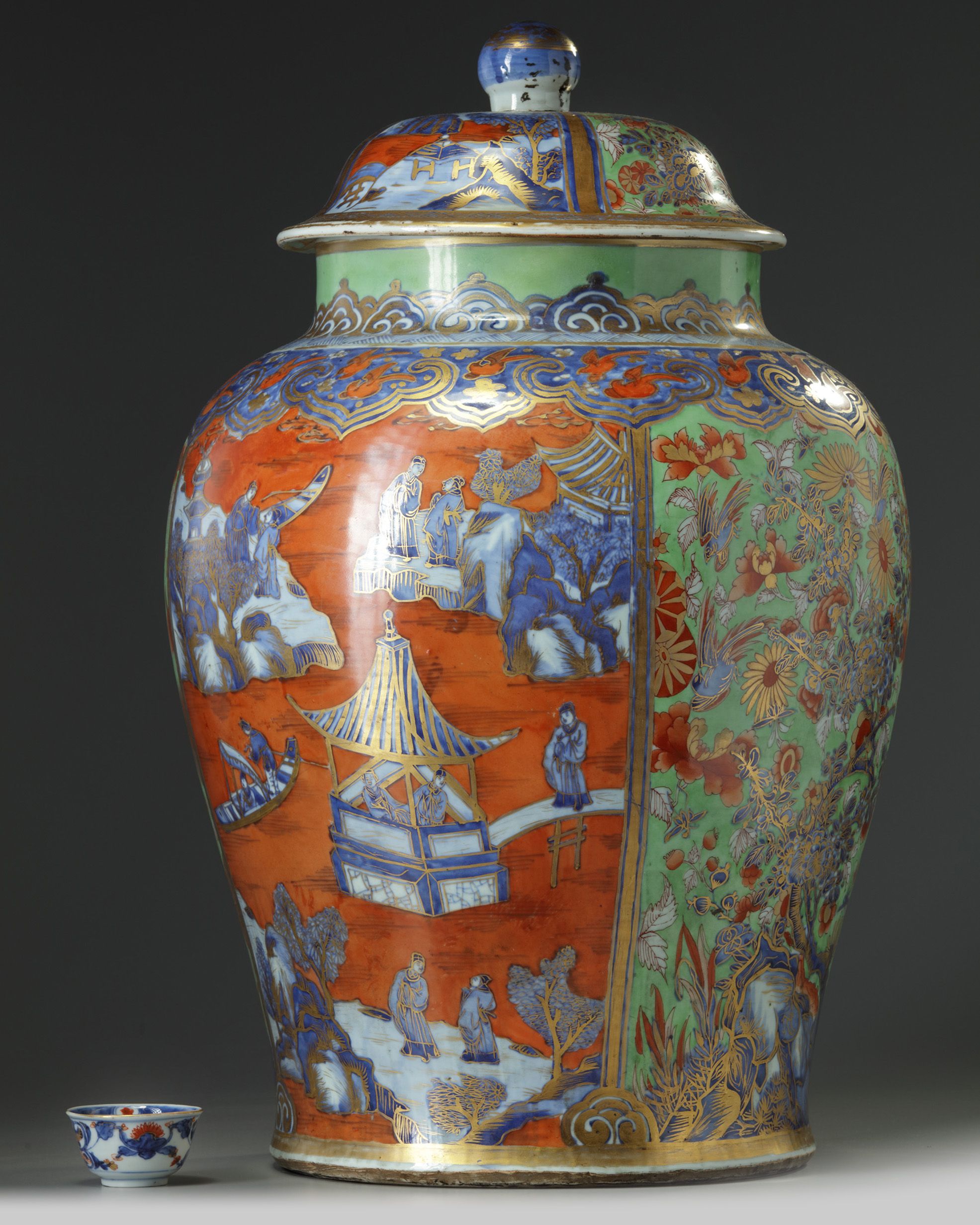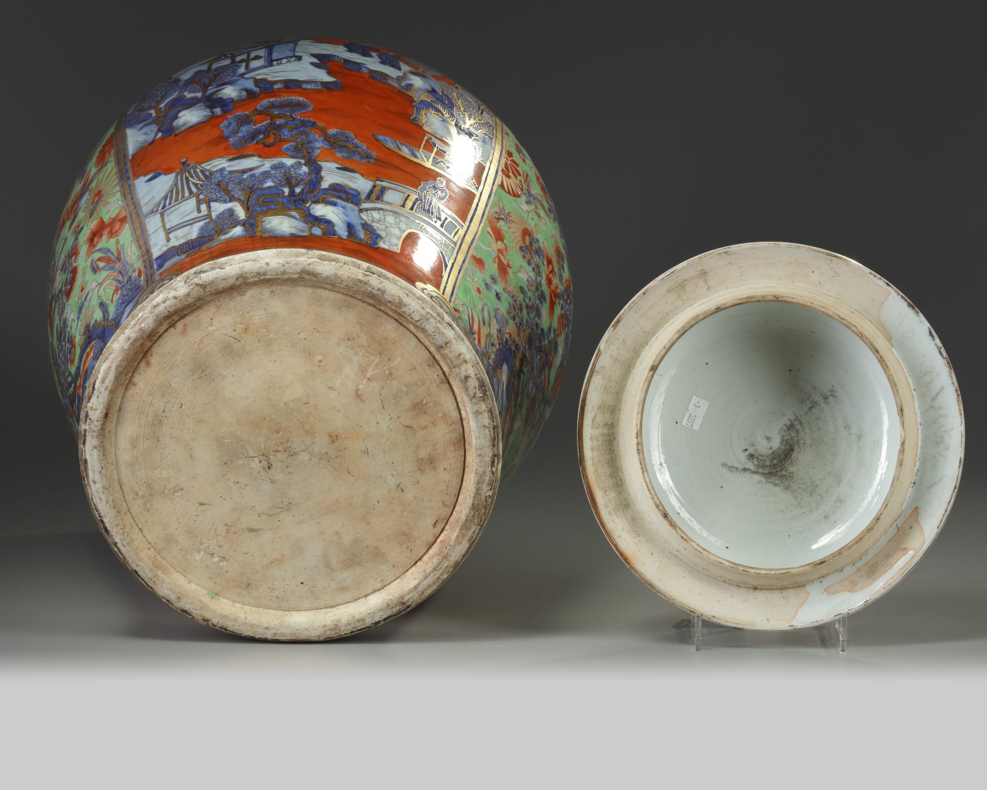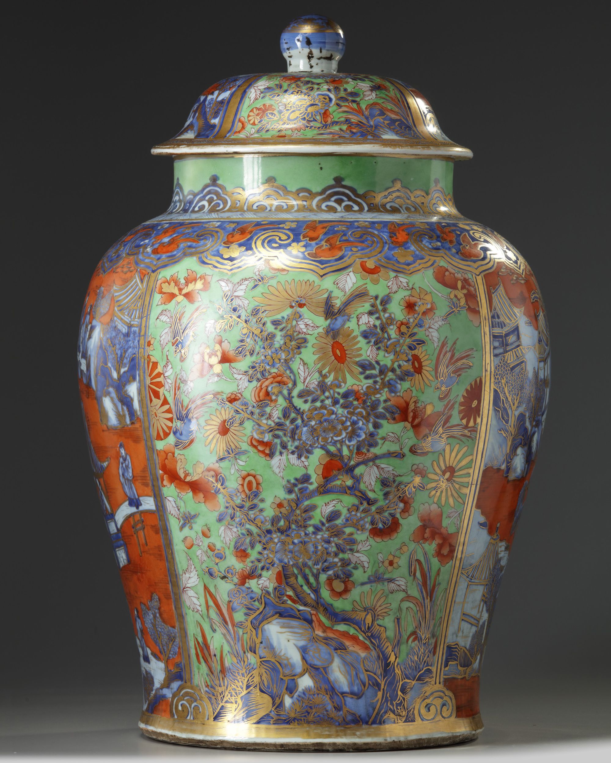 The vase is impressively decorated with two large panels enclosing figure at leisure amongst pavilions and trees, alternating with panels depicting a flowering tree amongst rocks and further flowers, all below a ruyi-head band to the rim and neck. The domed cover is decorated with further alternating flower and landscape panels, all below a lotus bud finial. The design has been embellished with European-enamelling.