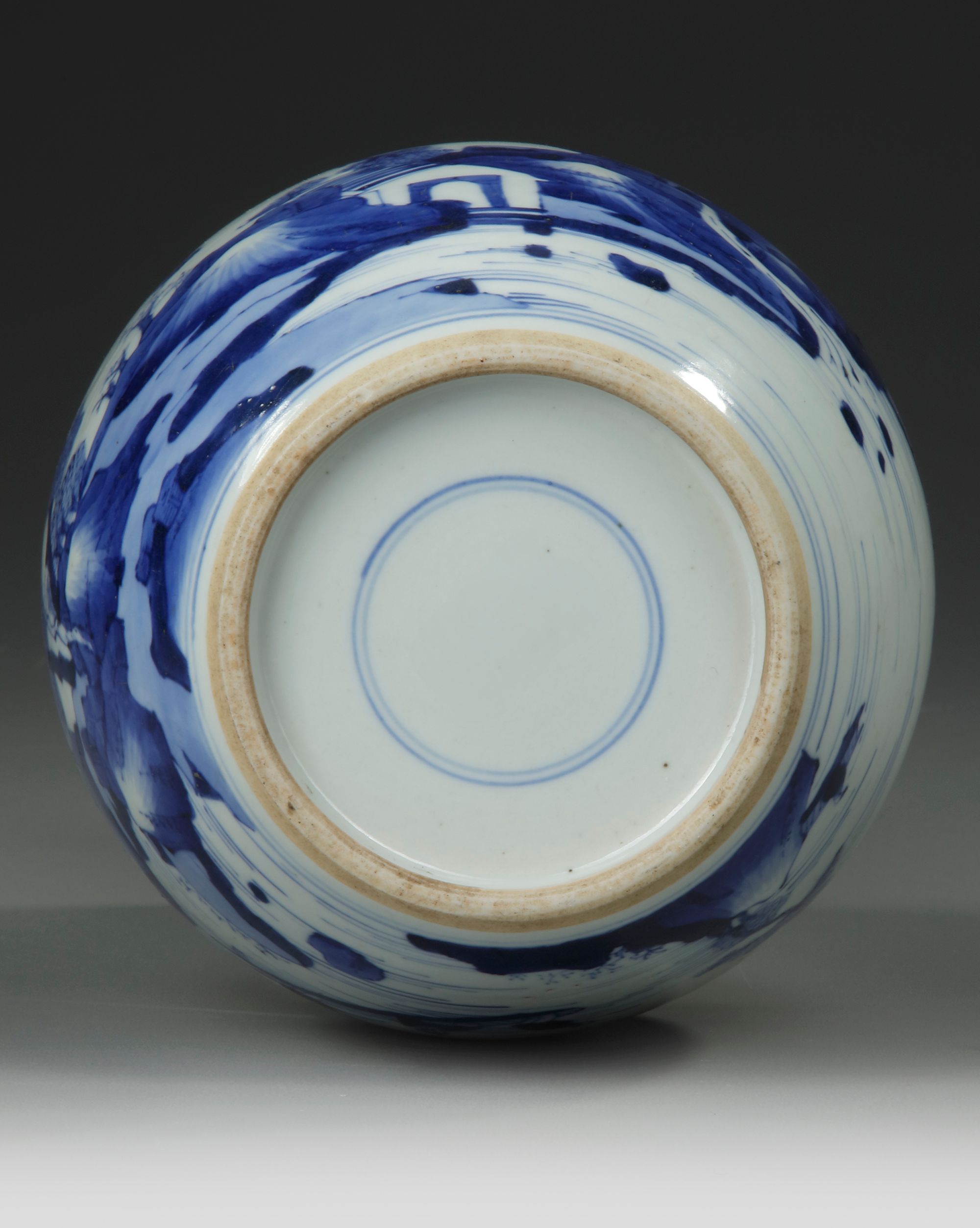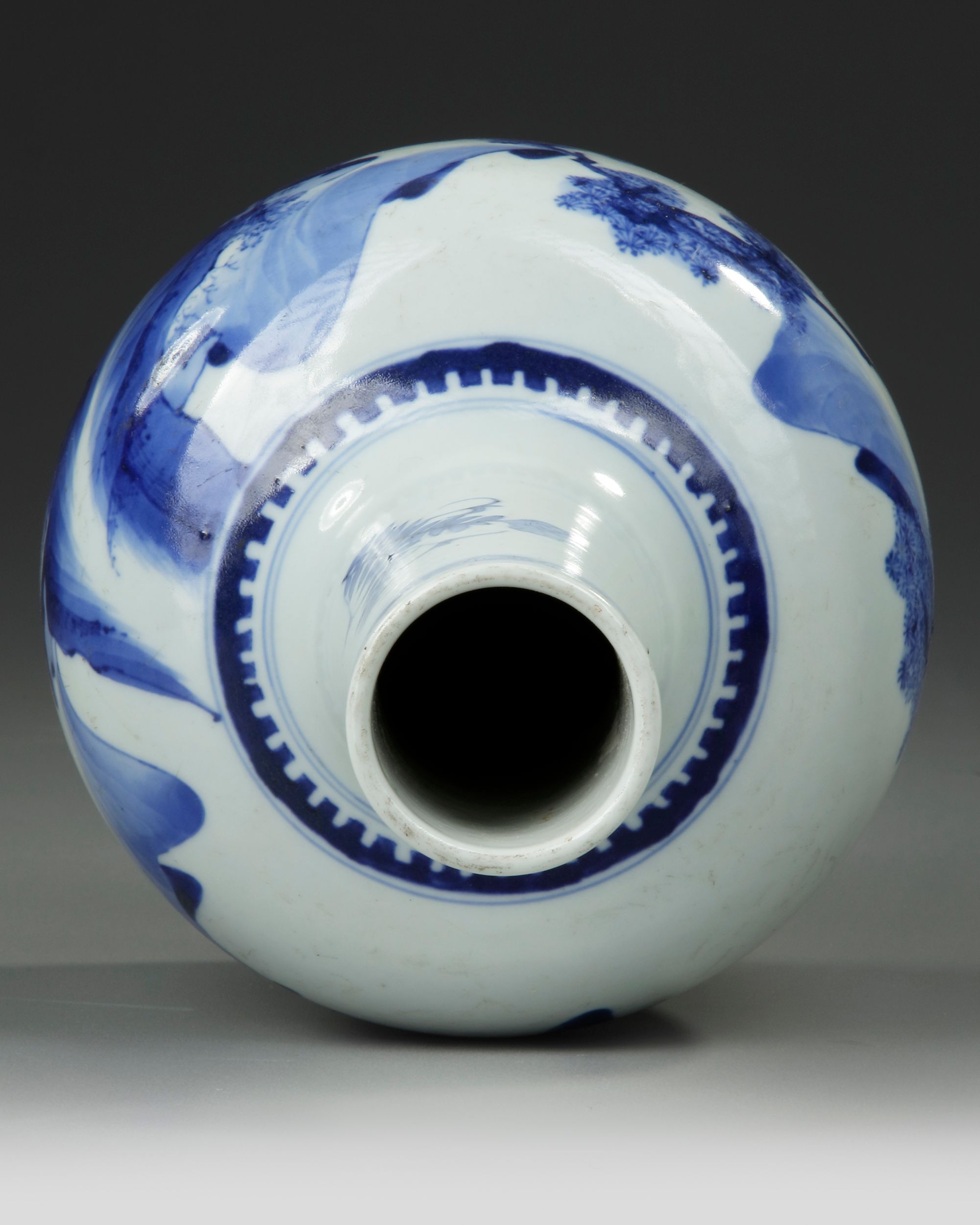 The body decorated with a landscape and figural scene, the neck with flower sprays. The base decorated with a double blue ring. Height 28 cm.