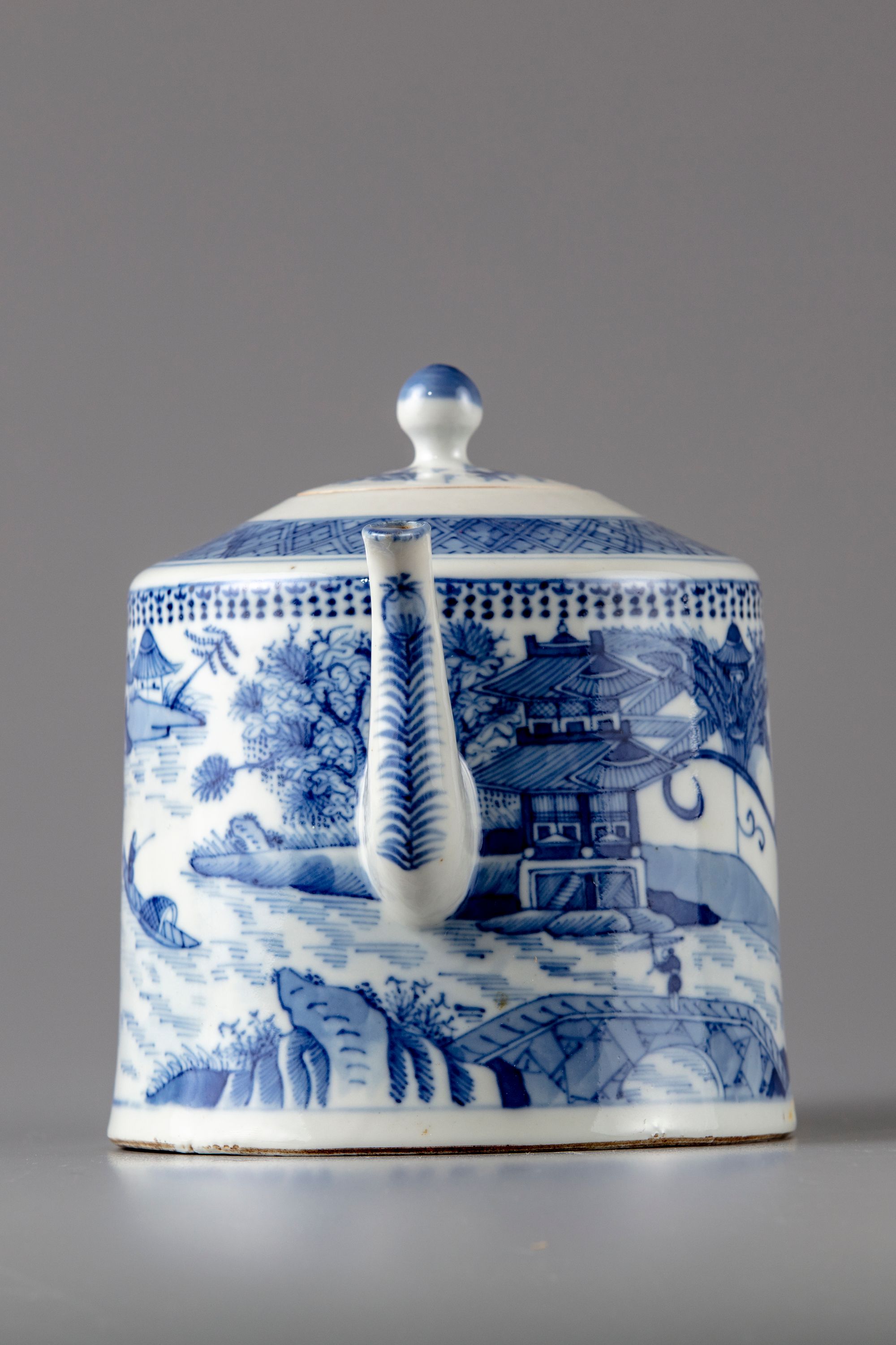 The blue and white teapot is decorated with mulit-level pavilion and with a fisherman on sampan in a river beside houses. 16 cm. height.
