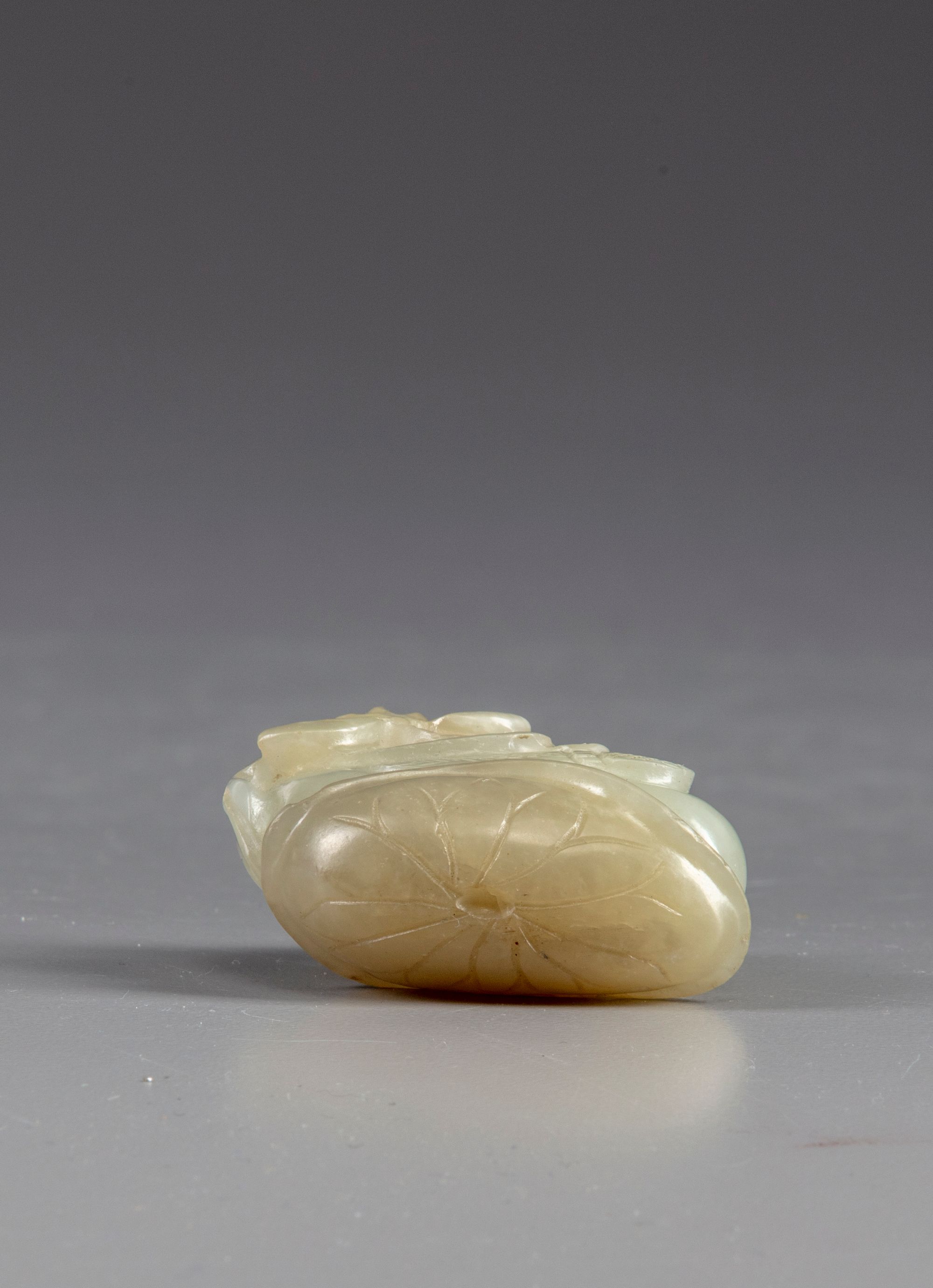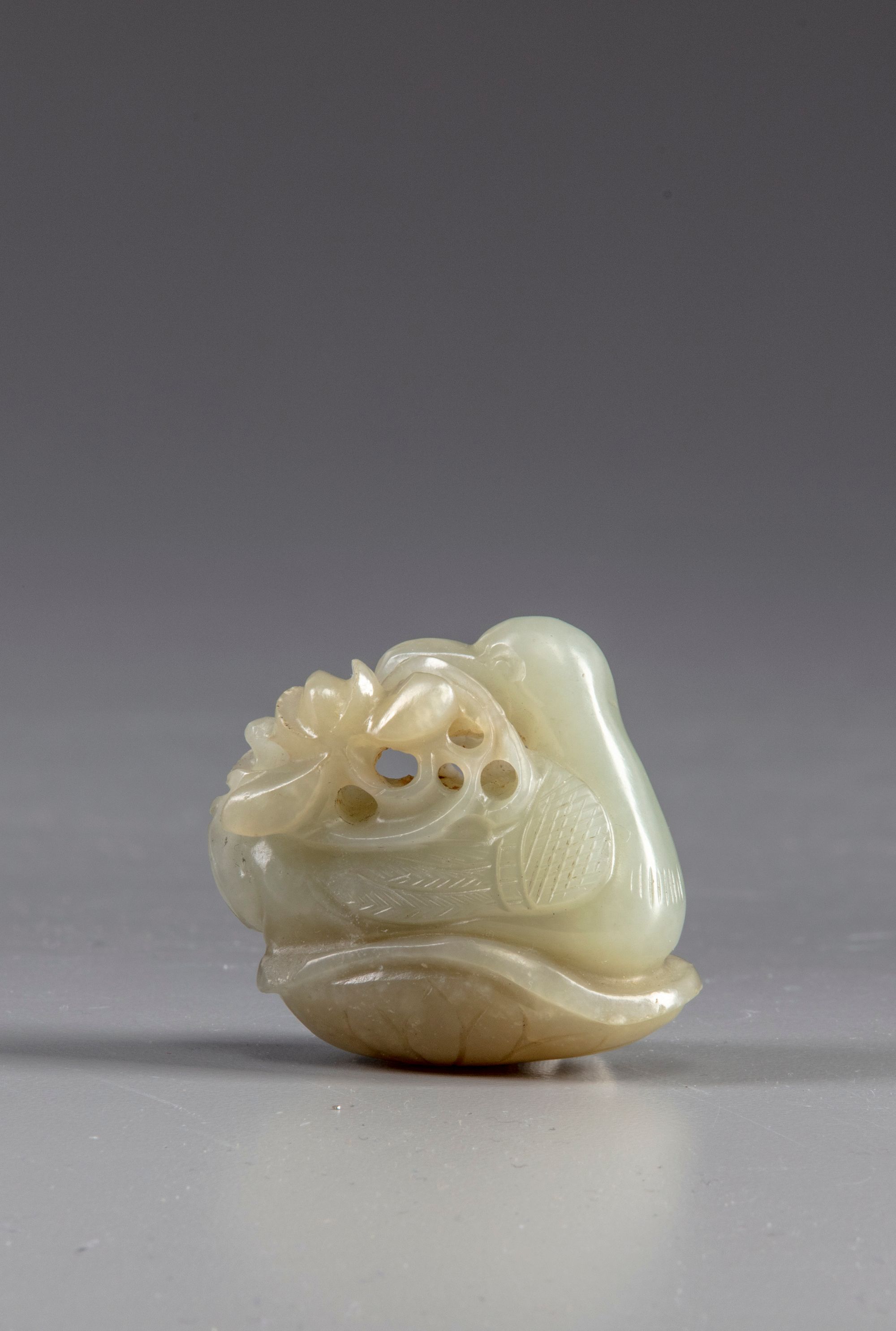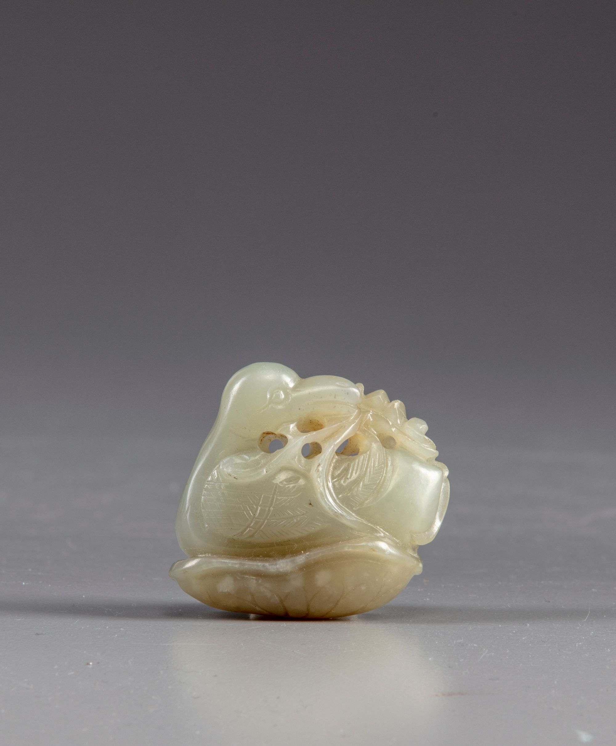The piece is carved in the round as a duck with its wings folded and head turned backwards holding a lotus spray, its stem carved in openwork leading to an upturned leaf supporting the duck. The stone is of a pale celadon tone with light russet tinges to on the leaf.