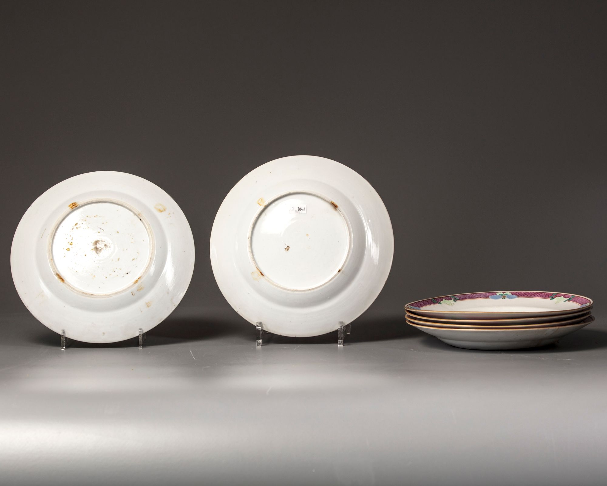 Each plate is decorated to the centre with flower sprays surrounded by a gilt chain-link band. Each rim is decorated with a patterned puce-enamelled border with alternating butterflies and pomegranates.