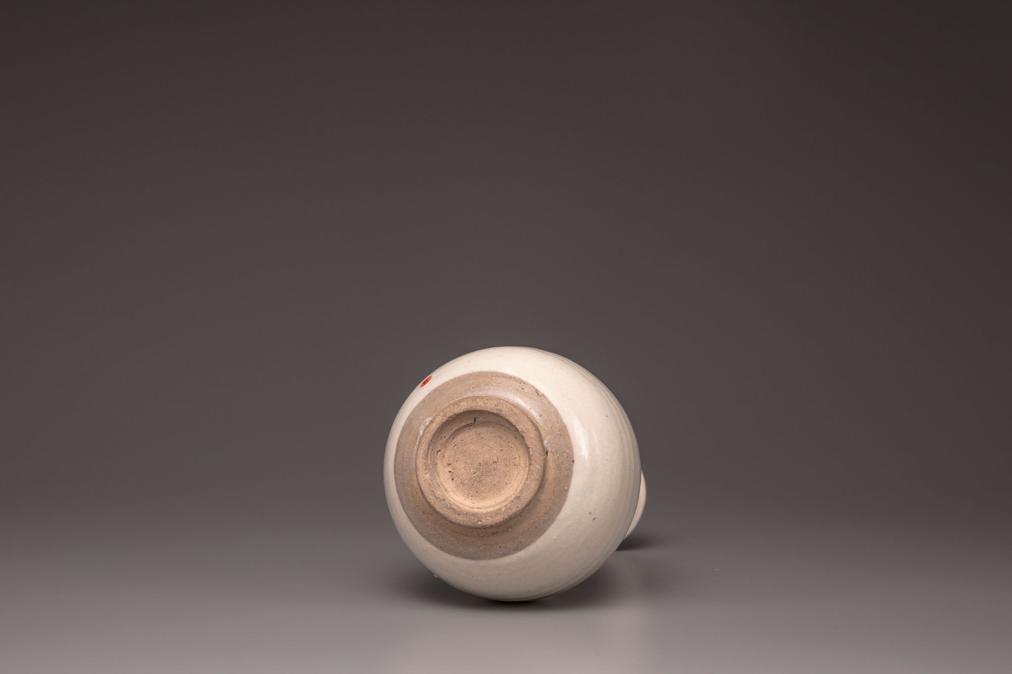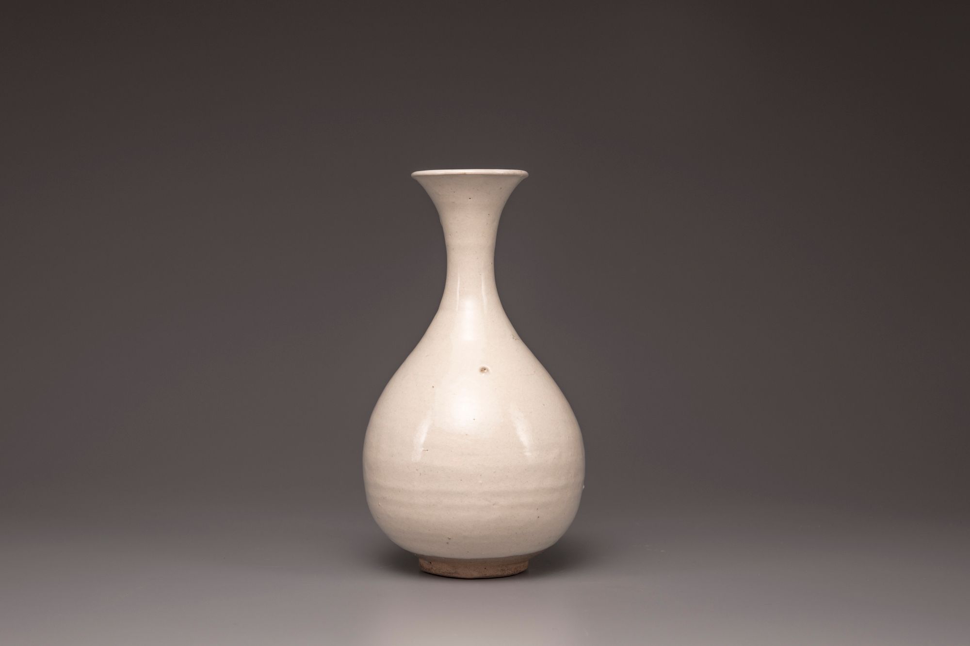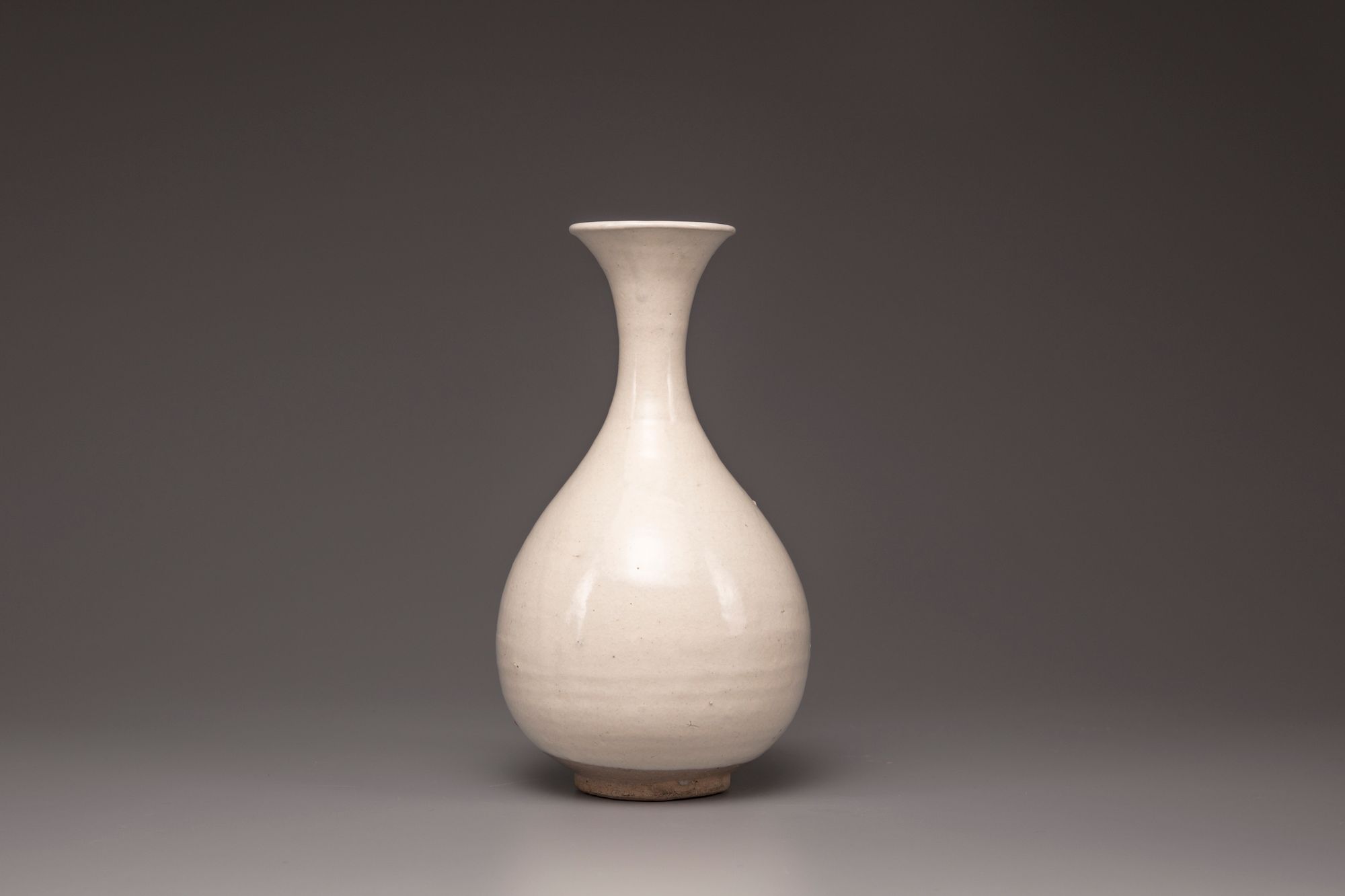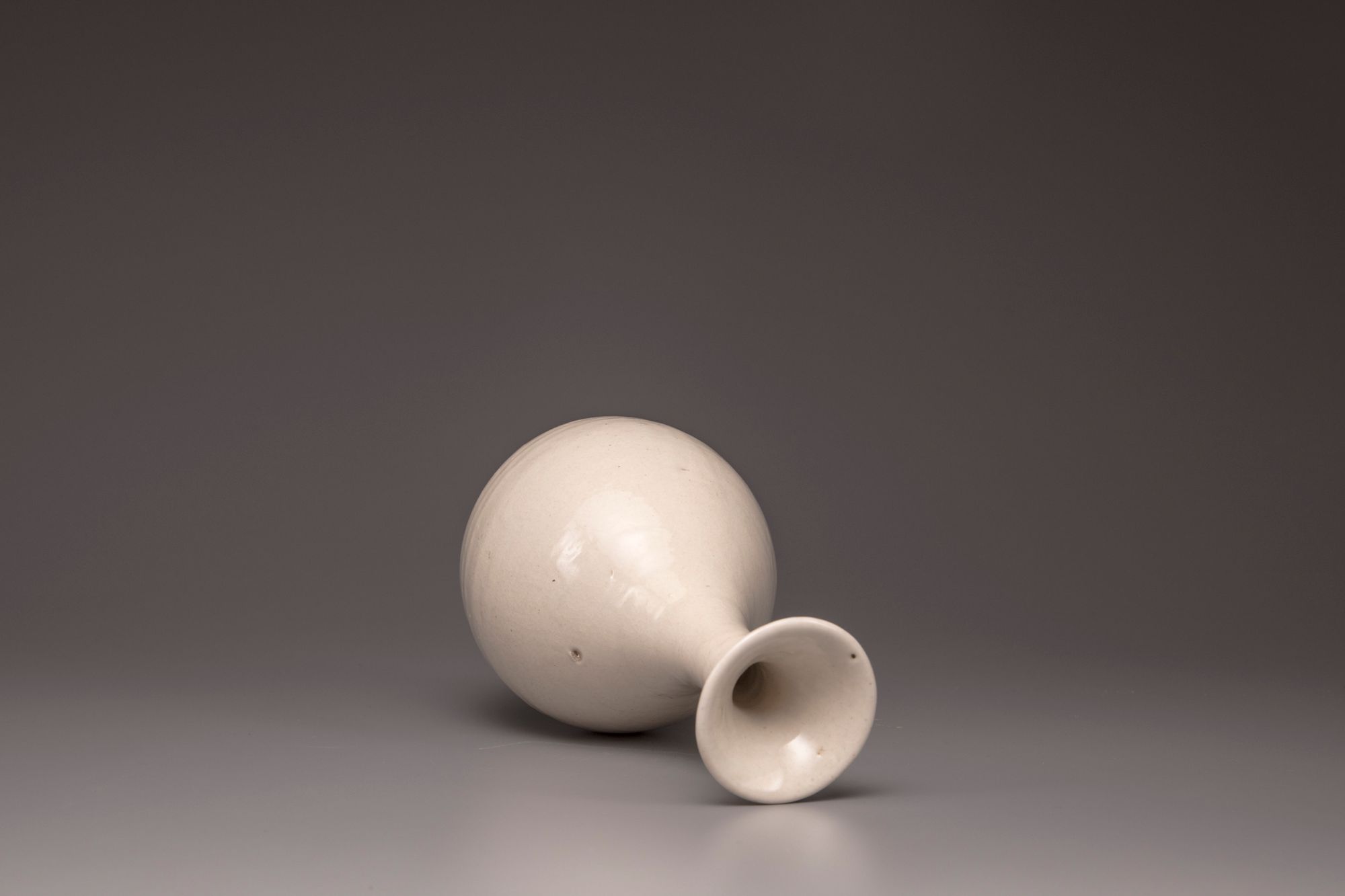 The vase is elegantly potted with a short foot rising to a slender neck and flared rim. It is covered with a cream glaze that continues inside the neck, and stops just above the unglazed foot exposing the buff body.