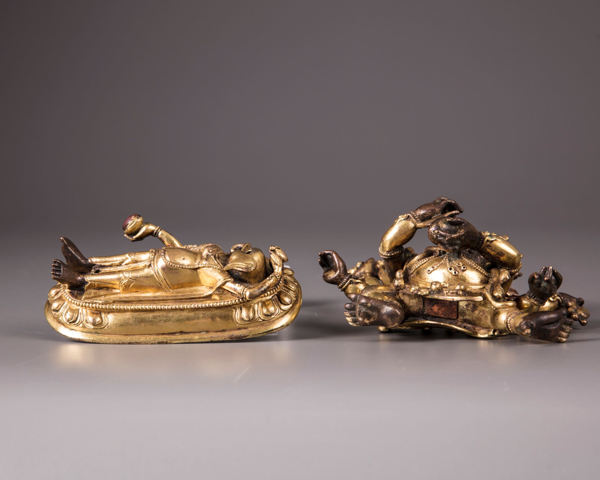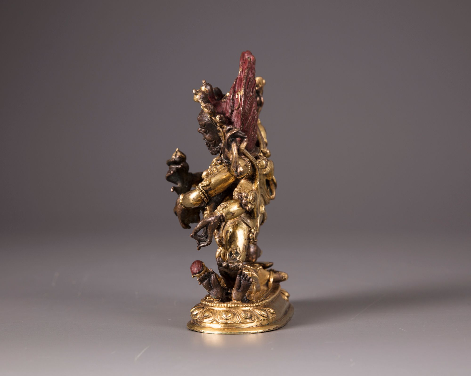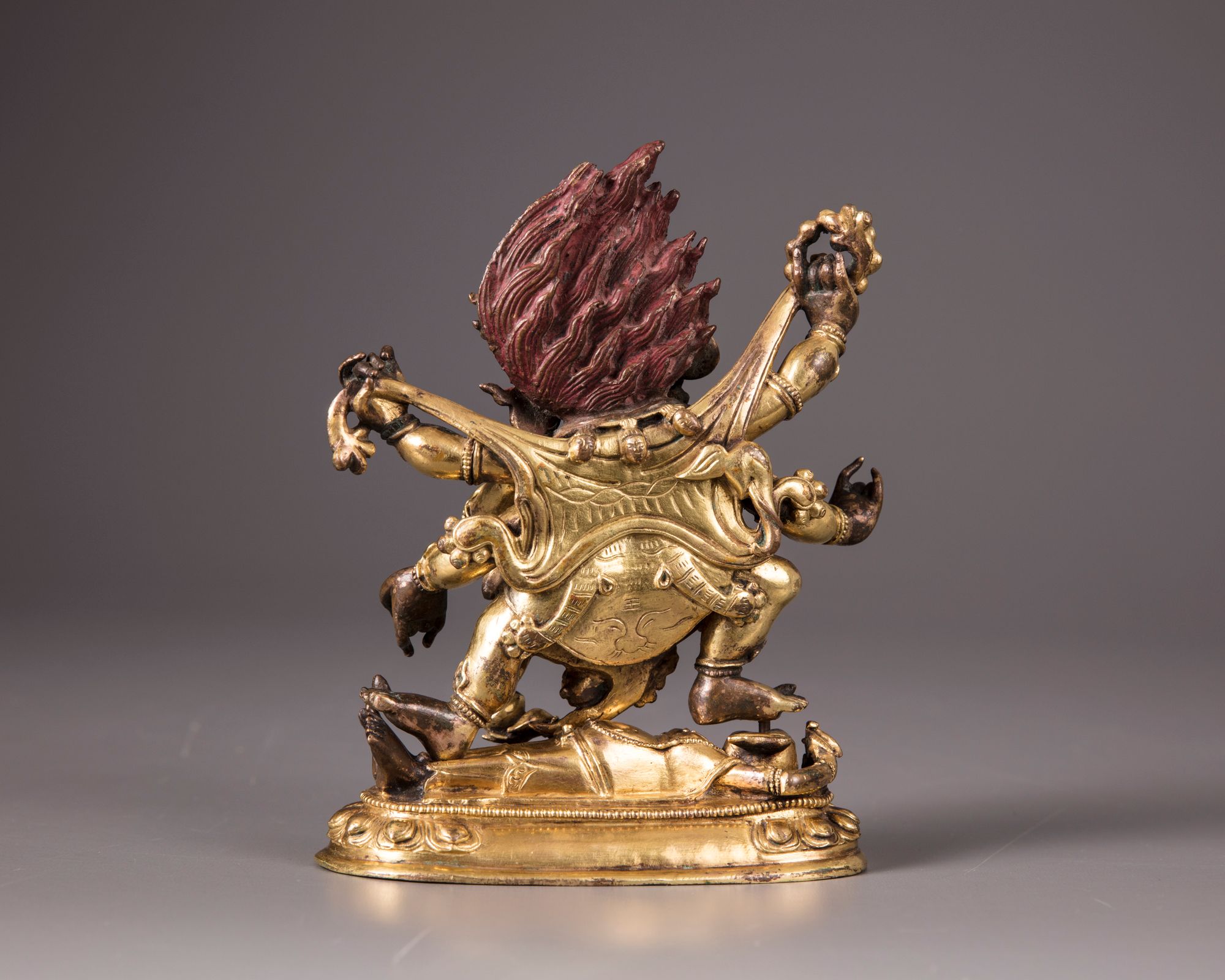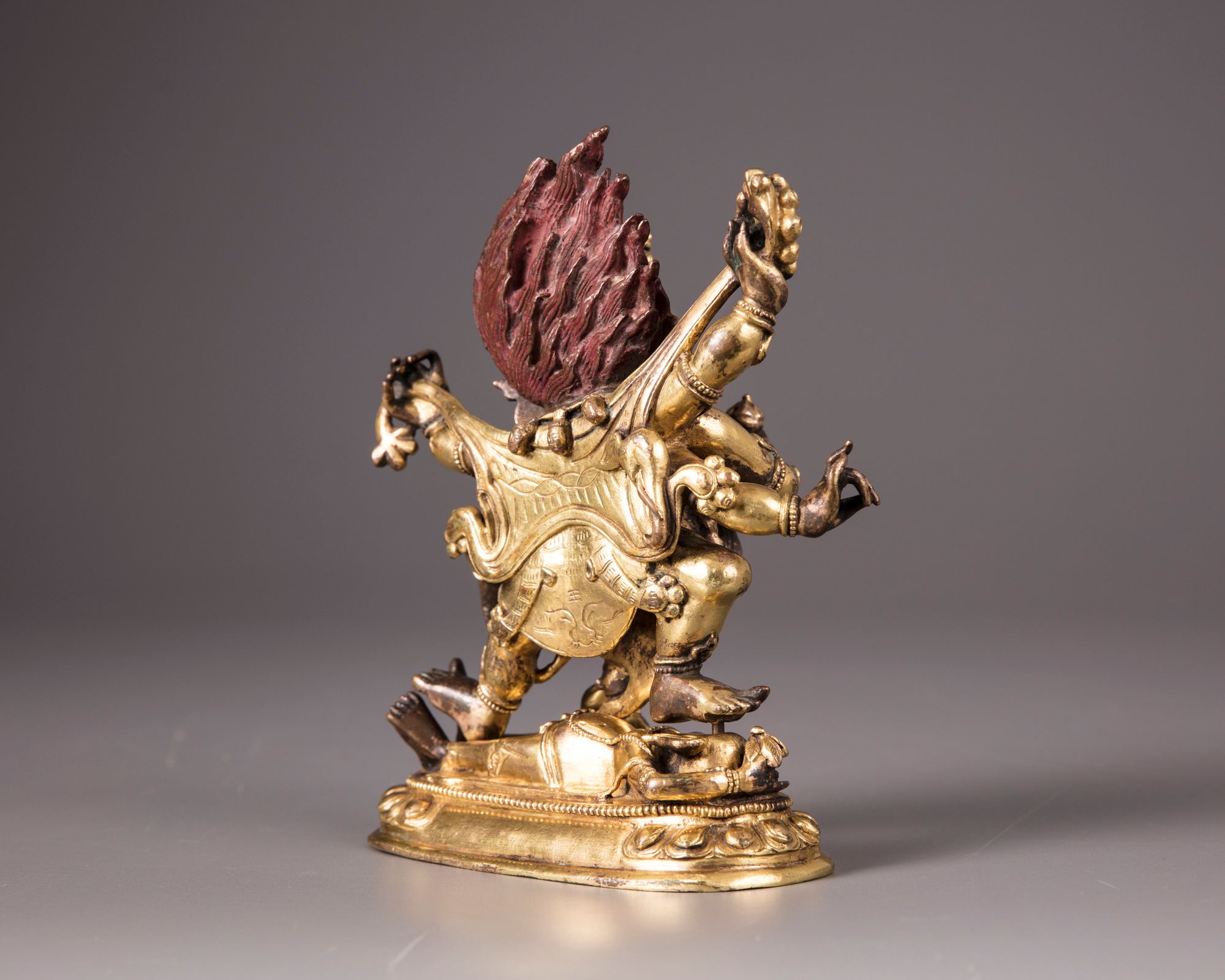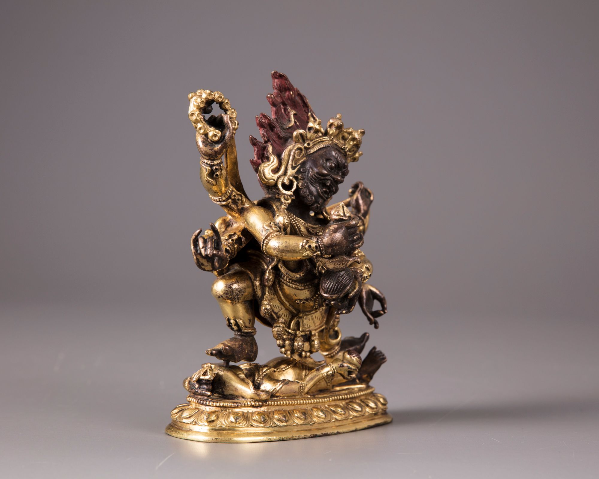 The fierce six-armed guardian figure is cast with his four arms outstretched and two arms in front of him, all either holding an implement or in a mudra. The figure is dressed in a tiger skin with a garland of skulls hanging from the waist. With pigment highlights to the hair. The figure is striding in alidhasana on top of the elephant-headed Vignataka which forms the base of the figure.