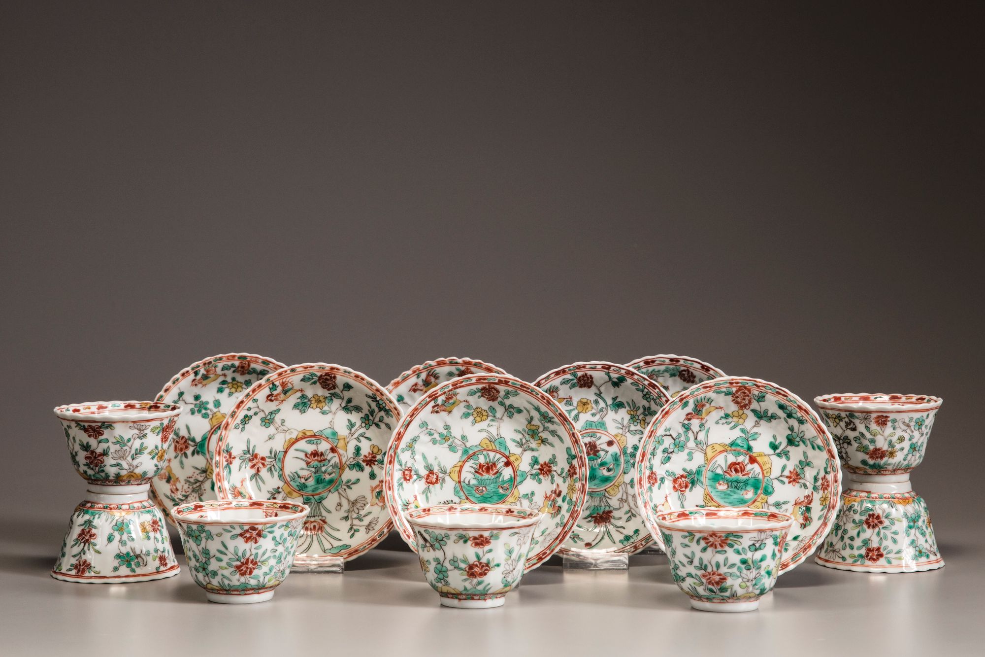 Condition: one saucer with a glaze flaw to the interior; minor chips to the feet; wear to the enamel.