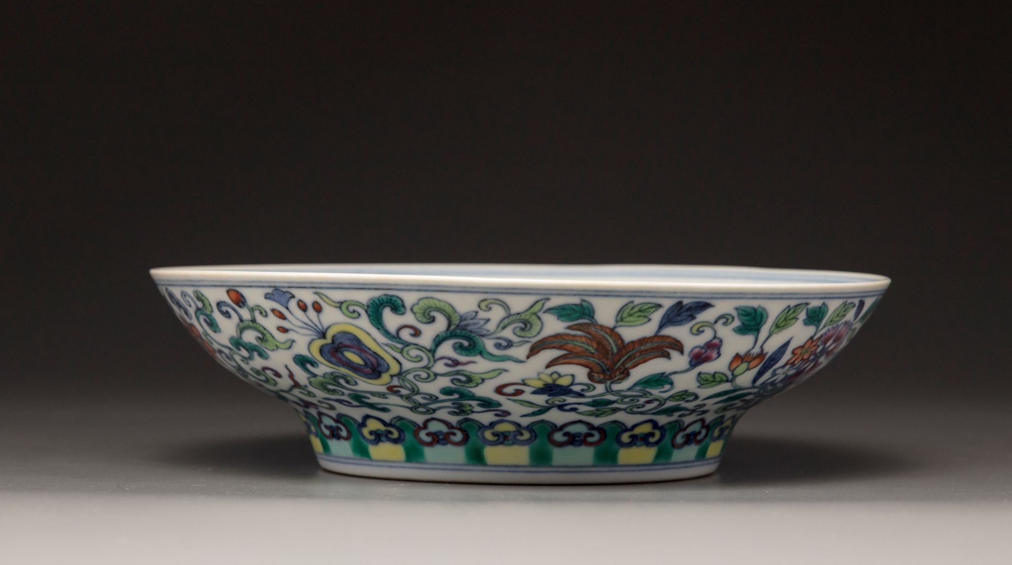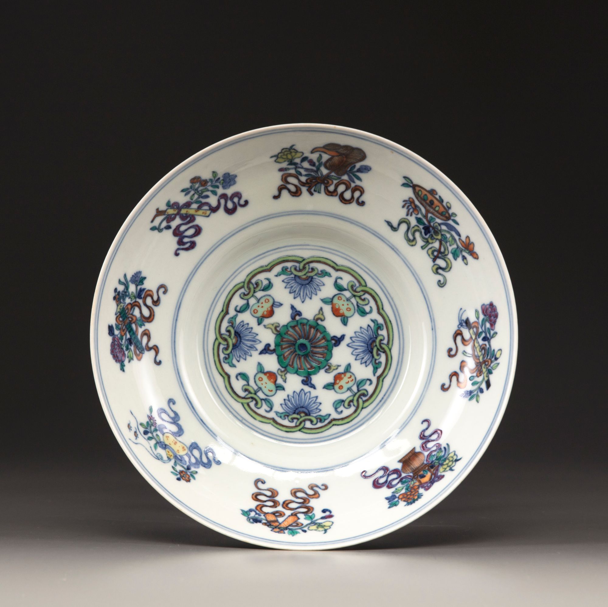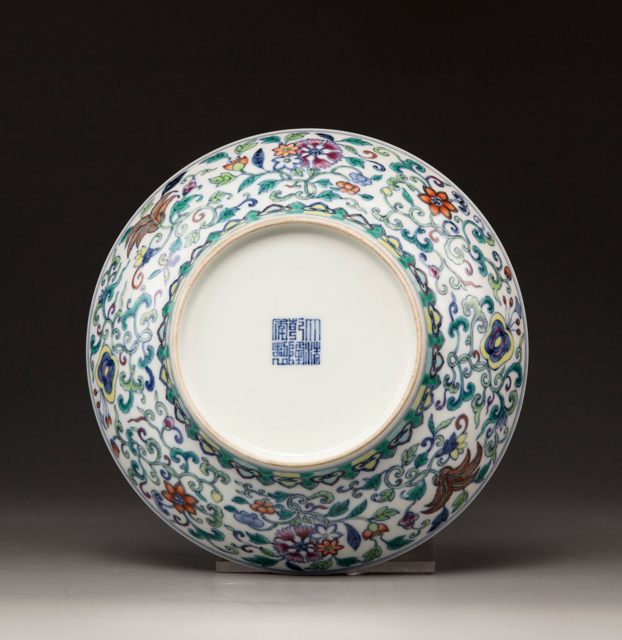 The bowl of ogee form rising from a tapered foot, the interior with a flat central well decorated with an interlinked scroll border enclosing a swirled roundel issuing alternating yellow and blue flames, surrounded by four peaches born on the leafy scroll border, the cavetto finely decorated with the anbaxian emblems, each accentuated with billowing ribbons, the exterior brightly decorated with eight stylised floral blooms borne on undulating leafy scrolls above a border of ruyi-heads alternating with upright lappets, the base inscribed in underglaze blue with a six-character Qianlong seal mark.