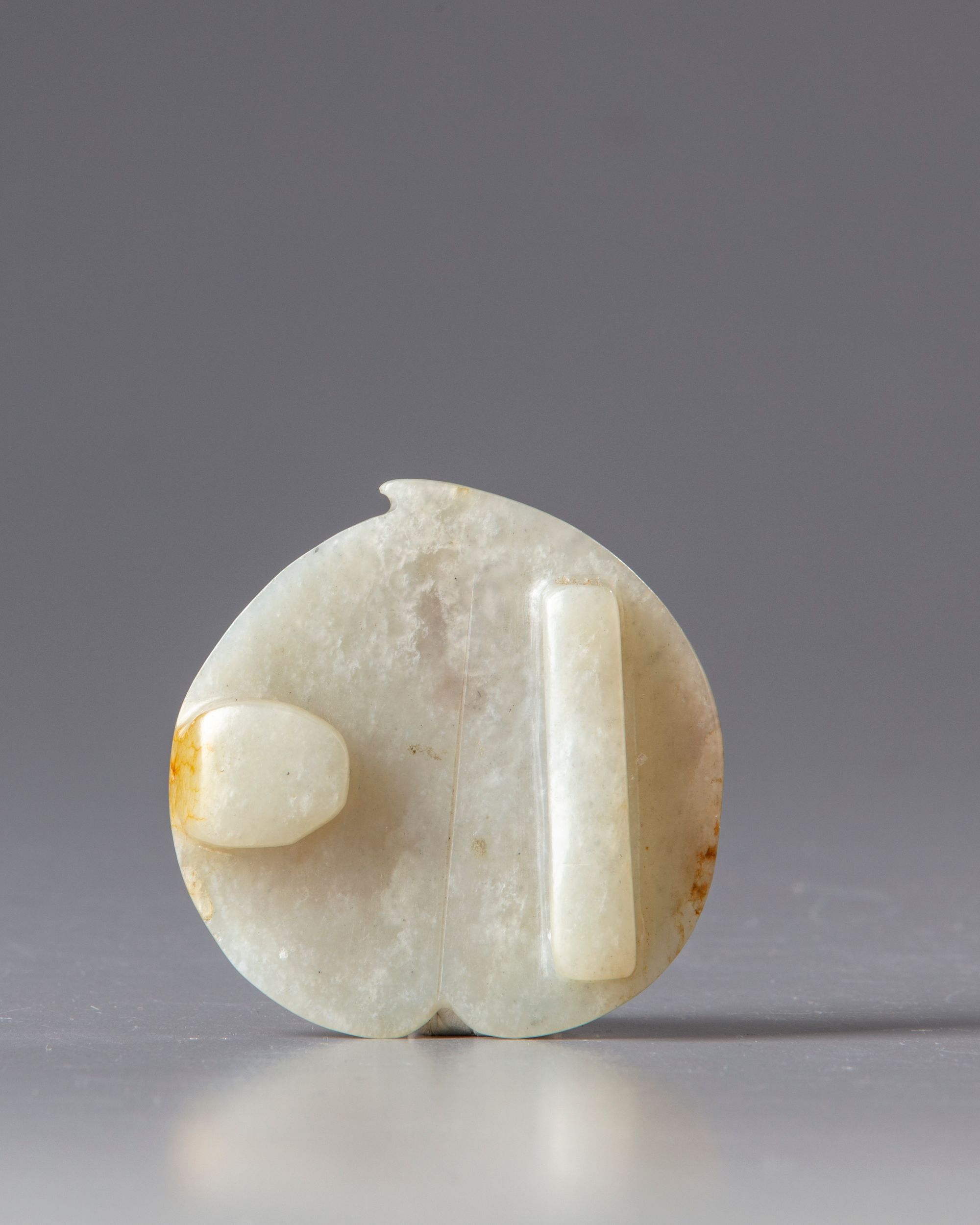 The buckle is smoothly shaped as a peach, the underside with a hook and rectangular aperture. The stone is of a pale tone with russet inclusions.
