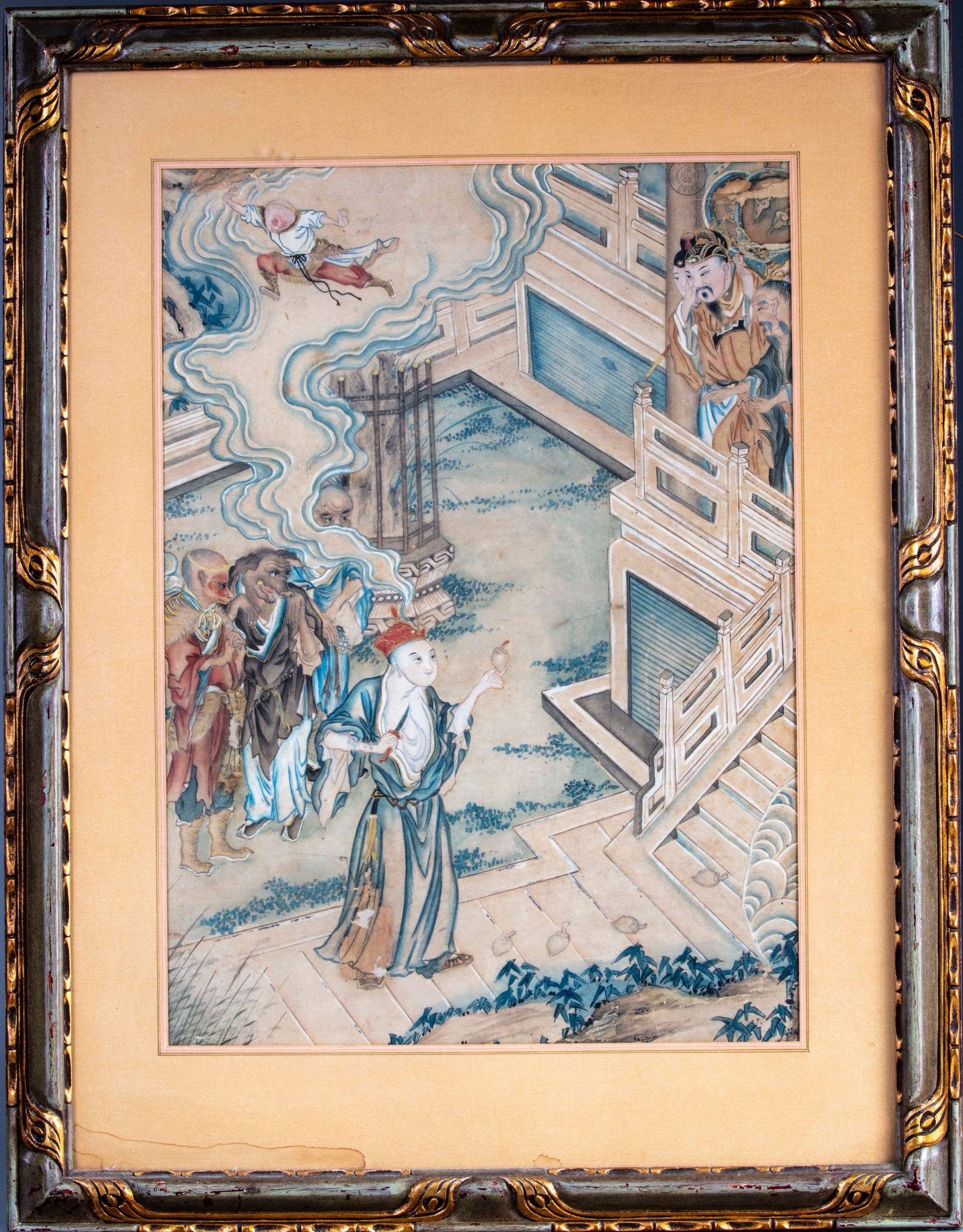 A Chinese painting depicting the eight immortals watching one of them, three one them from a terrace, framed and glazed.