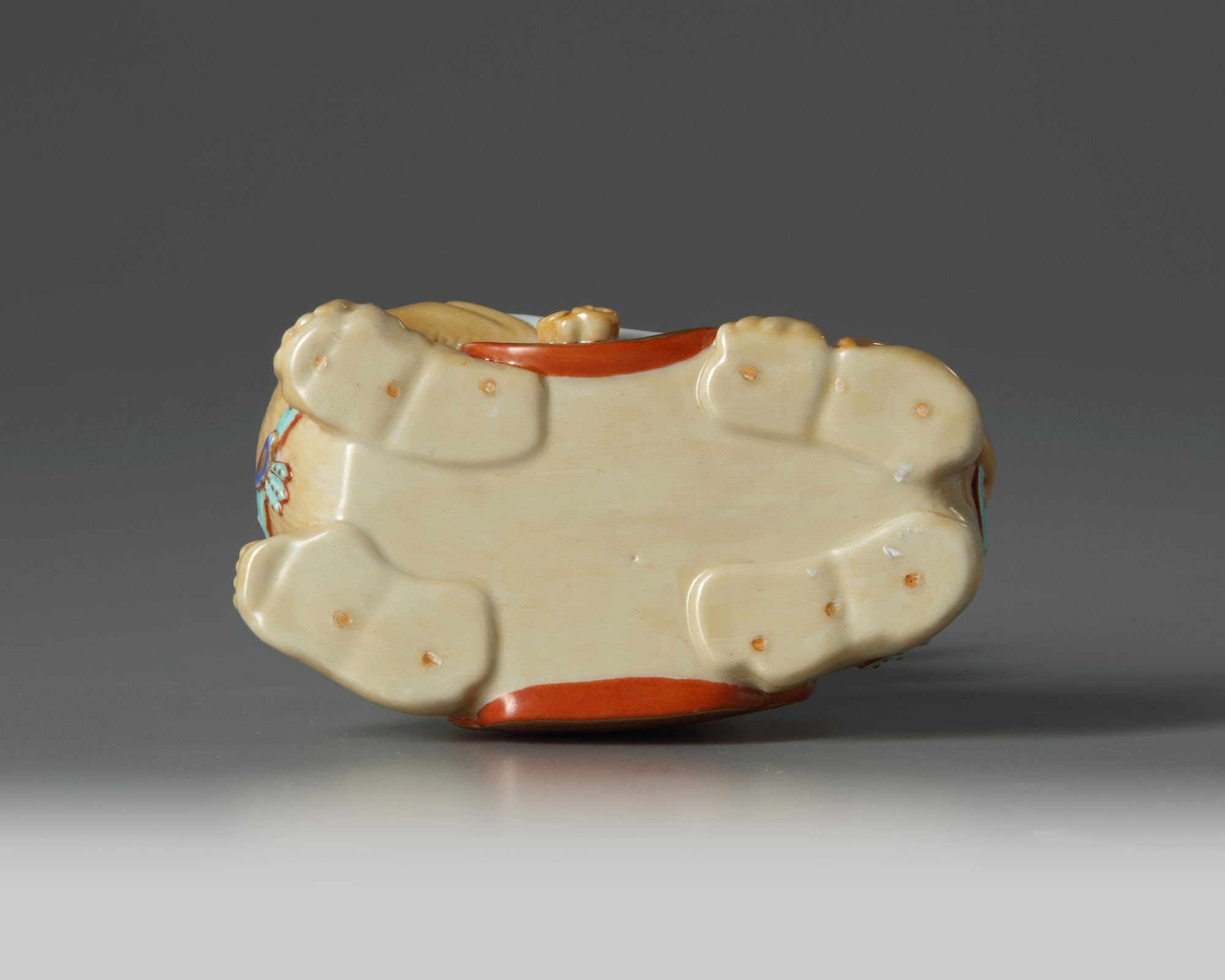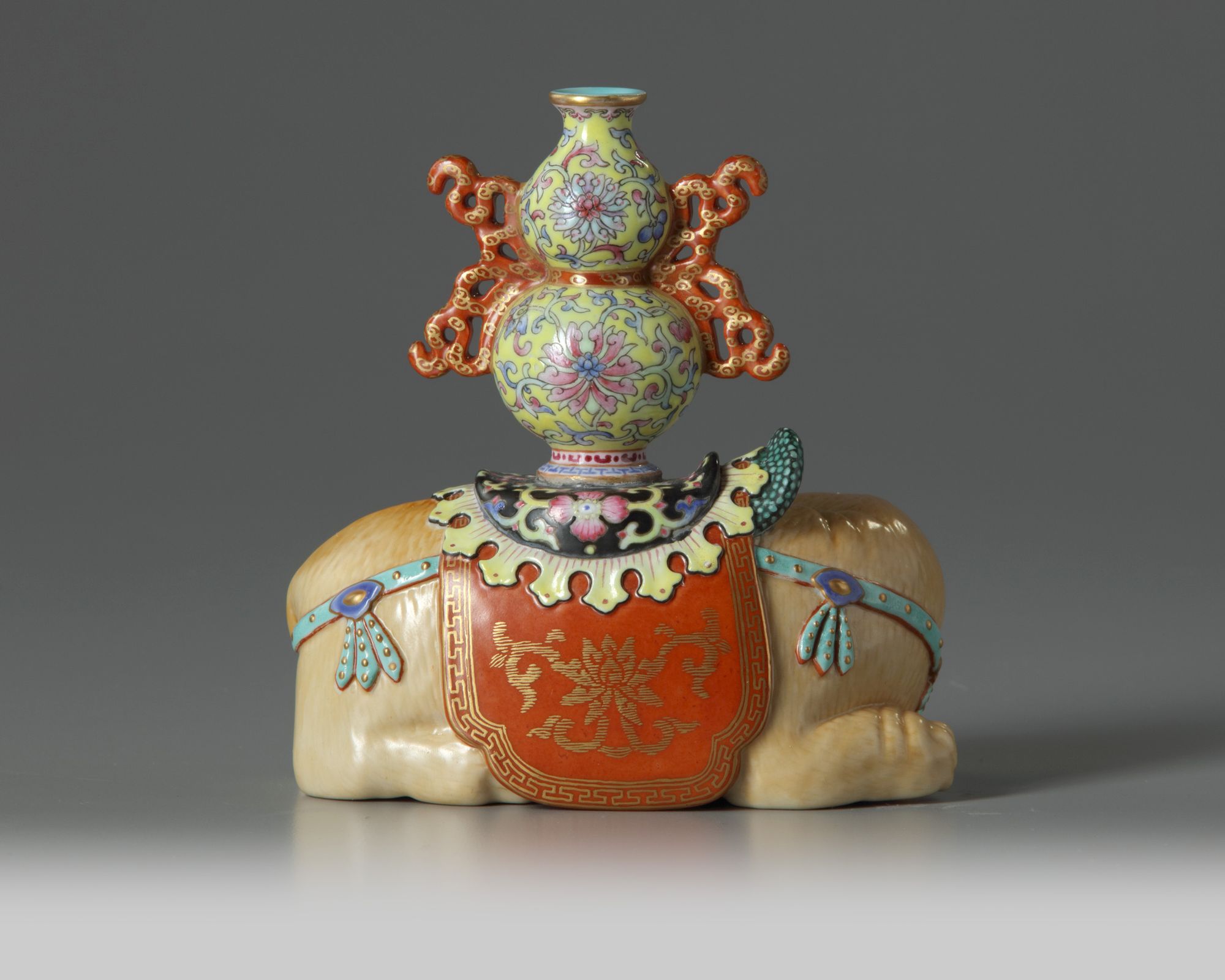 The elephant is modelled with its head turned to one side, it is fitted with a saddle which holds a double gourd vase.
