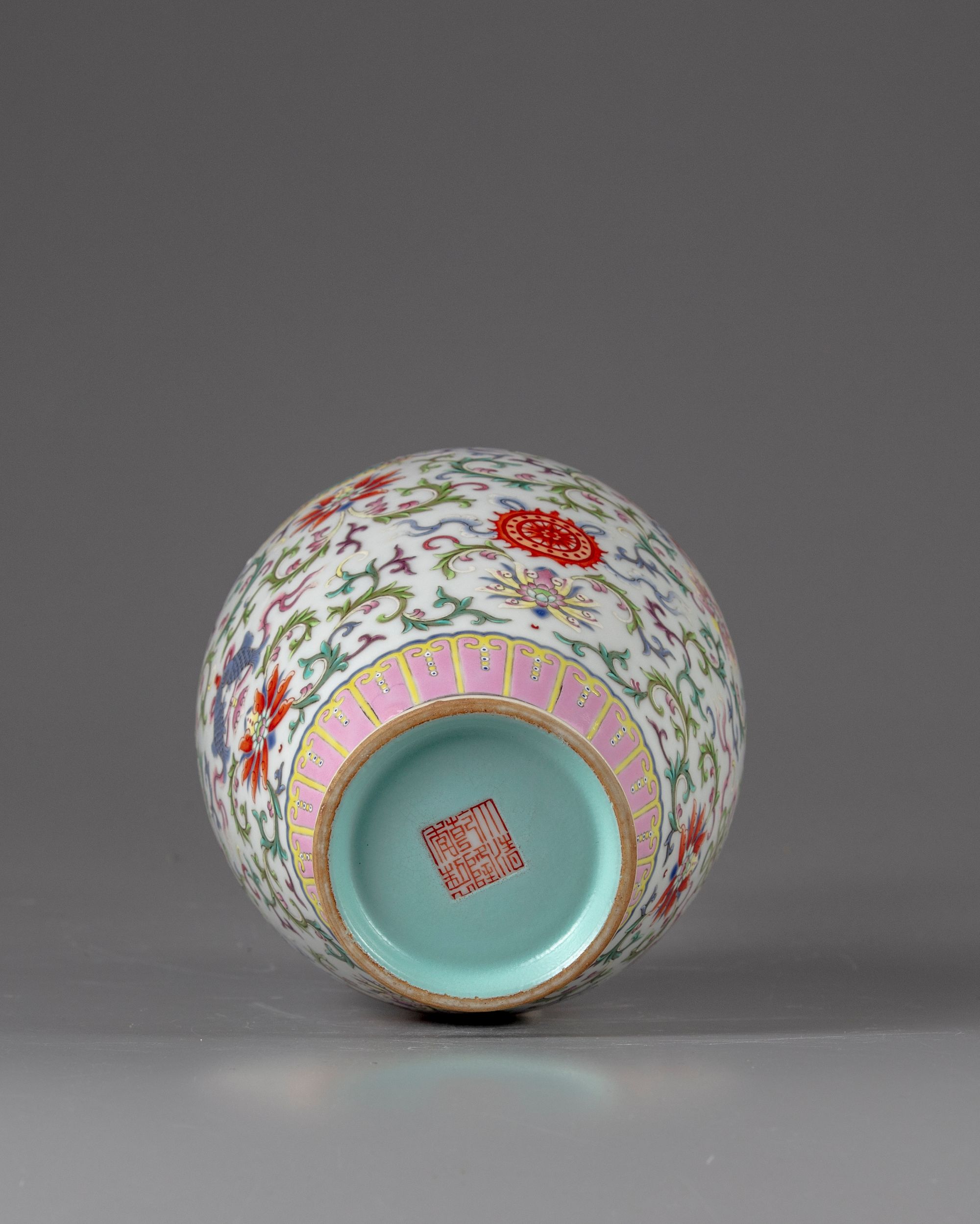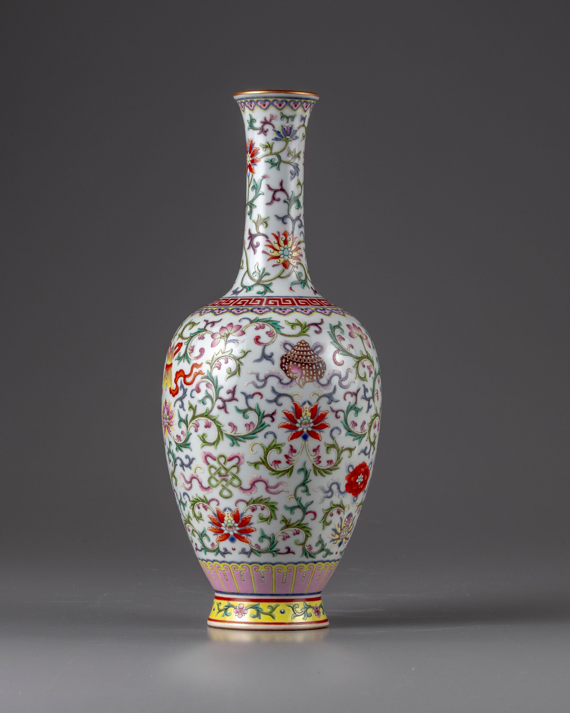The vase is decorated with lotus heads, buds and foliage interpersed with the eight Buddhist emblems, set between a band of ruyi heads and lappet border to the base. The neck is further painted with lotus heads and foliage between ruyi heads and a key fret chain.The bottom with a Qianlong seal mark on a turquoise glazed ground