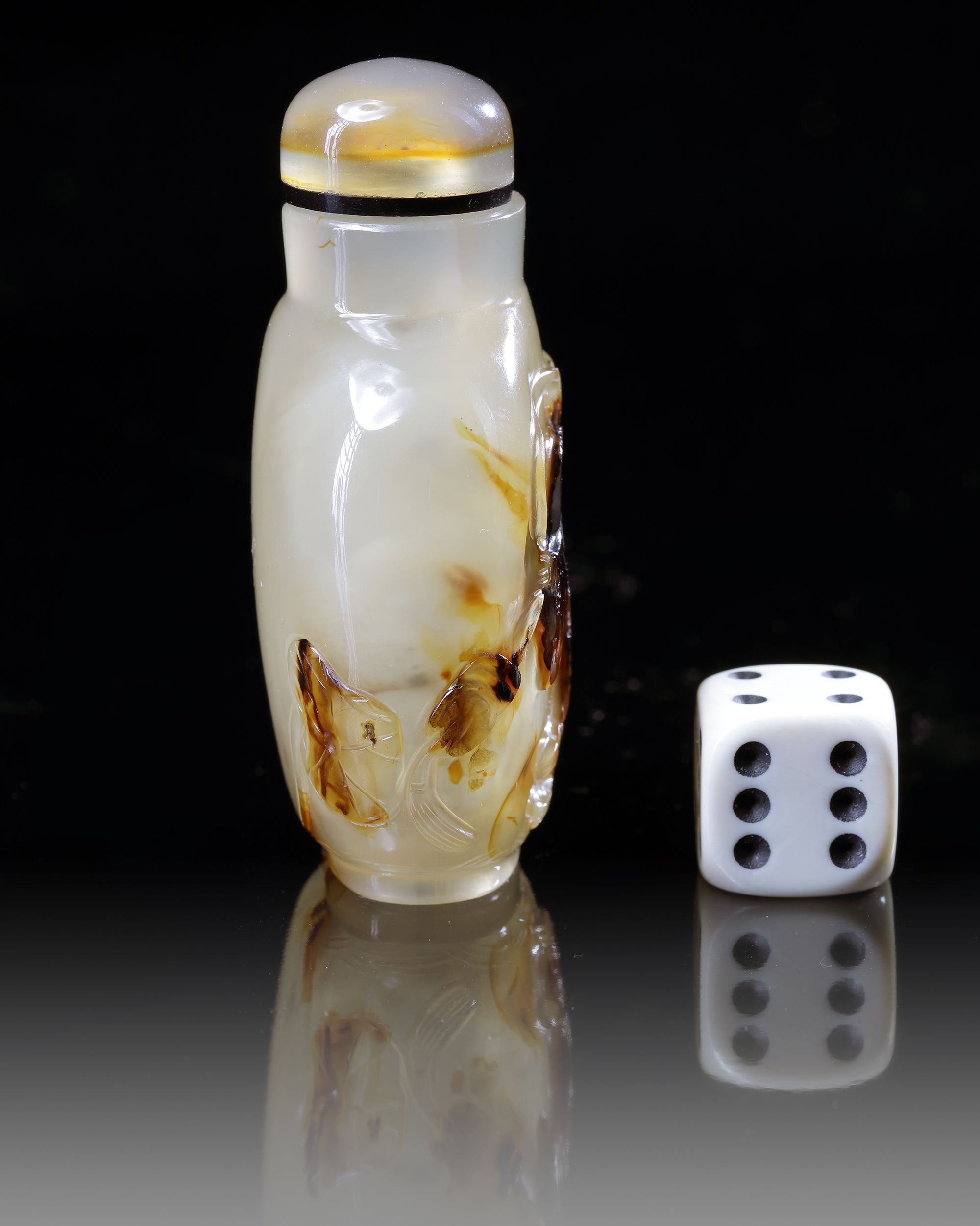 The snuff bottle is carved with Liu Hai holding a string of coins amongst large lotus leaves and buds.
