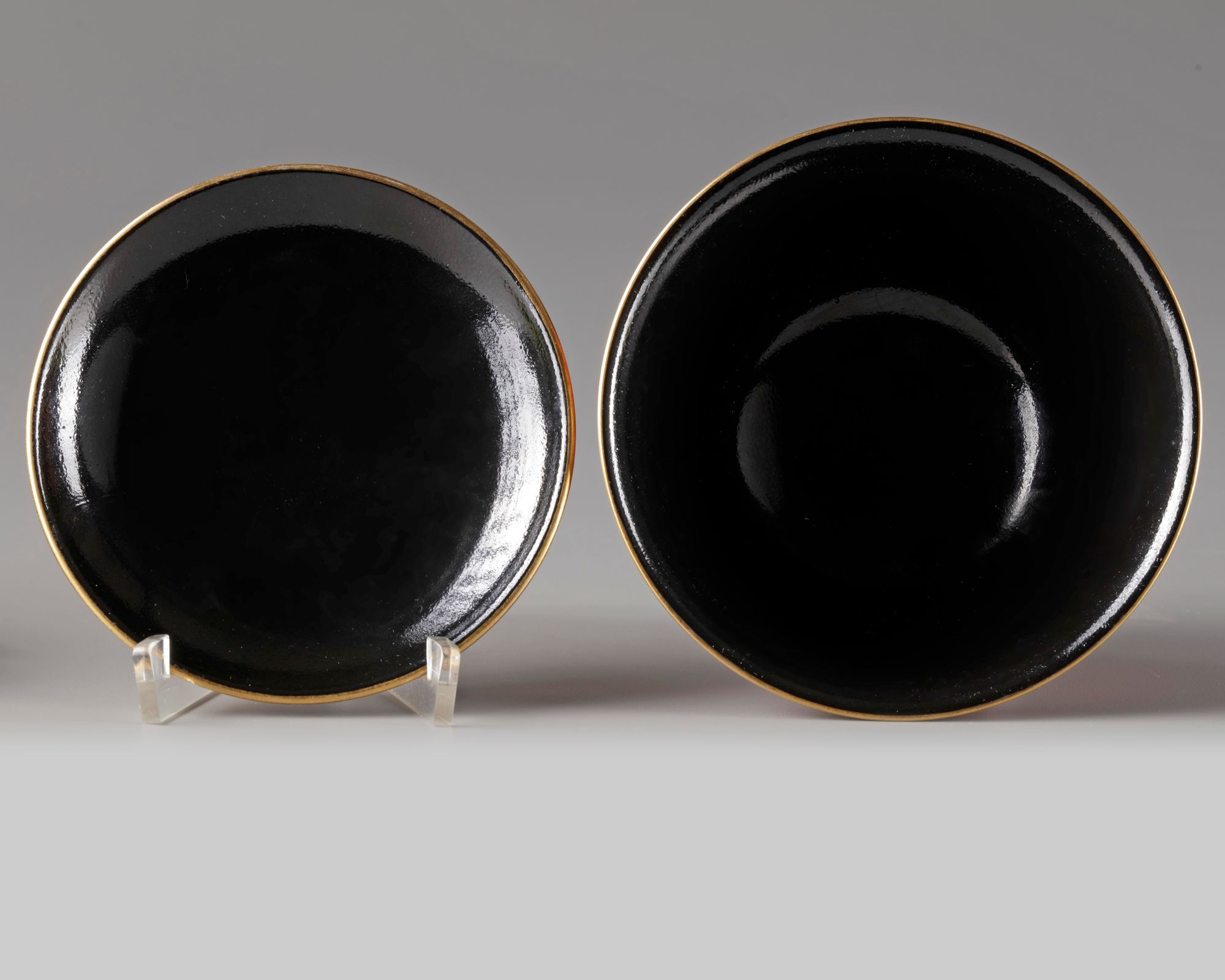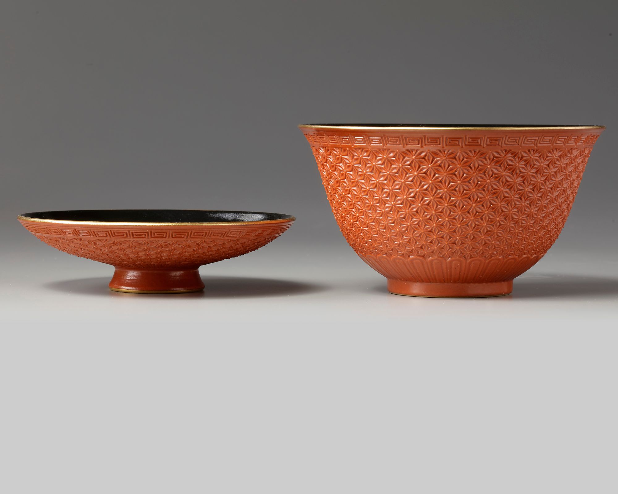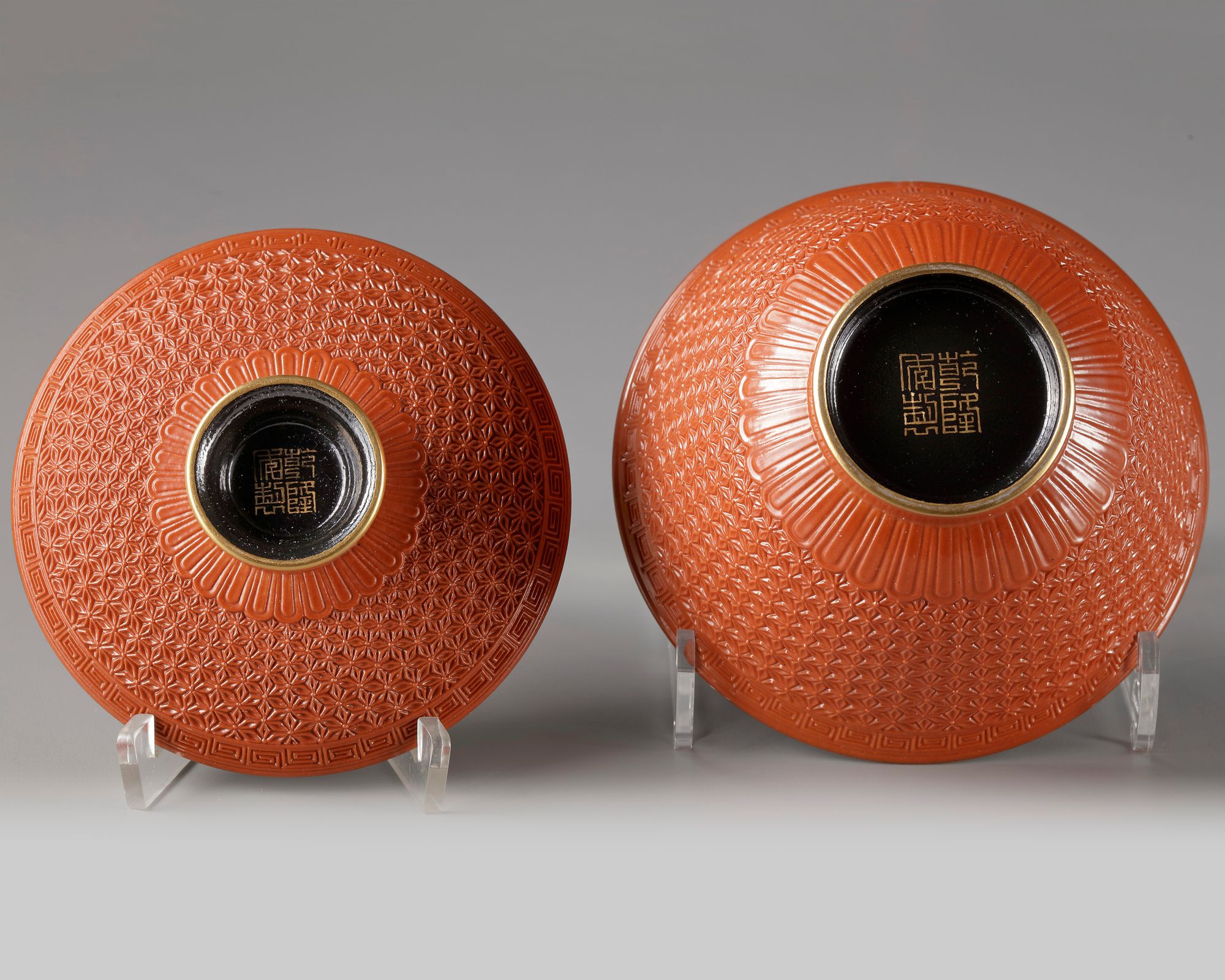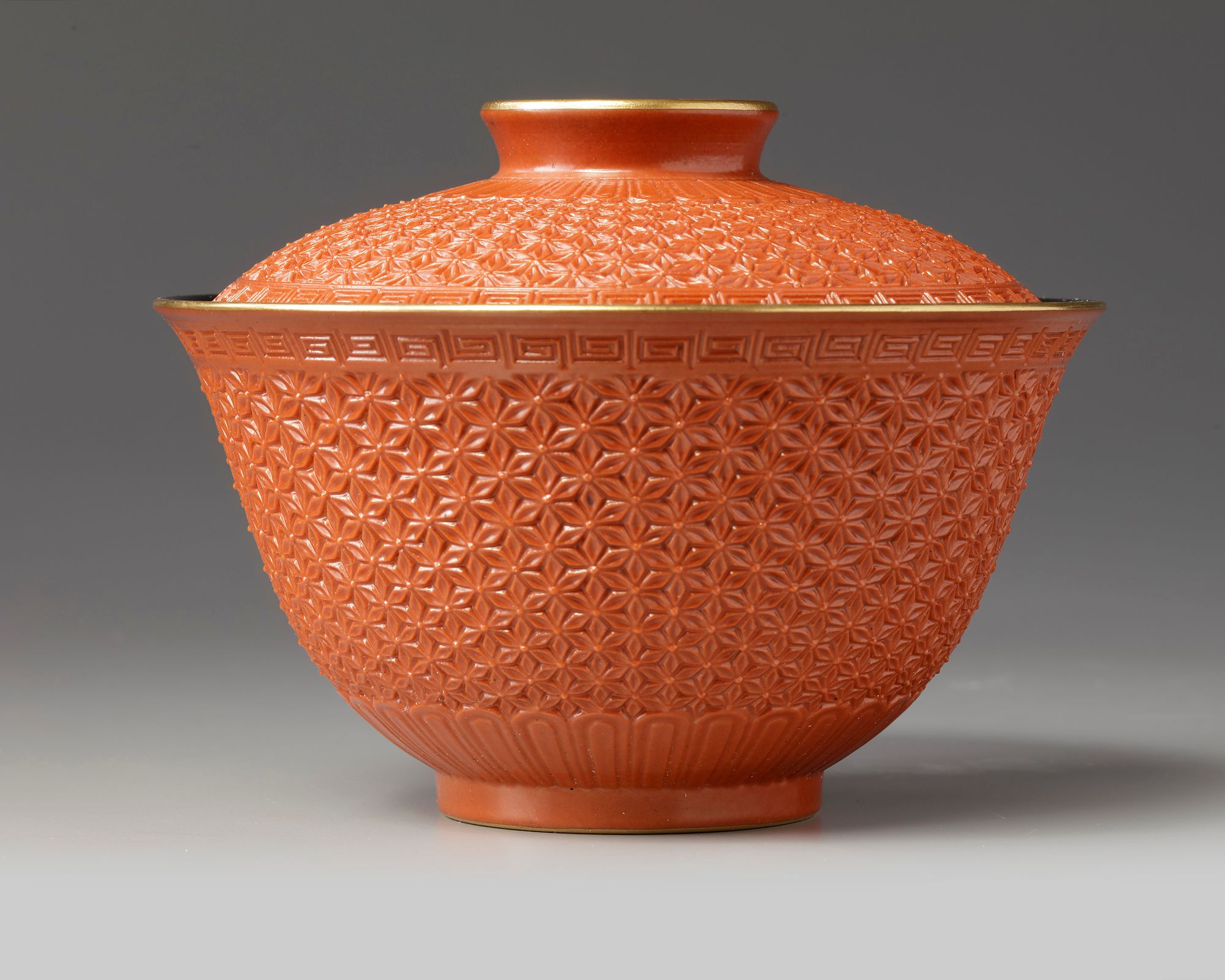 The bowl and cover are carved with a repeated floral design between a keyfret band to the rim and a lappet band to the foot, all covered in a bright red enamel imitating cinnabar lacquer. The interior, base, and inside of the finial are glazed black, and are marked with an apocryphal gilt Qianlong seal mark.