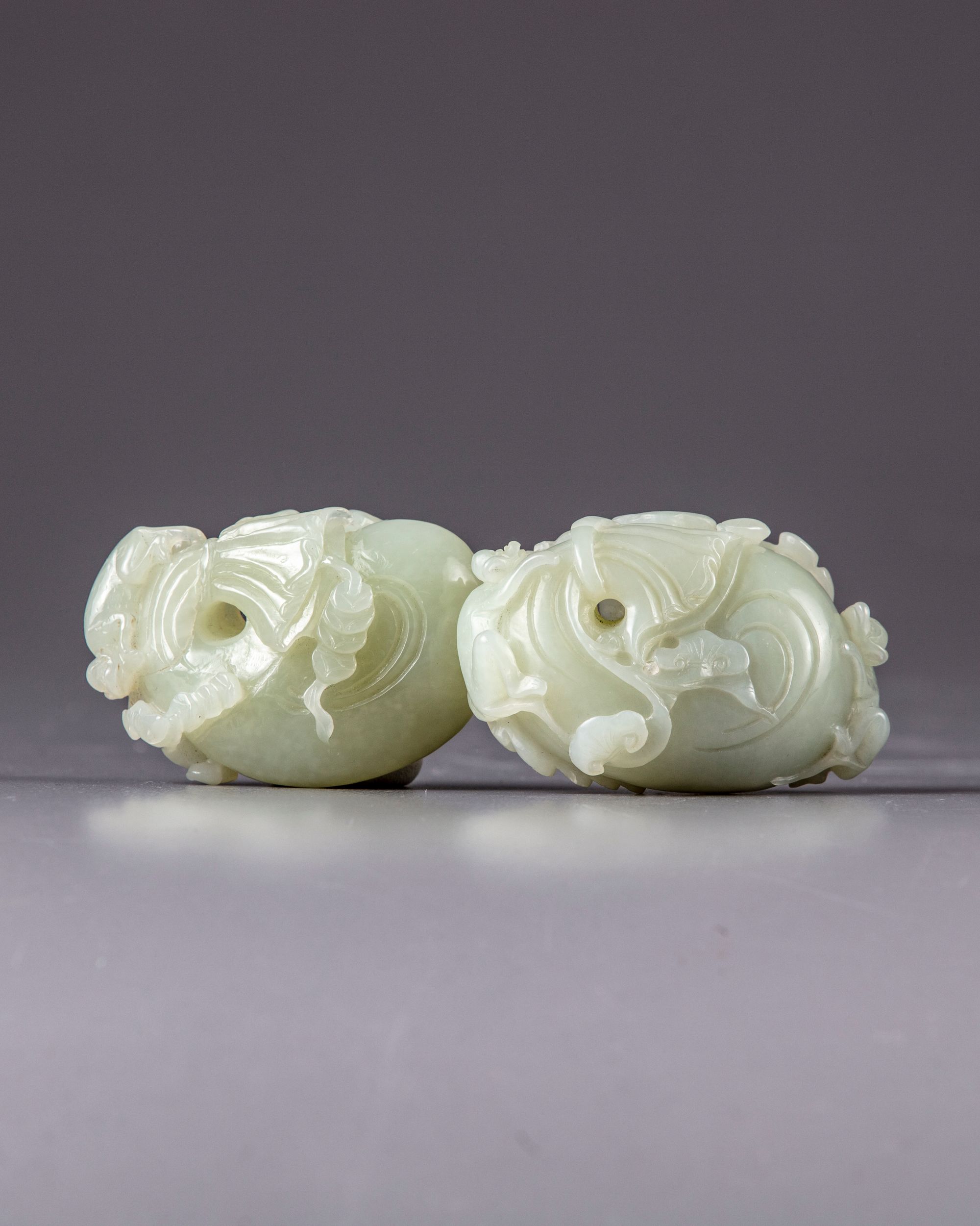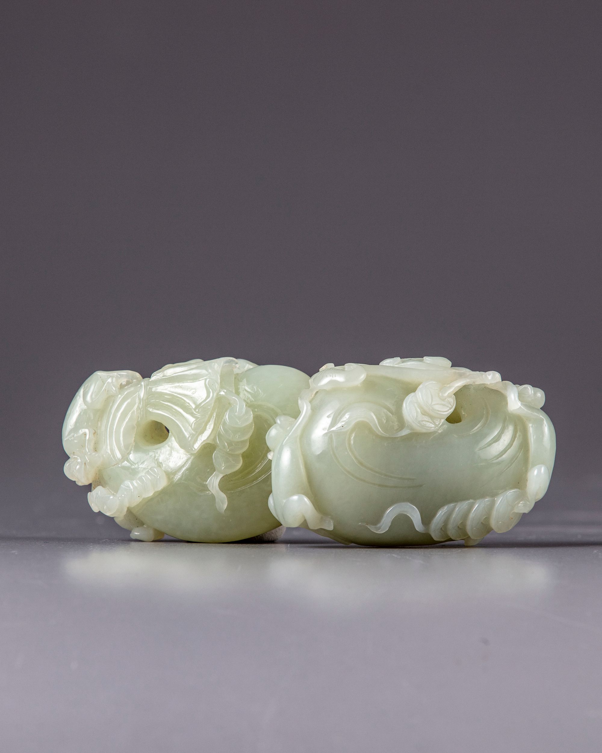 Two Chinese jade carvings of a vintage bad shape, tied with lief stem of ruyi heads or fruiting peach and flanked by two small monkey's.