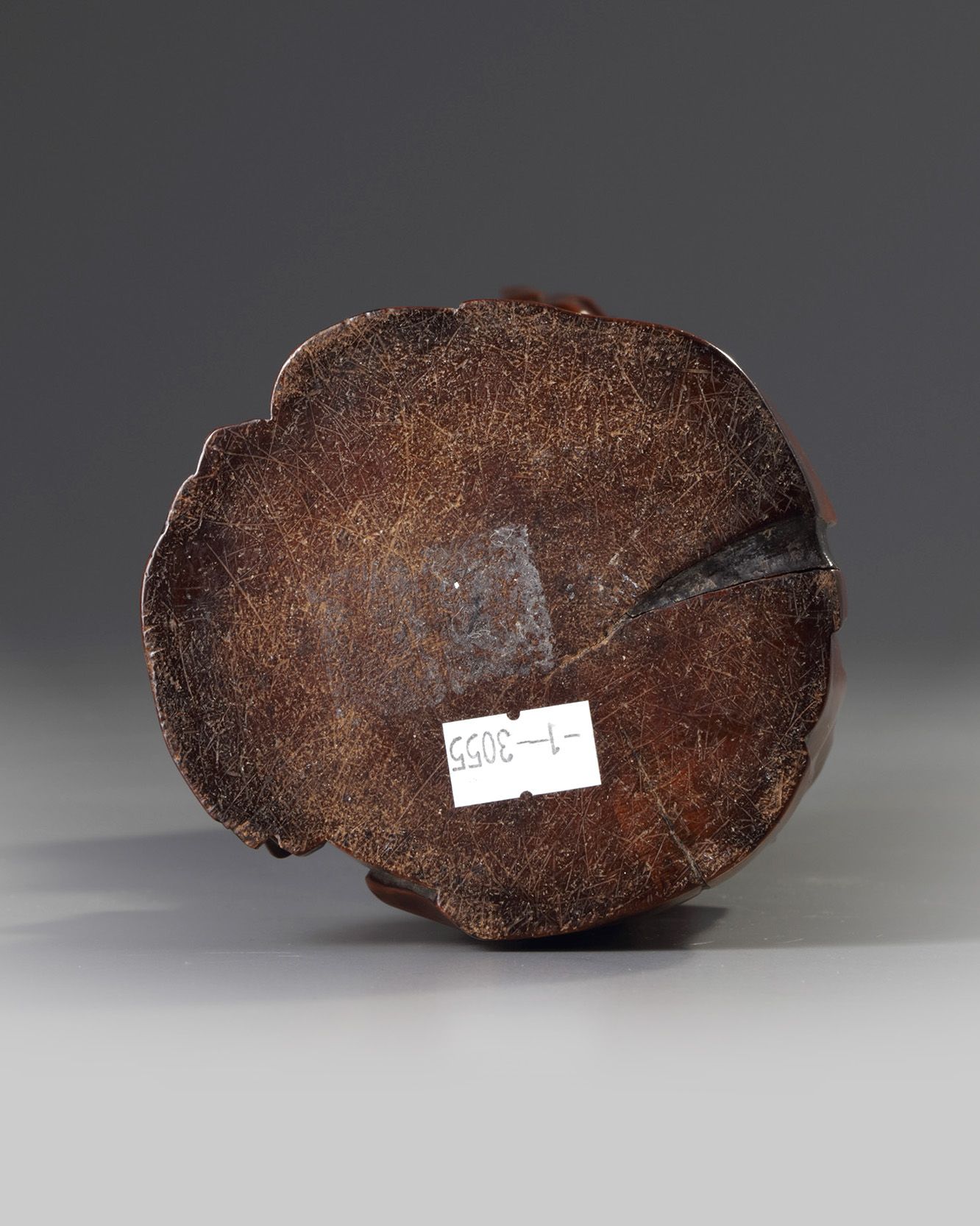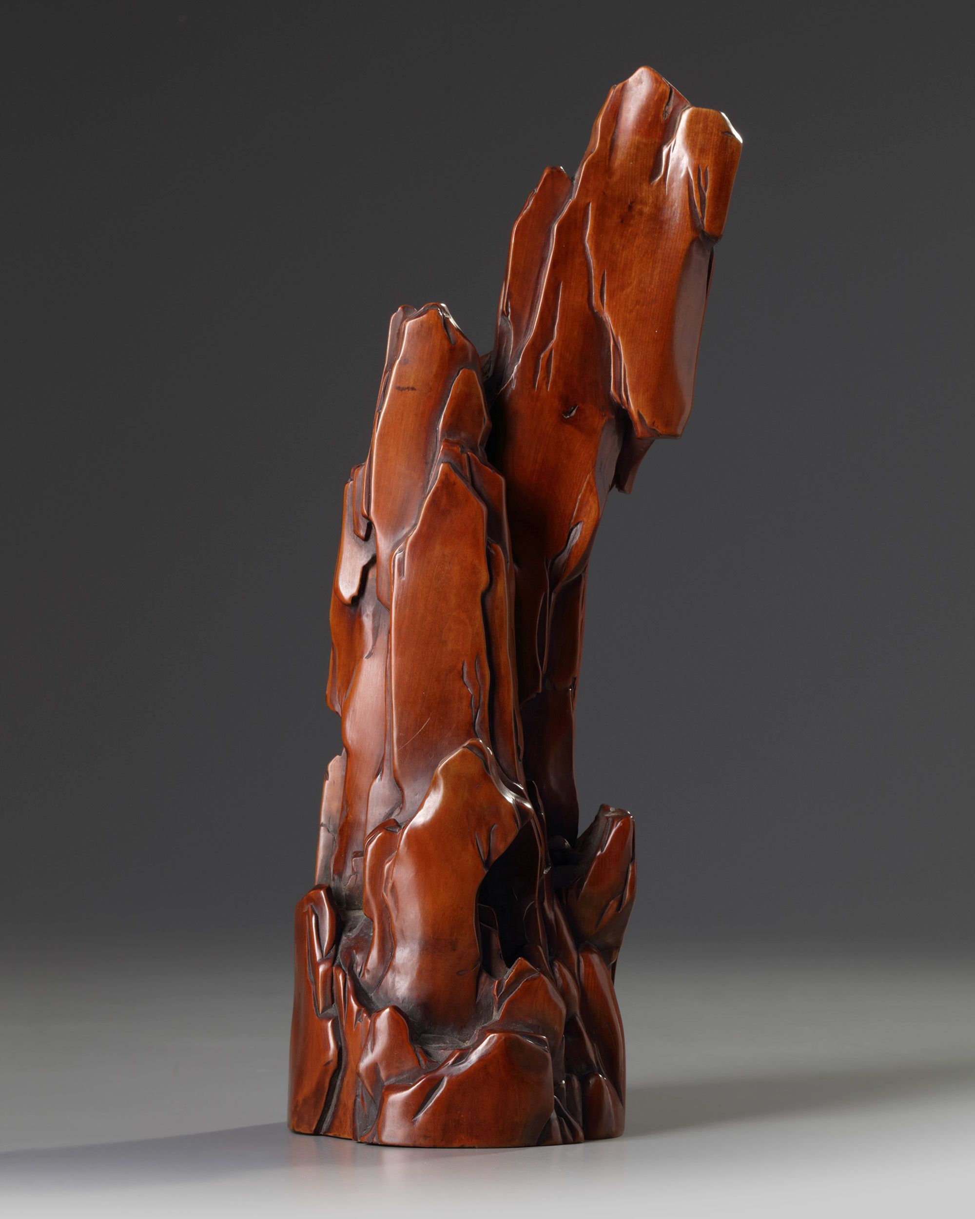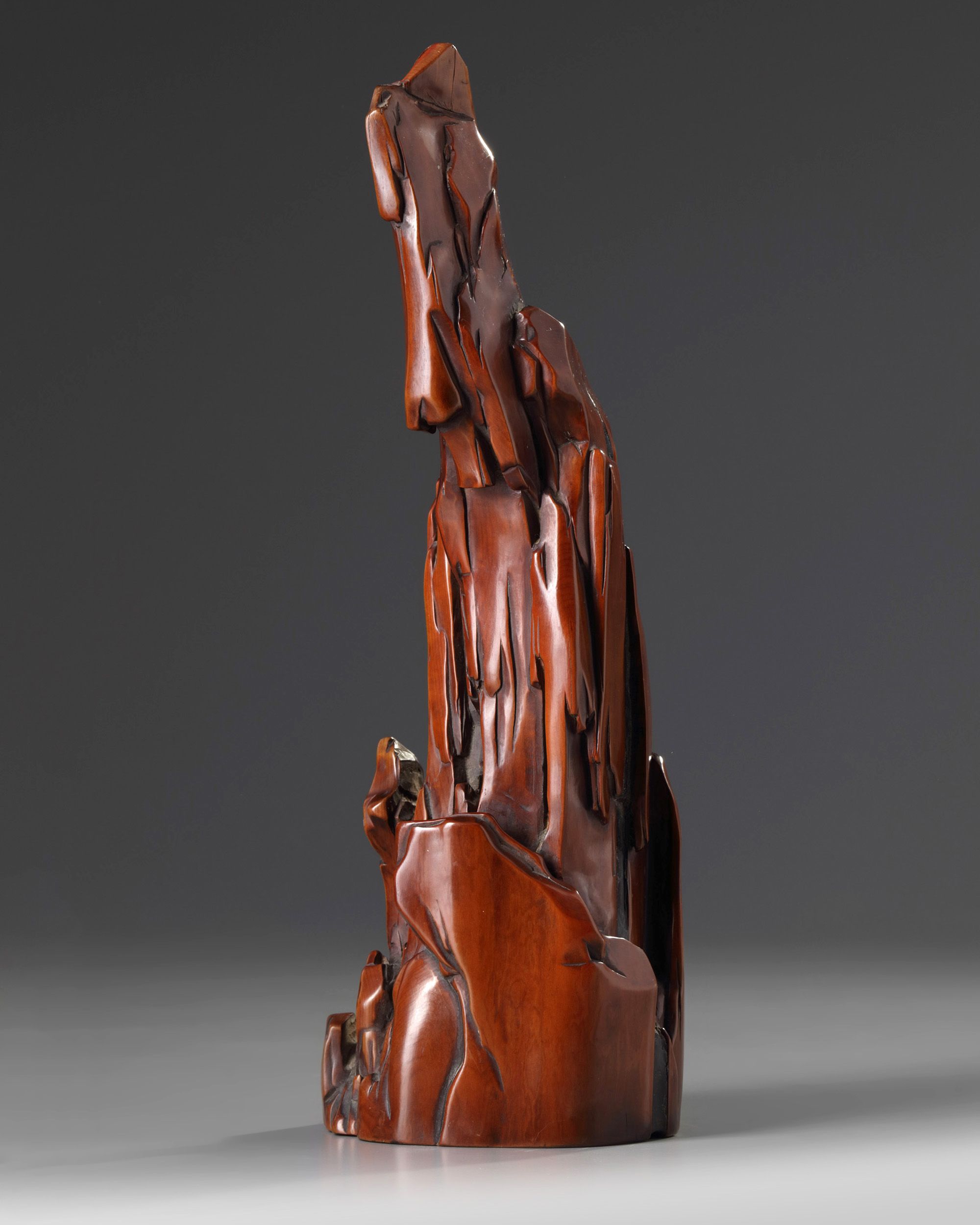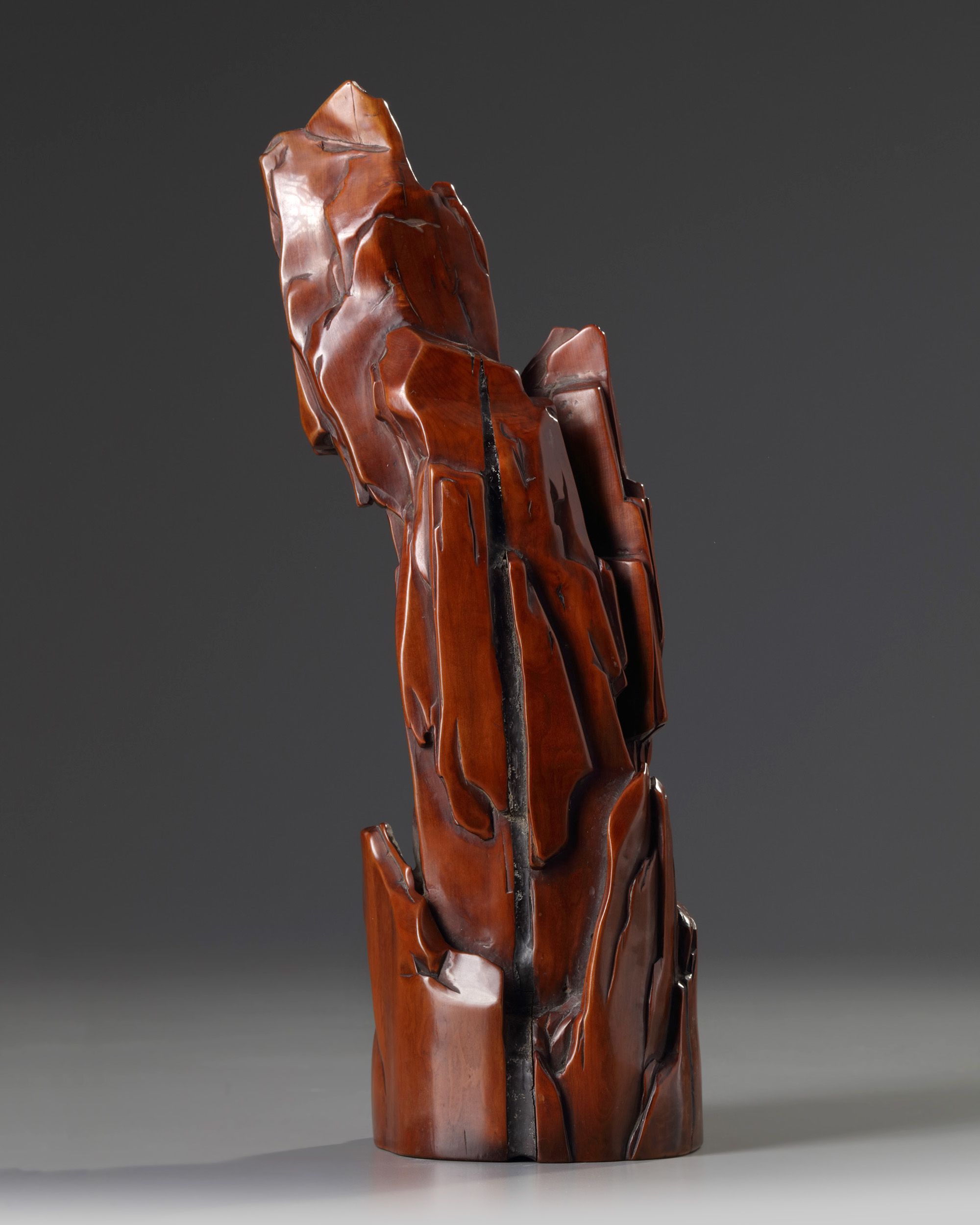 The tall slender sculpture is carved as a series of gnarled rocks, the edges and crevices are well and naturalistically modelled. The wood is of a rich brown tone.