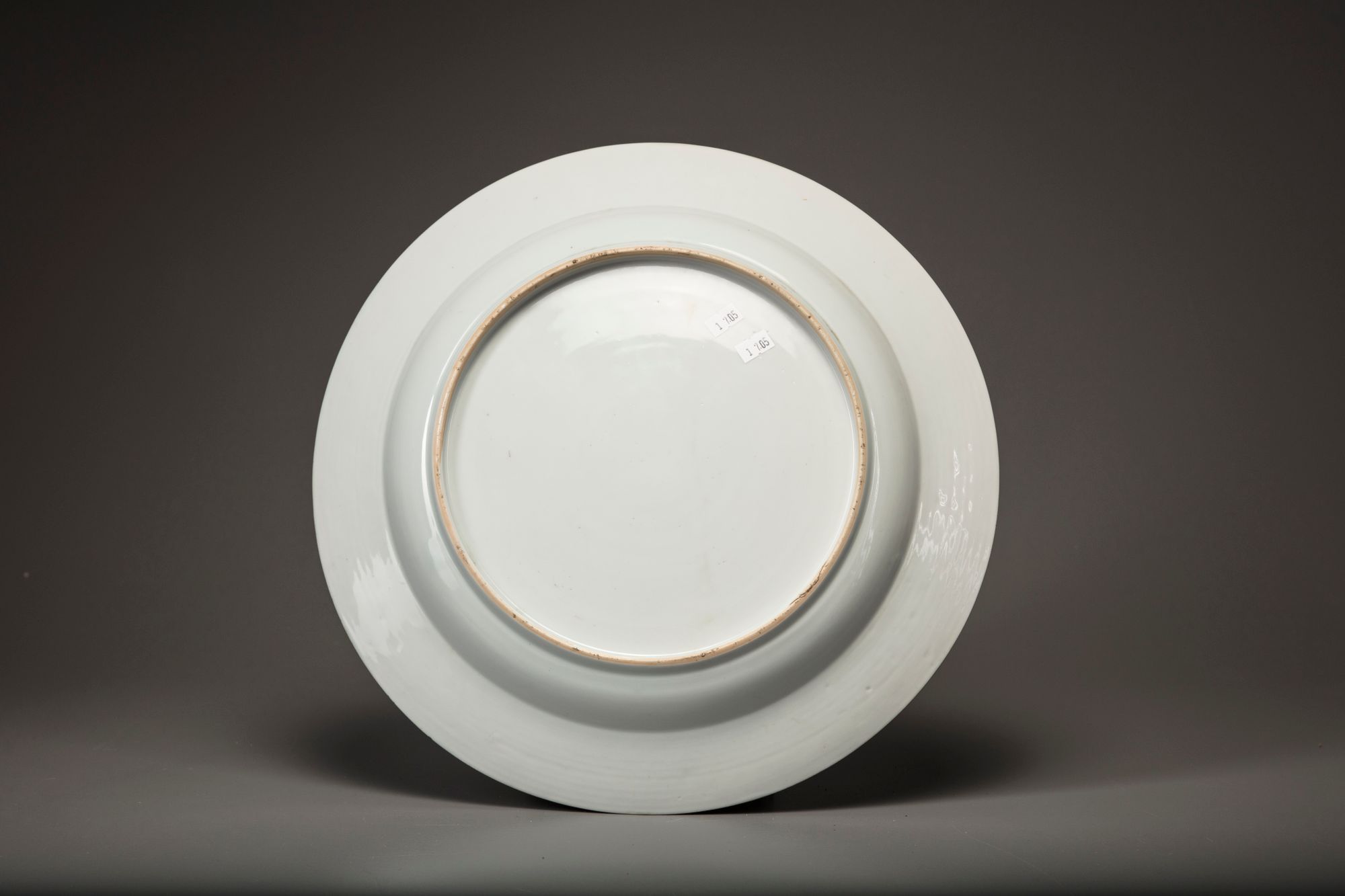 The large dish is decorated with two ladies by a pavilion in a fenced garden before a lotus pond. The scene is surrounded by a floral border.