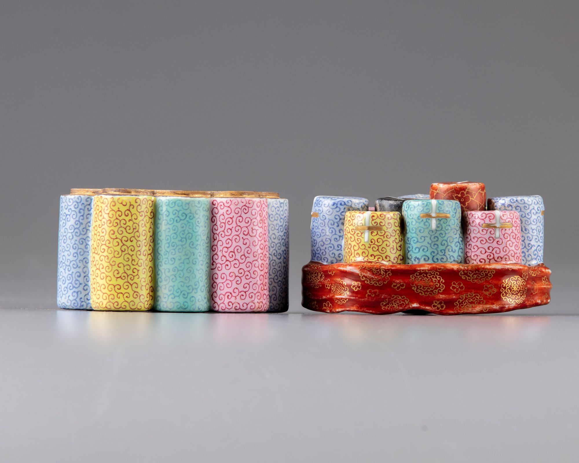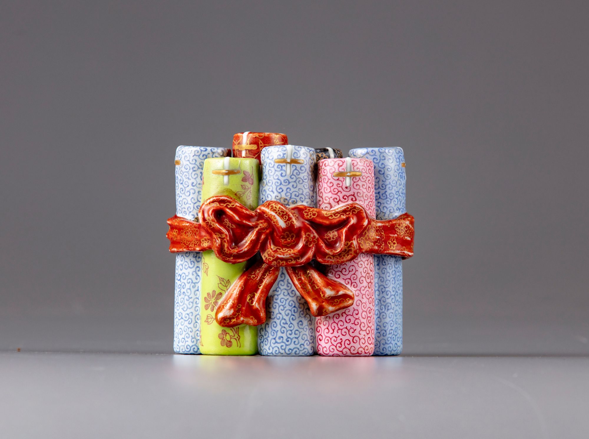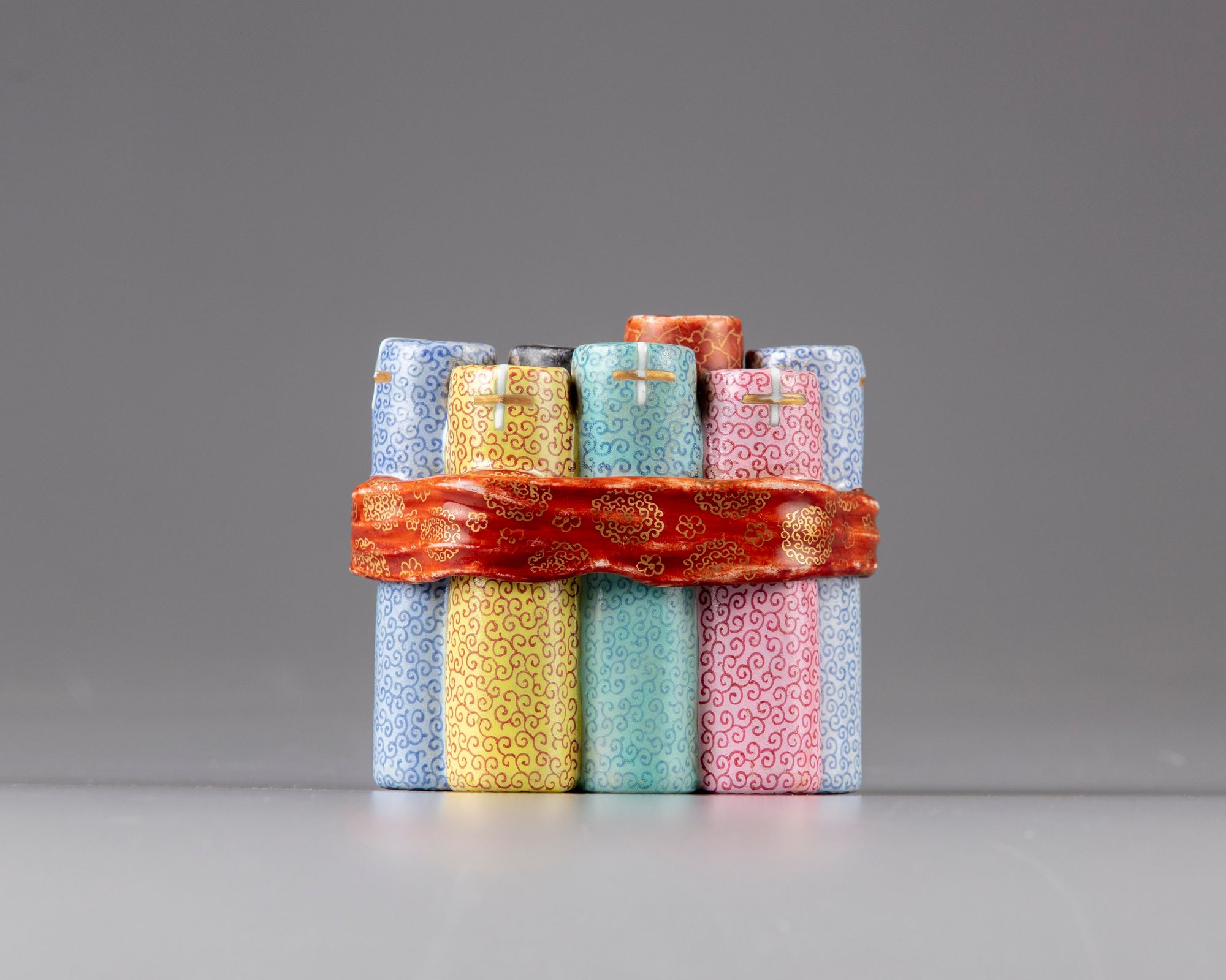 A famille rose 'candles tied by a ribbon' pot and coverm with a Qianlong seal mark to the base.