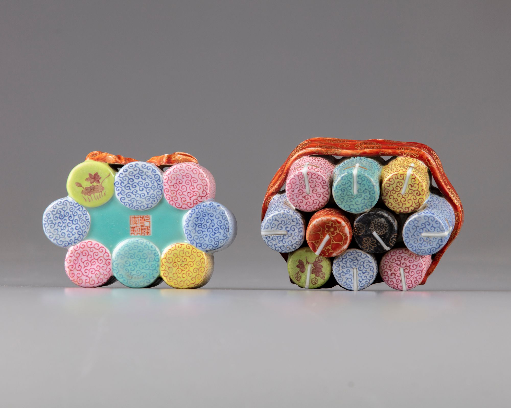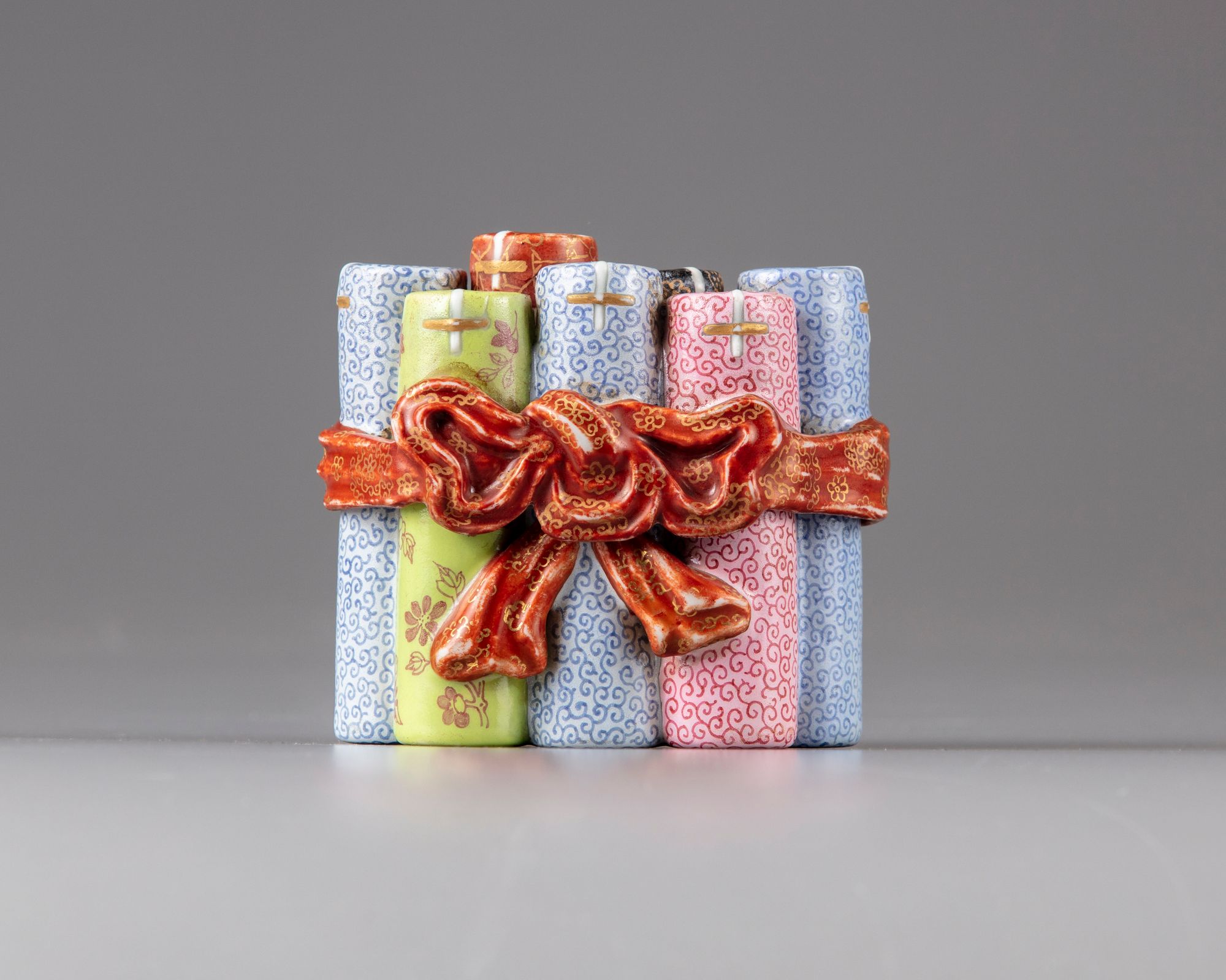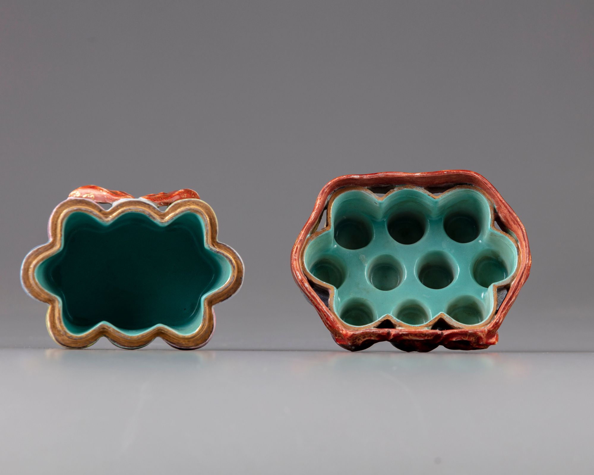 A famille rose 'candles tied by a ribbon' pot and coverm with a Qianlong seal mark to the base.