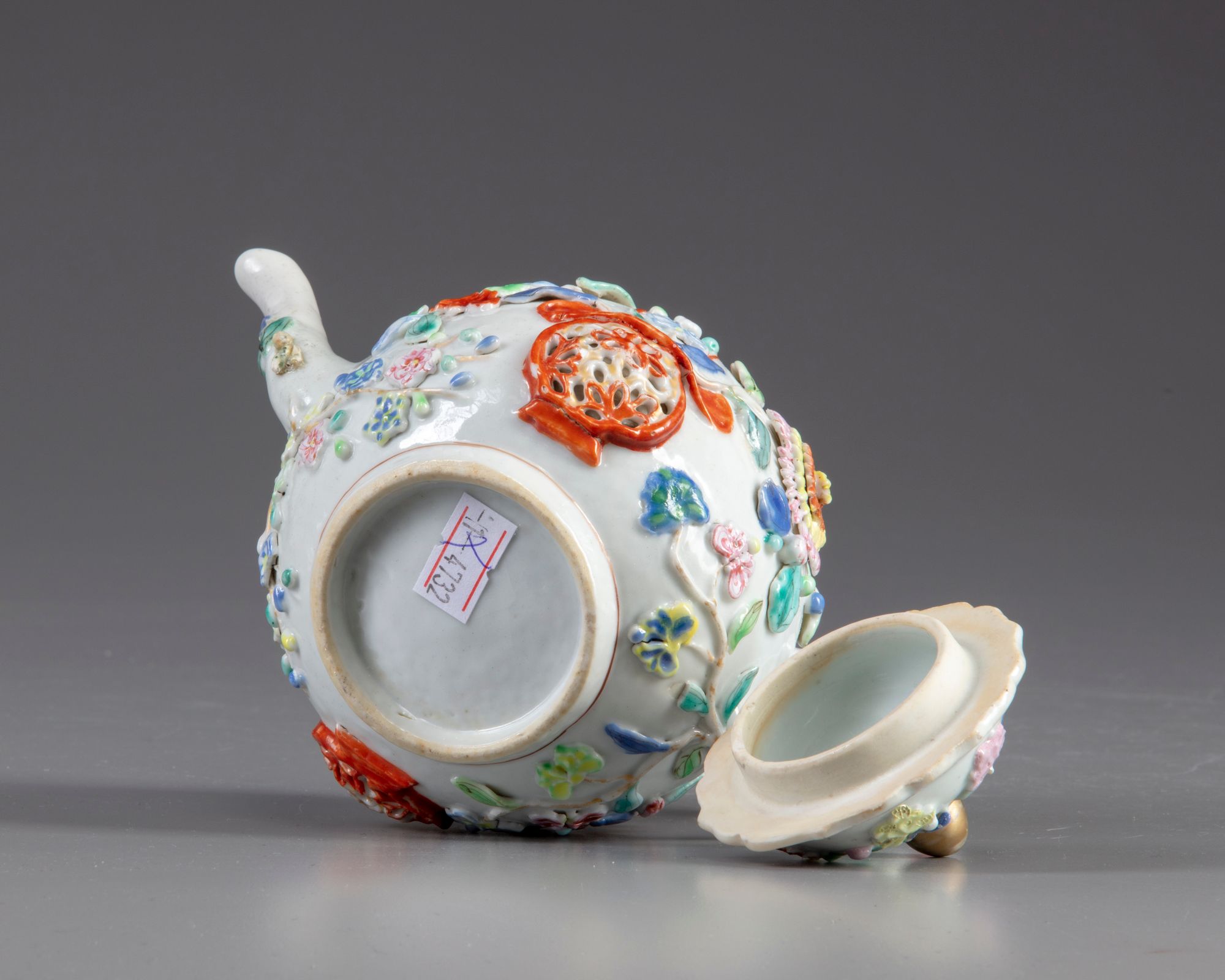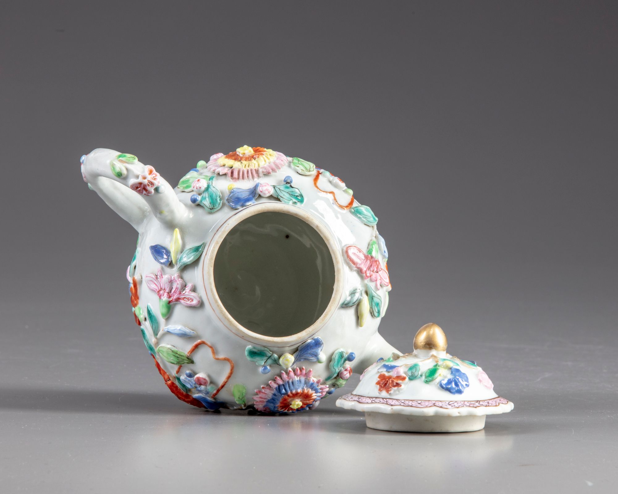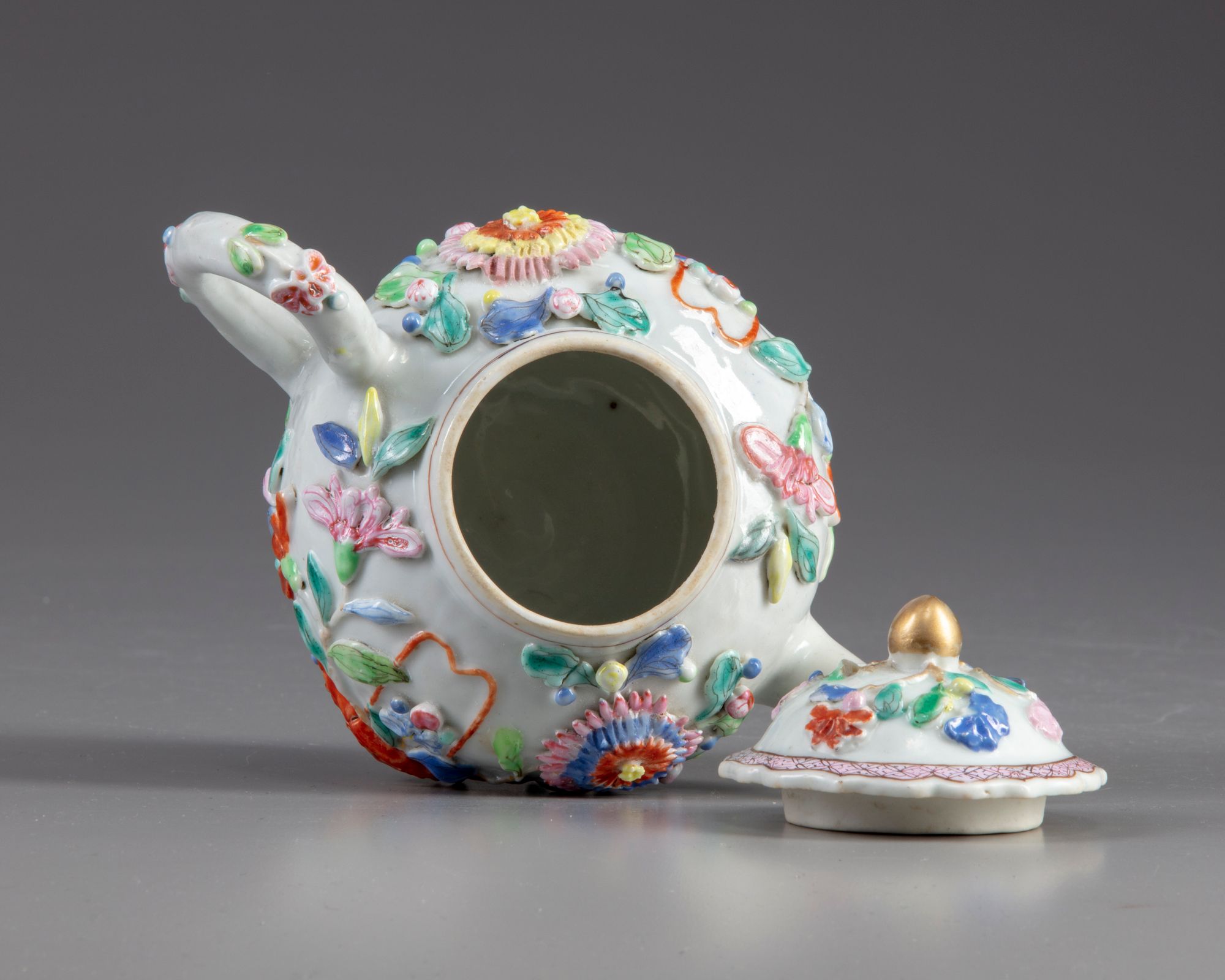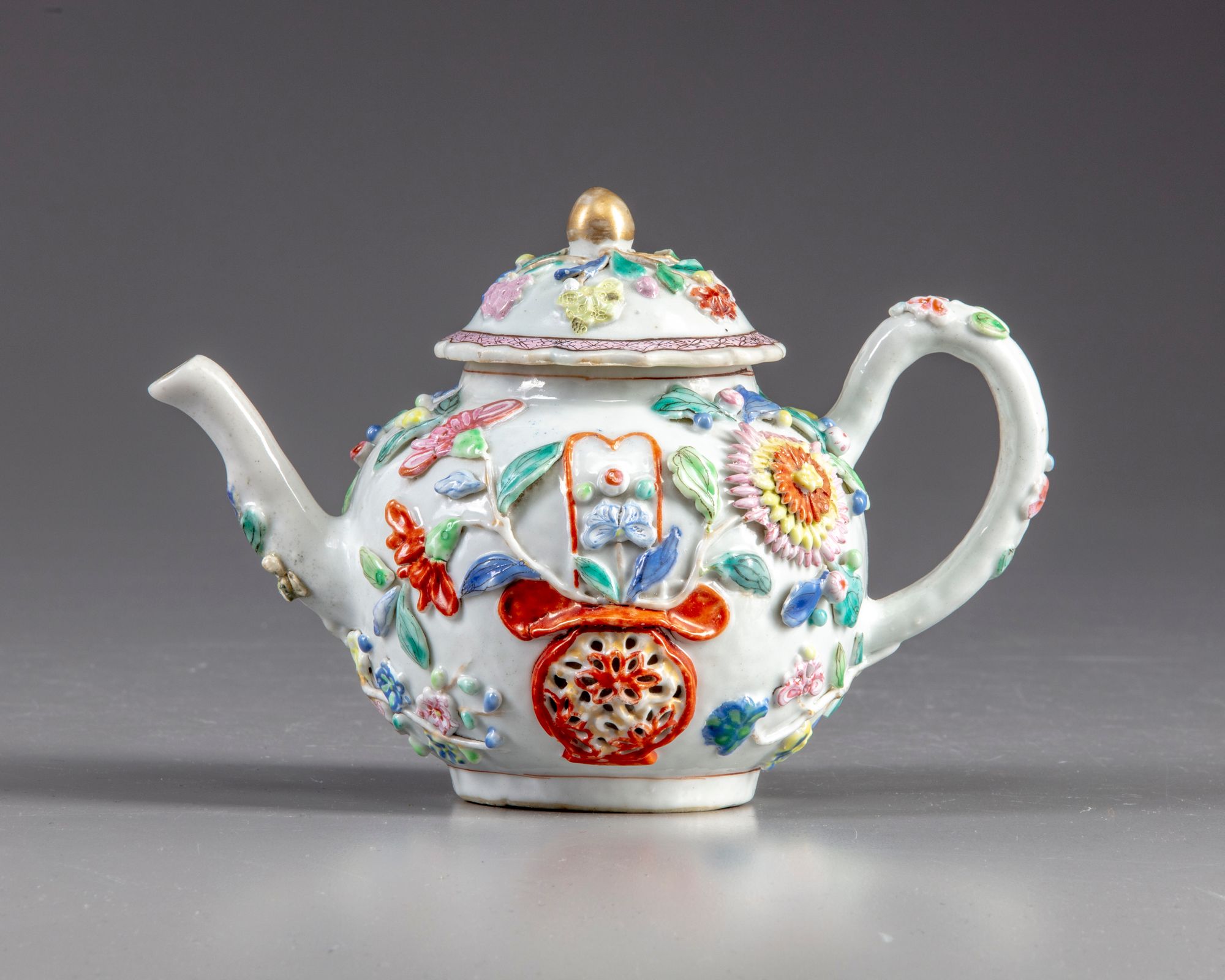 A globular teapot decorated with moulded and applique decoration depicting flowers in a basket amongst chrysanthemum the cover is decorated with further flowers and is surmounted by a gilt finial.
