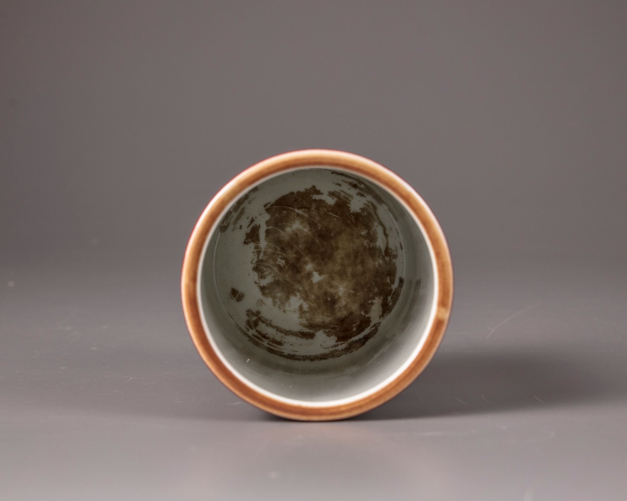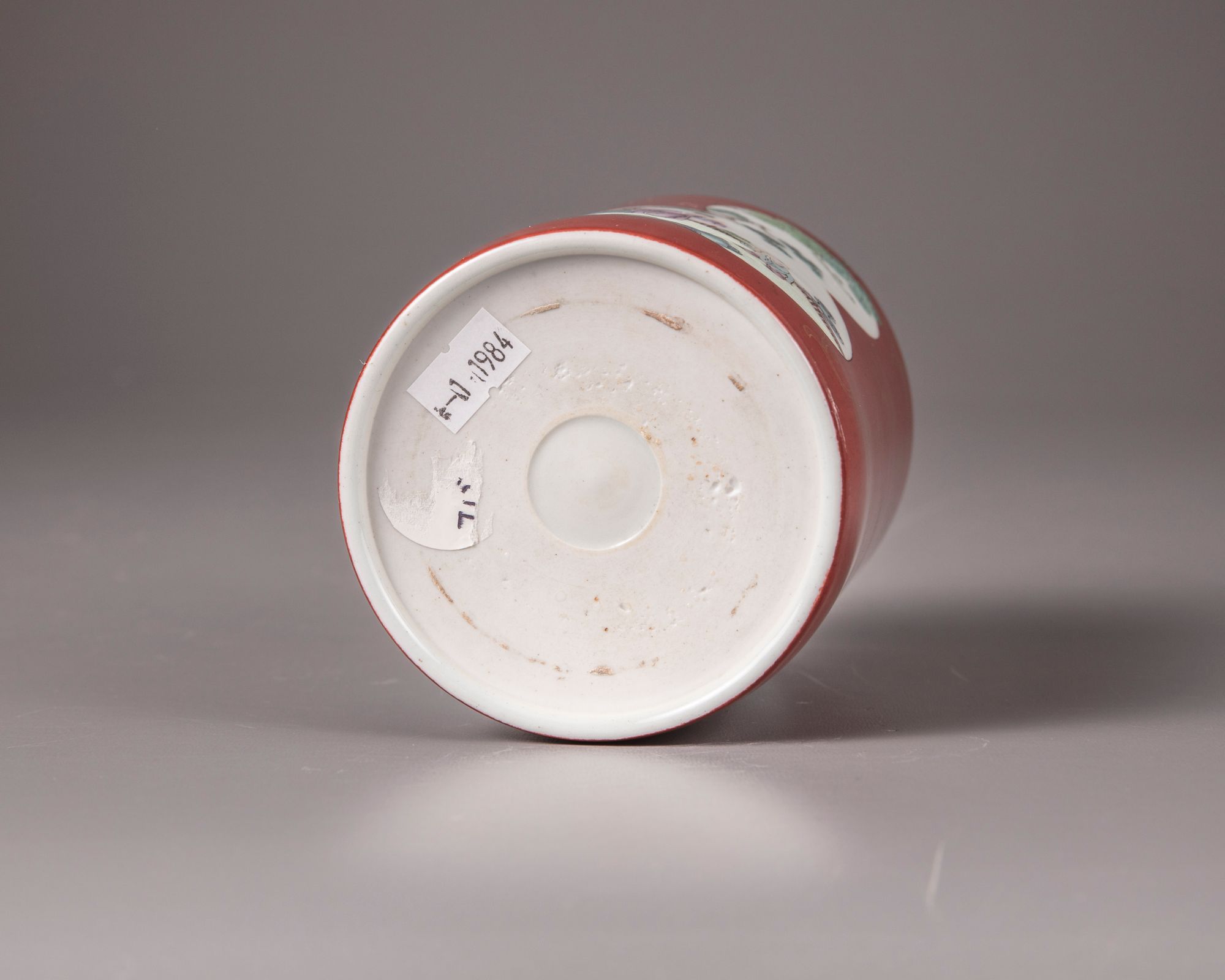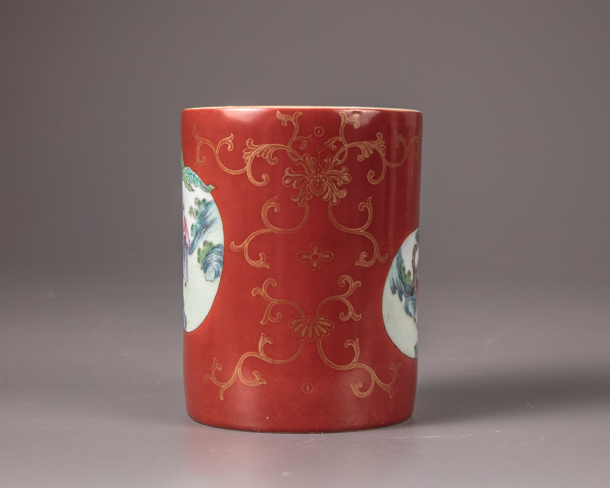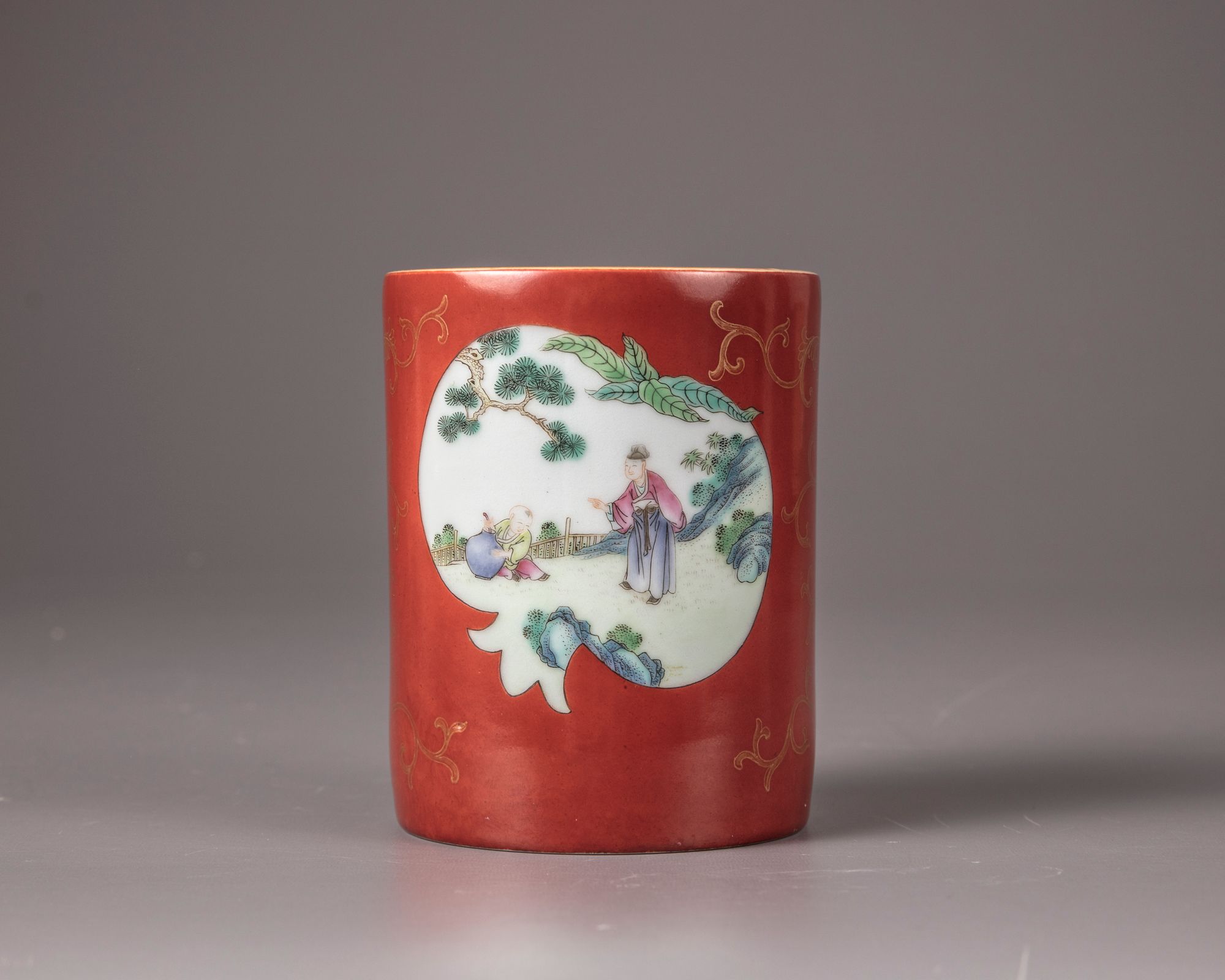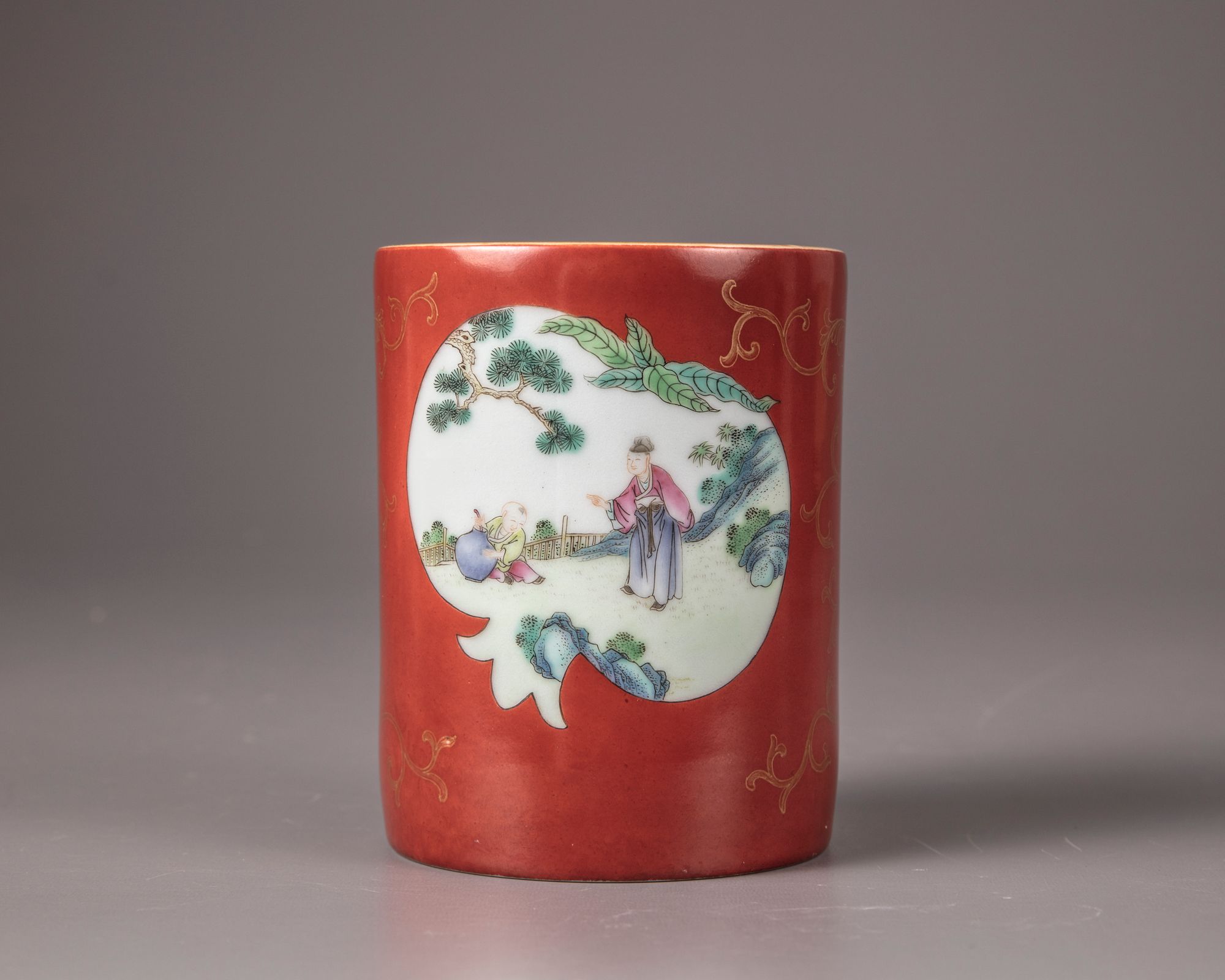 The straight-sided brush pot is decorated with two shaped panels, one as a double gourd on the vine and the other as a pomegranate. The gourd panel encloses a scholar and an attendant under pine trees in a fenced garden, the pomegranate panel encloses a scholar and an attendant with wine jar. The panels are interspersed with gilt lotus scrolls on a coral-red ground. The rim is covered in a café-au-lait glaze.