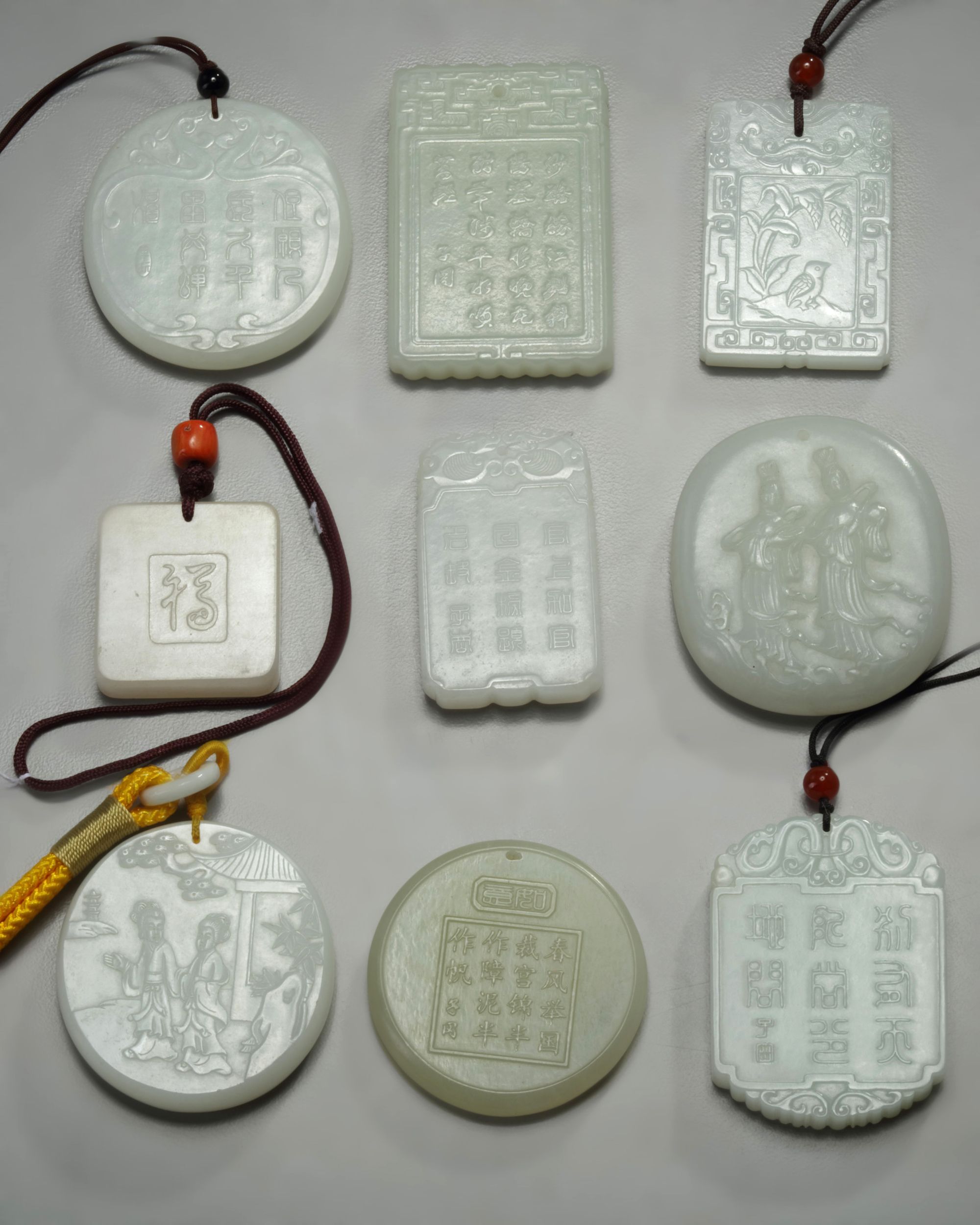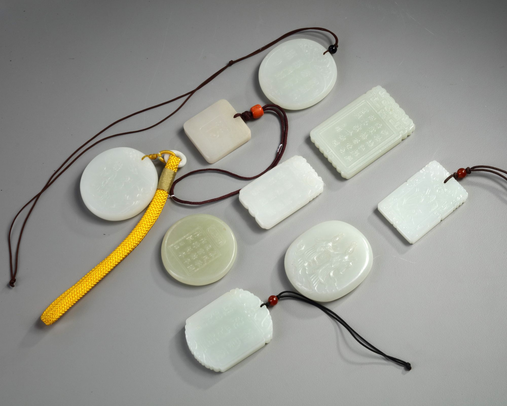 The group comprises: an oval plaque carved with two ladies; a circular plaque carved with two birds and a worm; a rounded rectangular plaque carved with as scholar and attendant; a circular plaque with two ladies in a garden; a rectangular plaque with a scholar and attendant; a circular plaque carved with two carp; a rectangular plaque with a quail and millet; a rectangular plaque with a cockerel; and a square plaque with a bat and twin cash symbol.