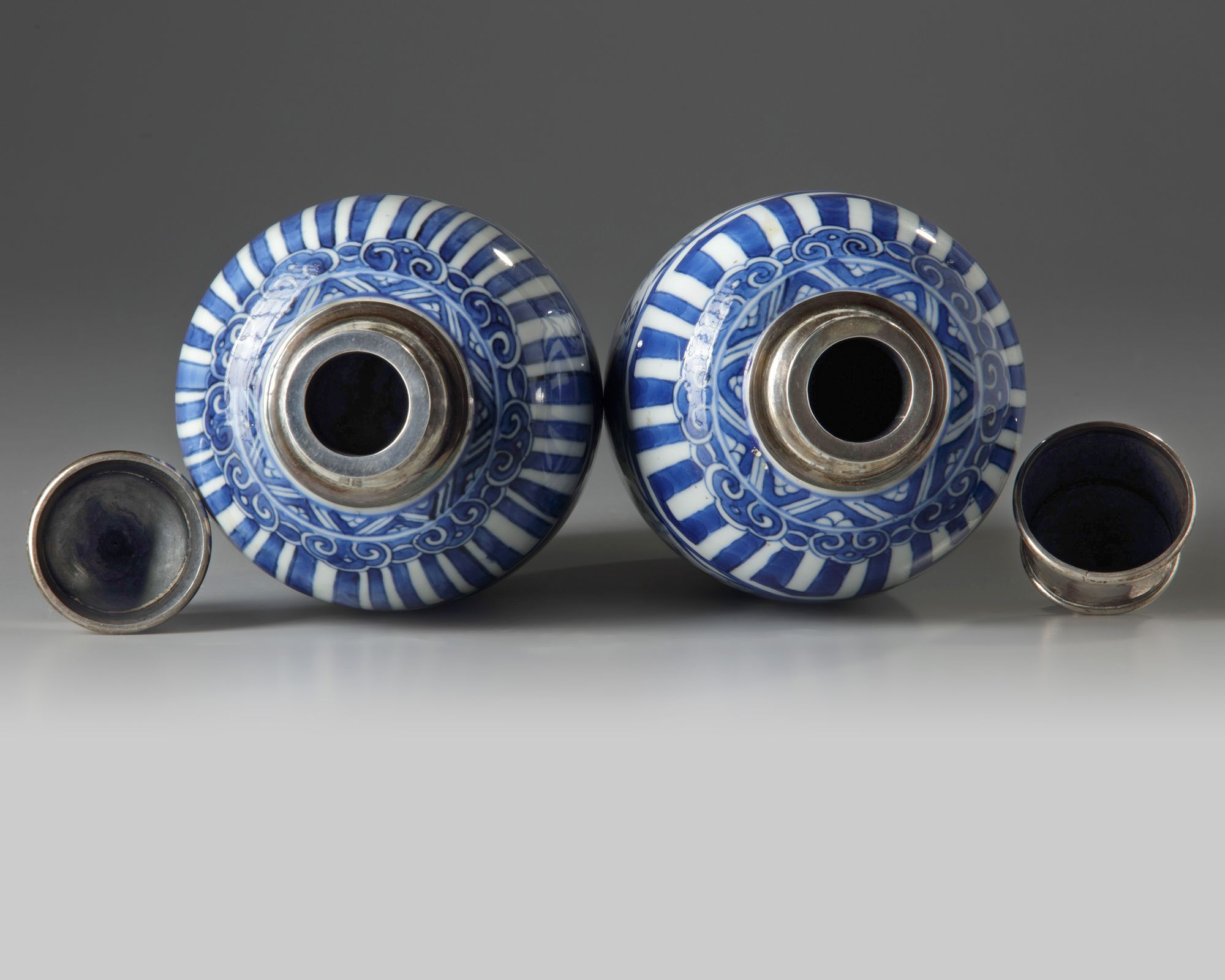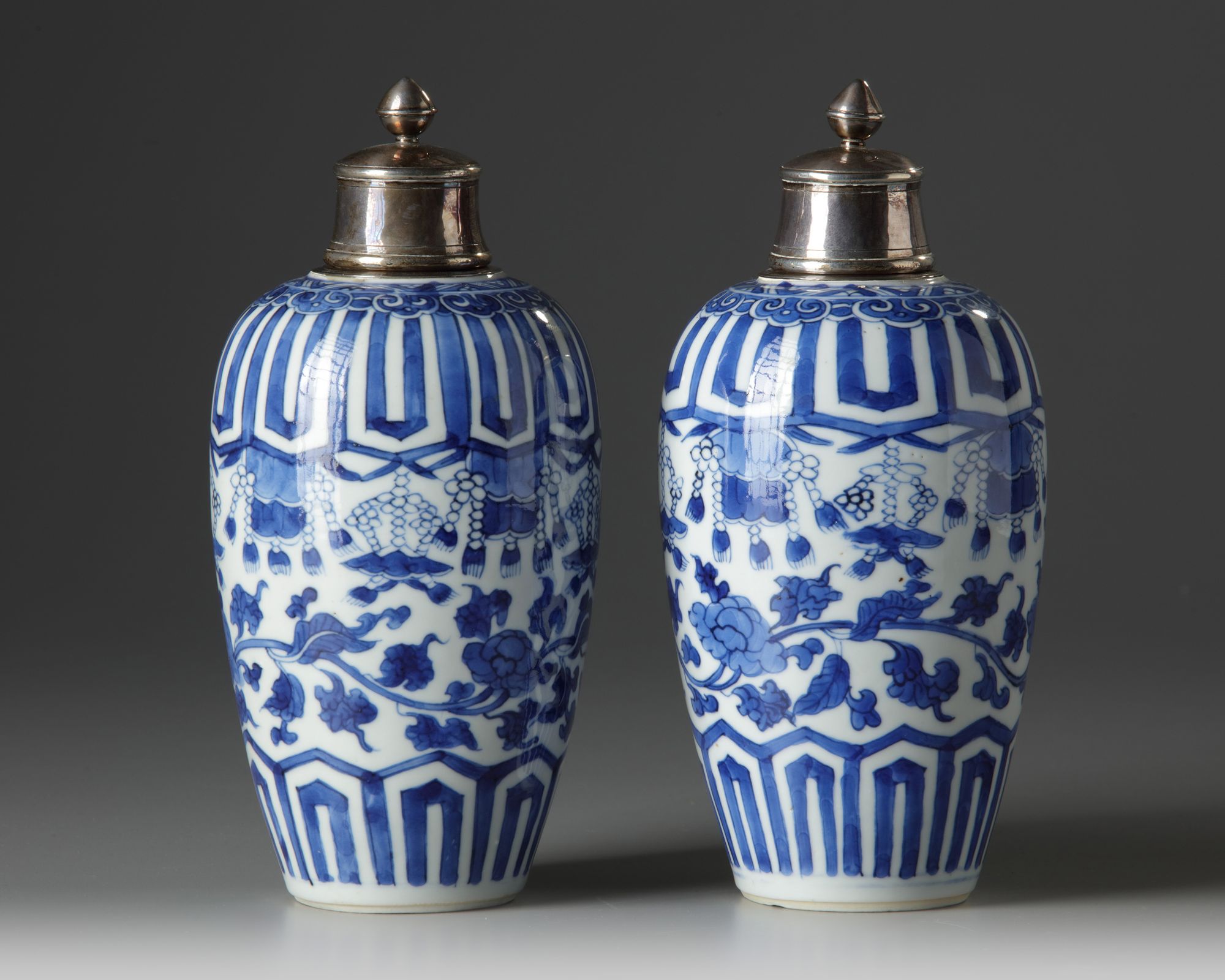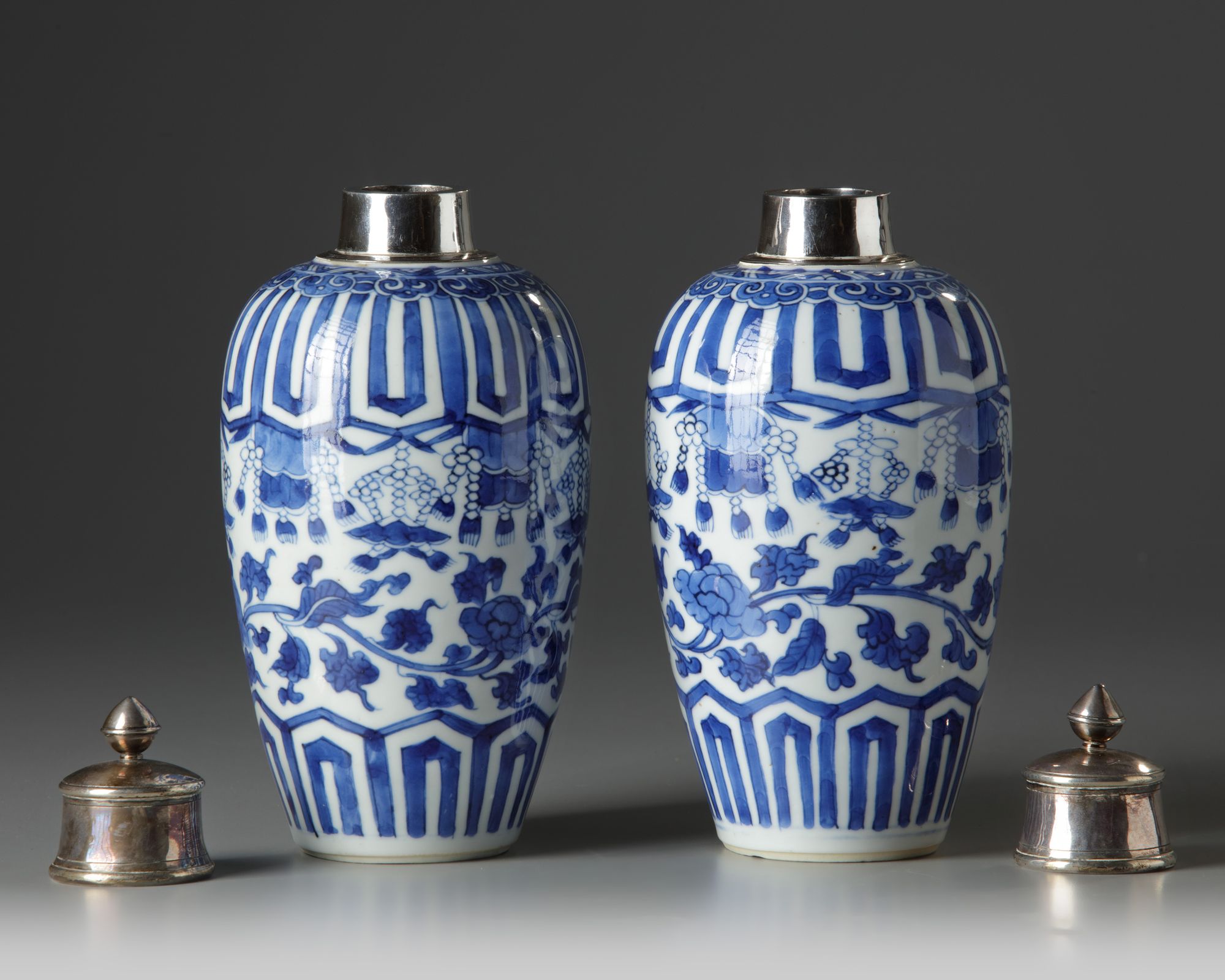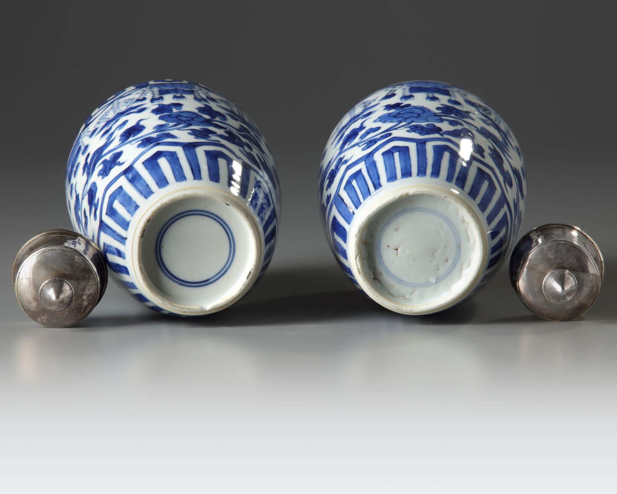 Each decorated with scrolling peonies below suspended parasols and chimes between two lappet bands, a ruyi head band to the shoulder and a demi-flower band just below the neck. The bases are decorated with two circles in underglaze blue. The rims are mounted in silver, and with a tapered silver cover surmounted by a lotus bud finial.