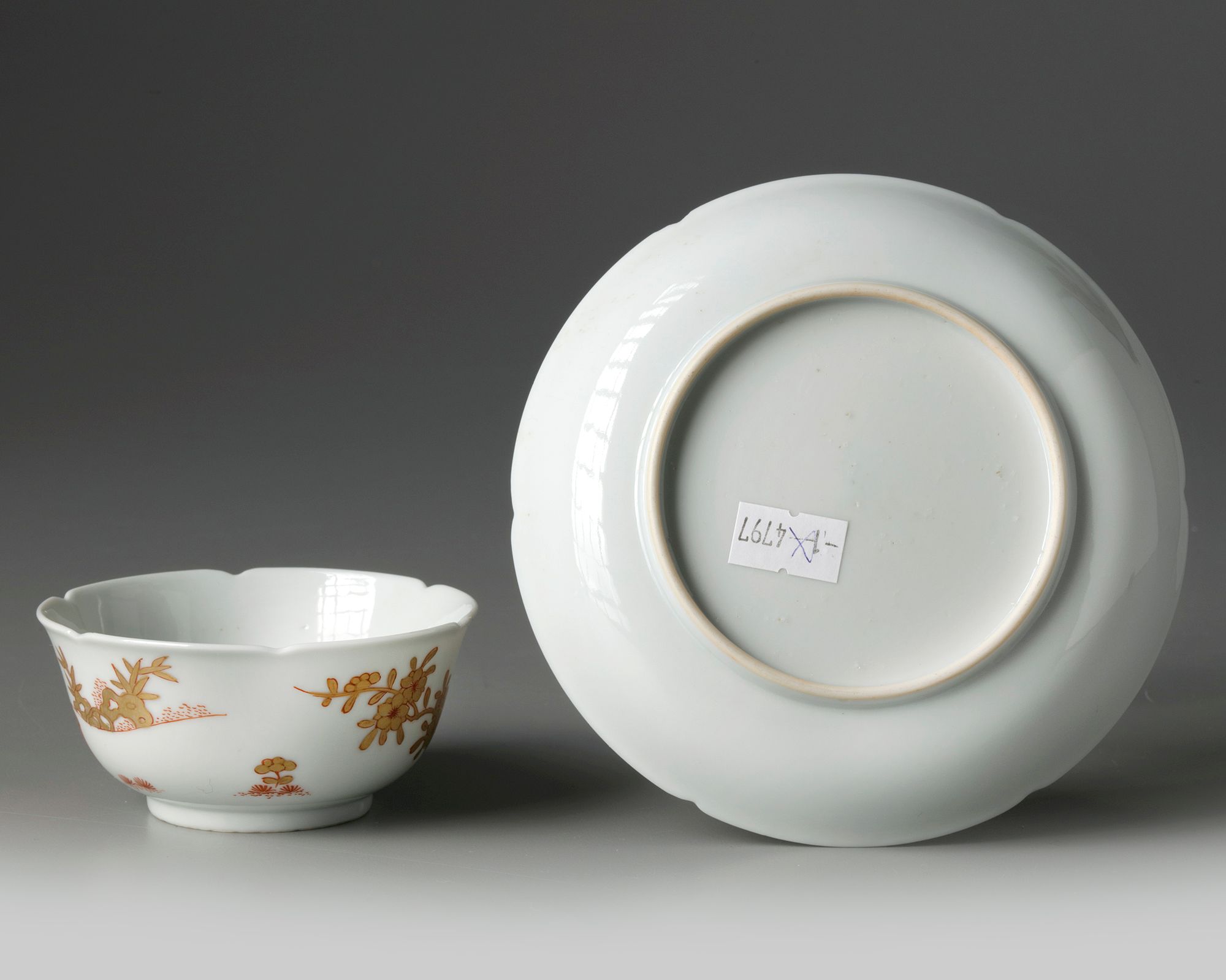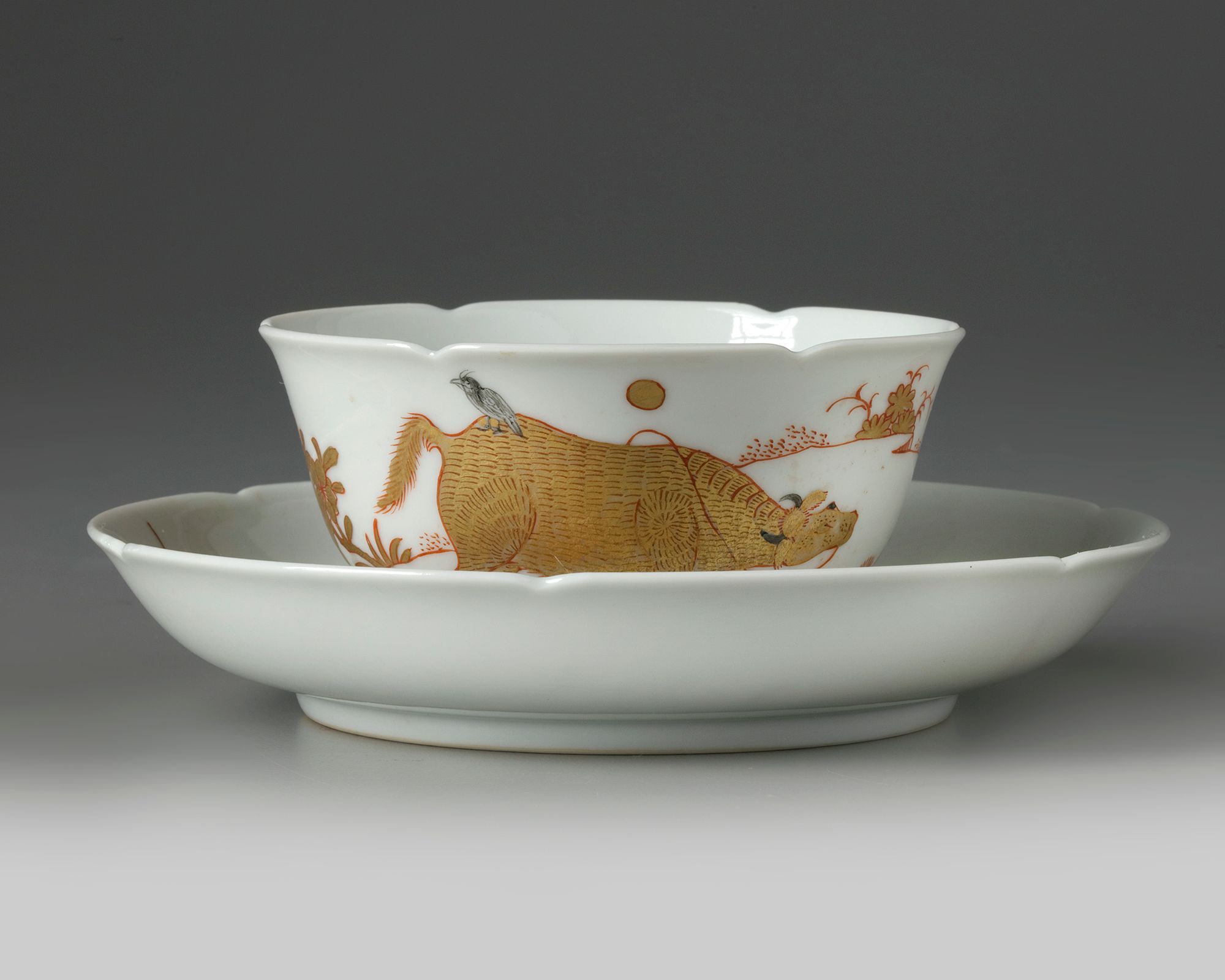 Both the cup and saucer are decorated with a oxherd with a water buffalo and a bird perched on top, by a prunus tree.