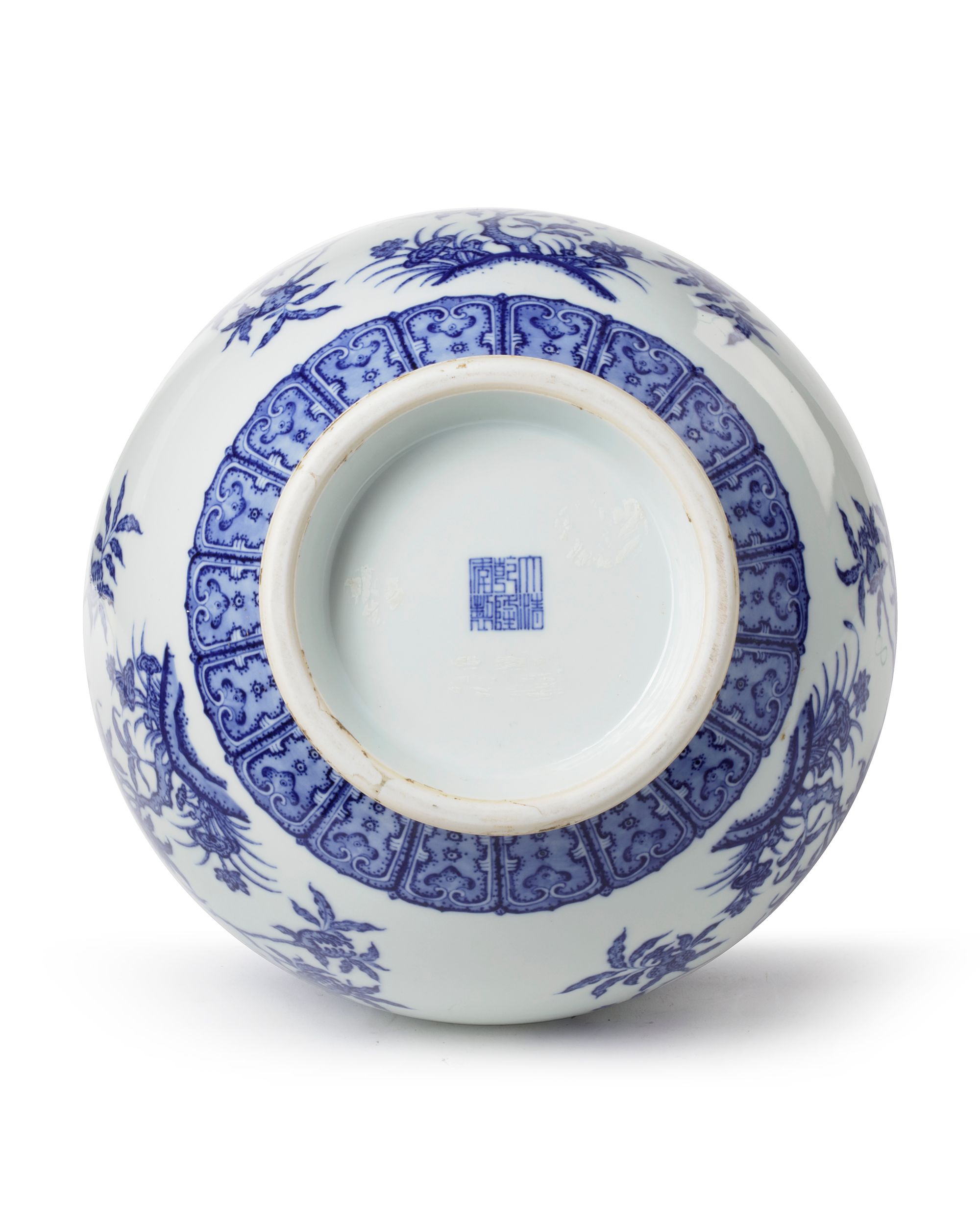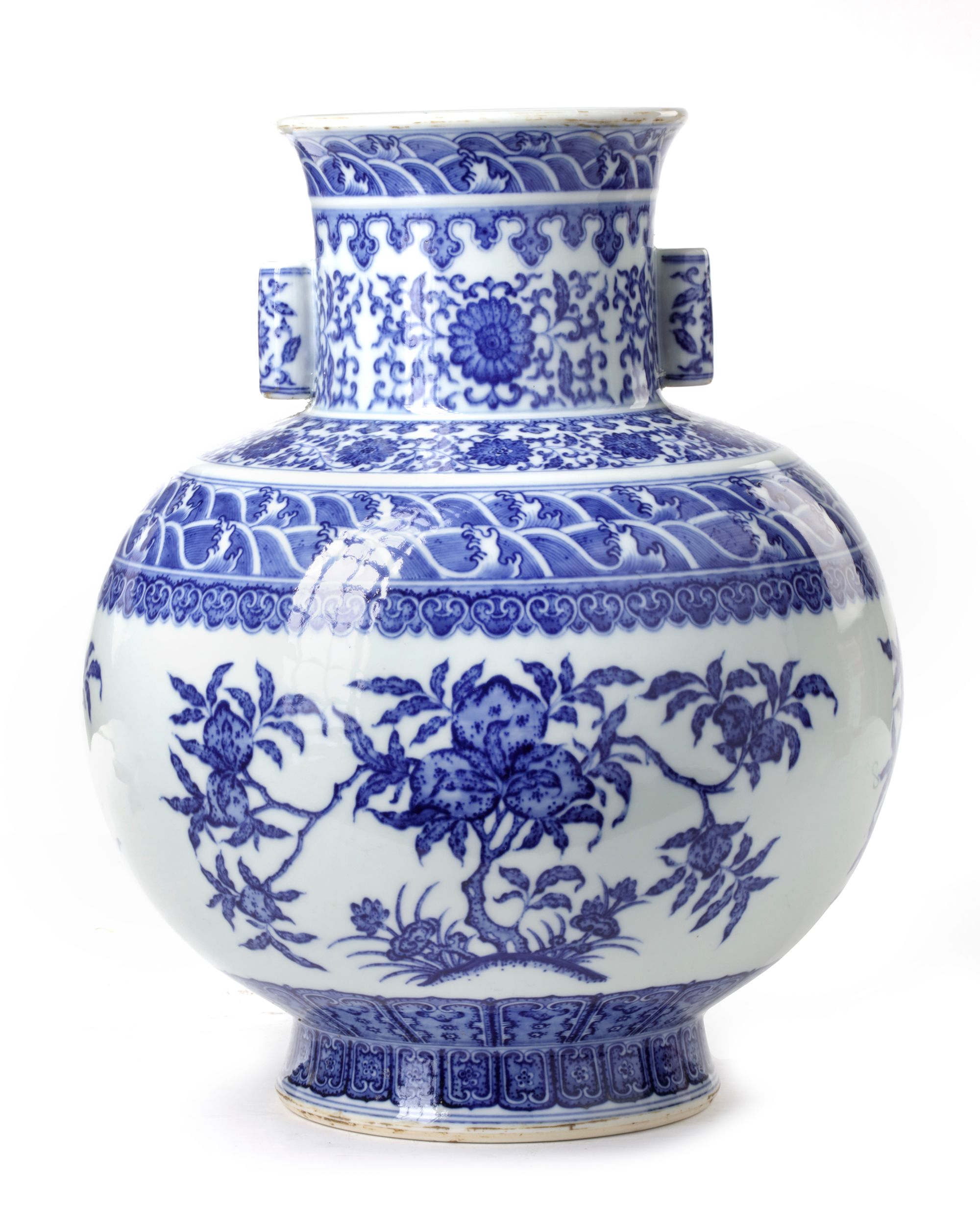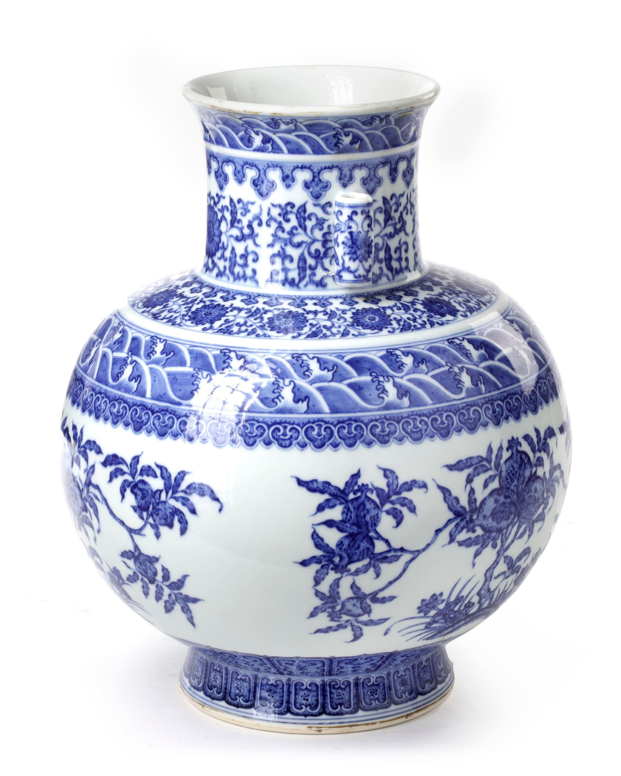 A Chinese hu-form porcelain vase, decorated around the body with fruiting branches of peaches, pomegranates and Citroen. All between a band of ruyi-heads and sea waves to the shoulder and two bands of petal lappet border to the base. The neck is further painted with flower scrolls and foliage below a band of ruyi heads. The bottom with a Chinese Qianlong seal mark. 43 cm.