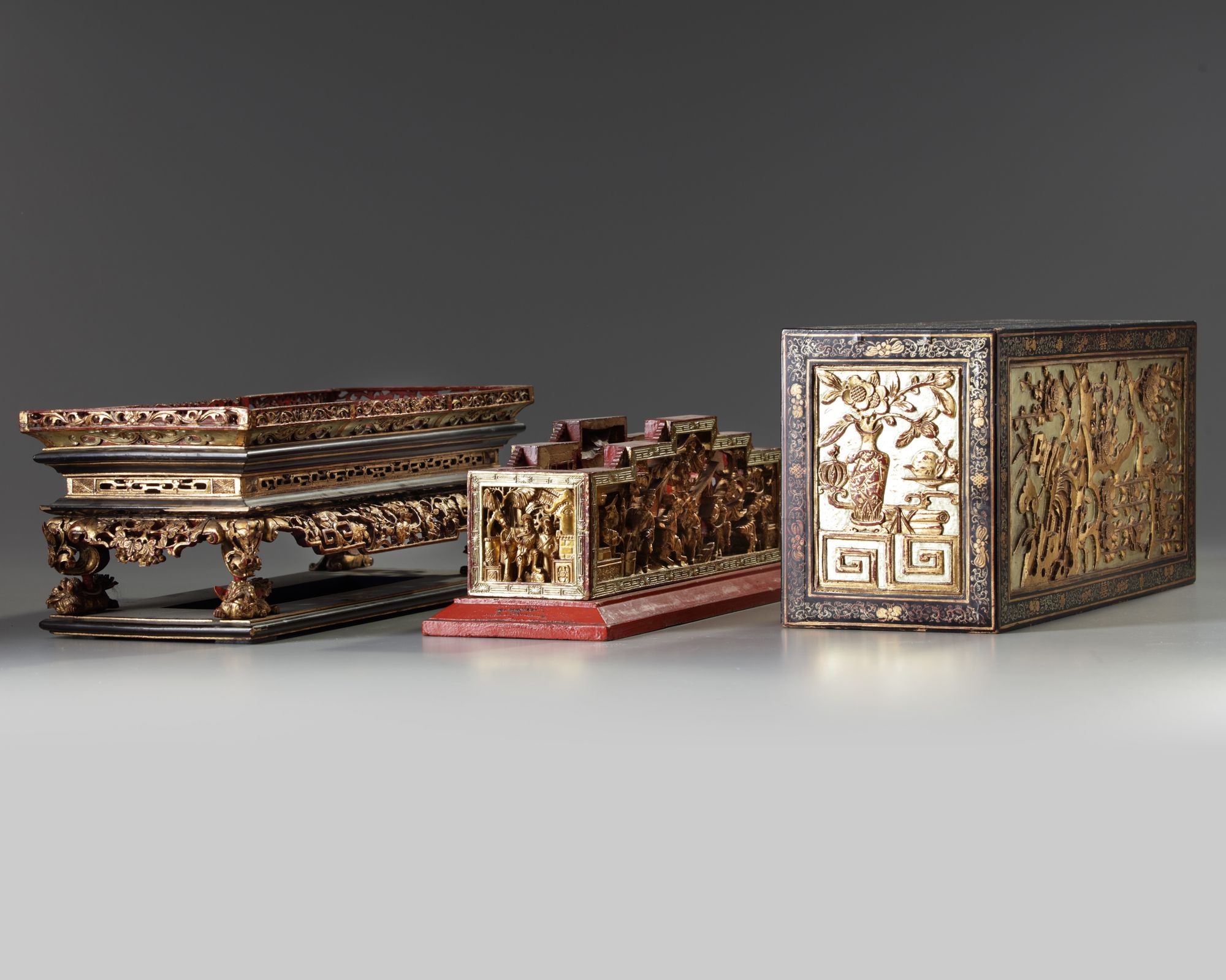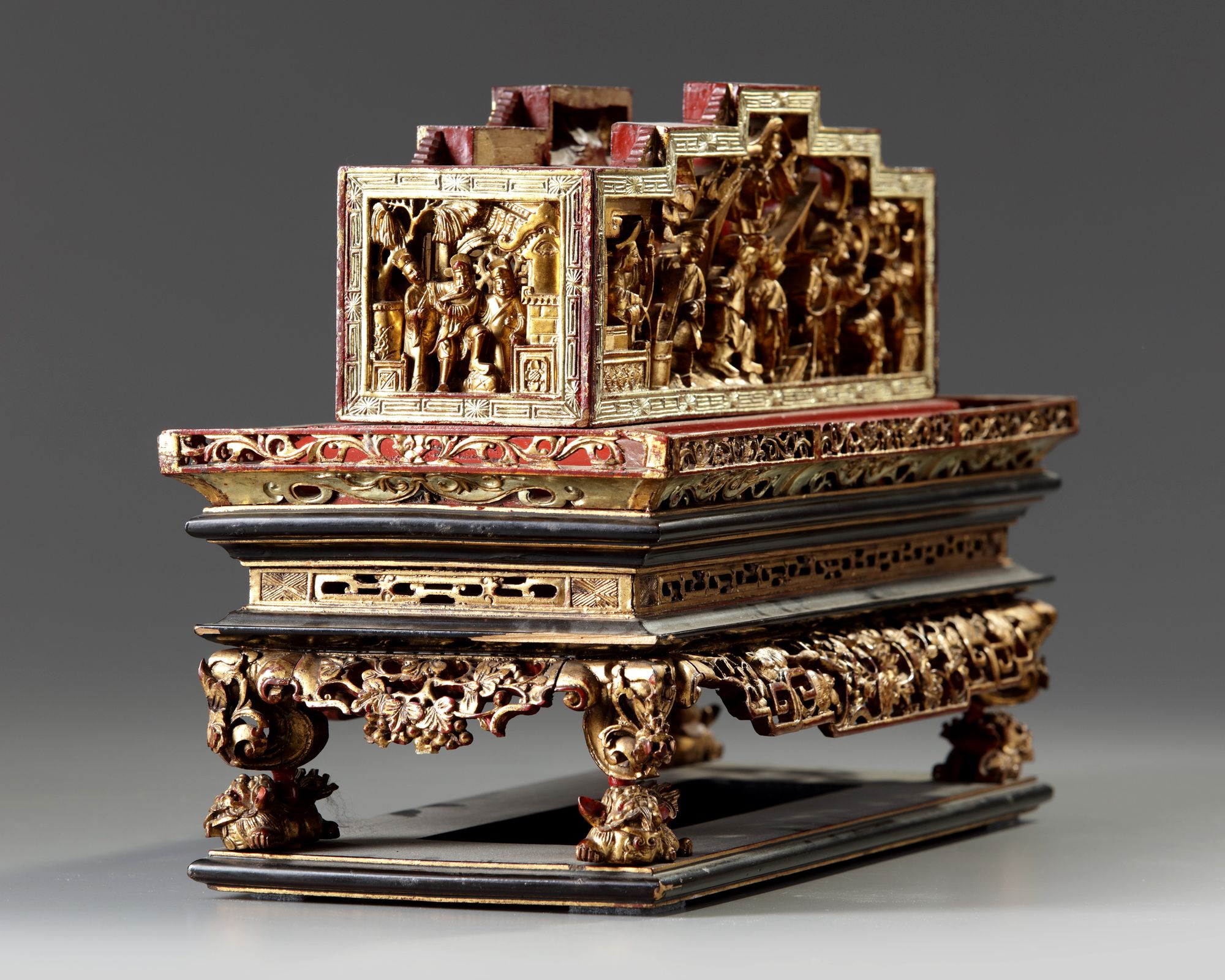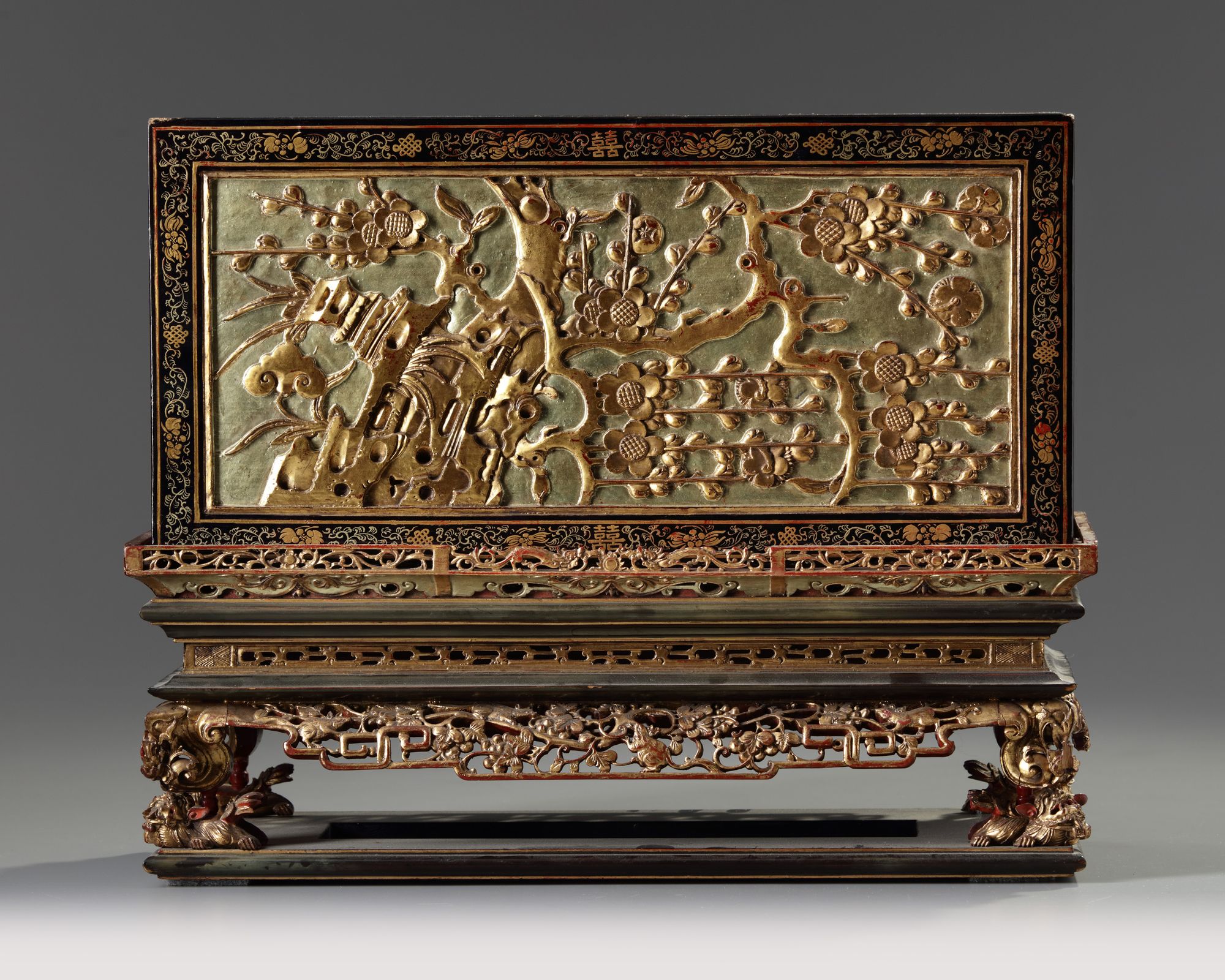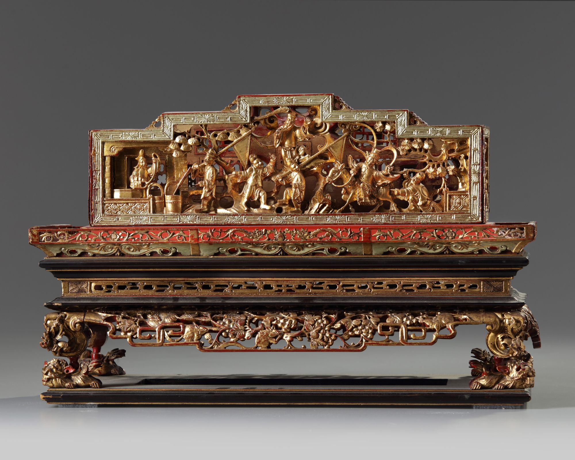 The front of the cover is decorated with a panel in high relief depicting a narrative military scene, most likely from the Romance of the Three Kingdoms, surrounded by a border of grape and flower vines, the reverse is carved in relief with prunus and rocks, surrounded by a border of shuangxi characters and Buddhist knot. The sides of the box are decorated with flowers and precious objects. The interior is set with a further structure with openwork relief narrative panels. The aprons of the stand are delicately carved and pierced with squirrel and grapes, all supported on four Buddhist lion feet.