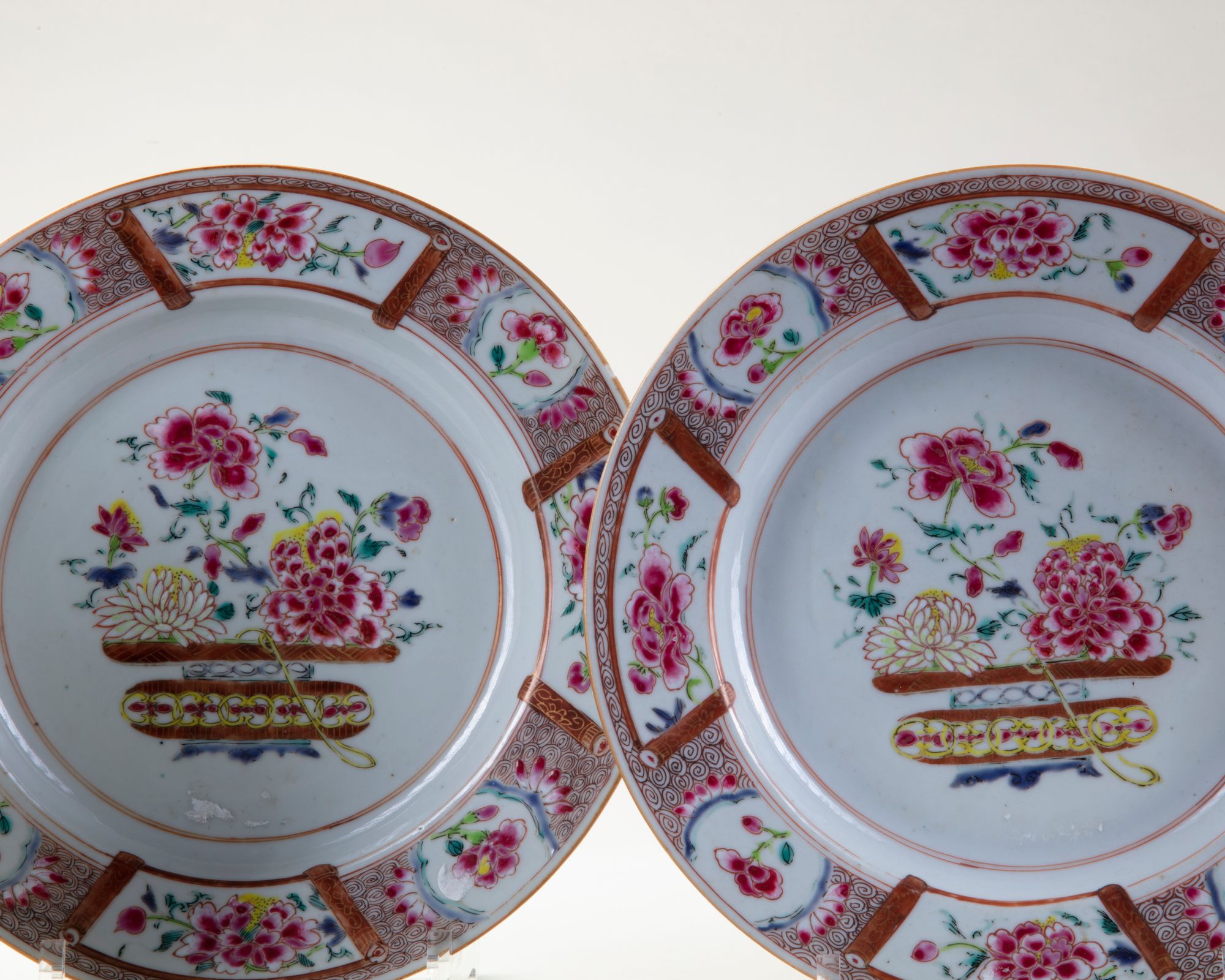 Decorated to the centre with flower baskets, the rim decorated with floral sprays and cartouches containing more floral sprays. 22 cm diameter.