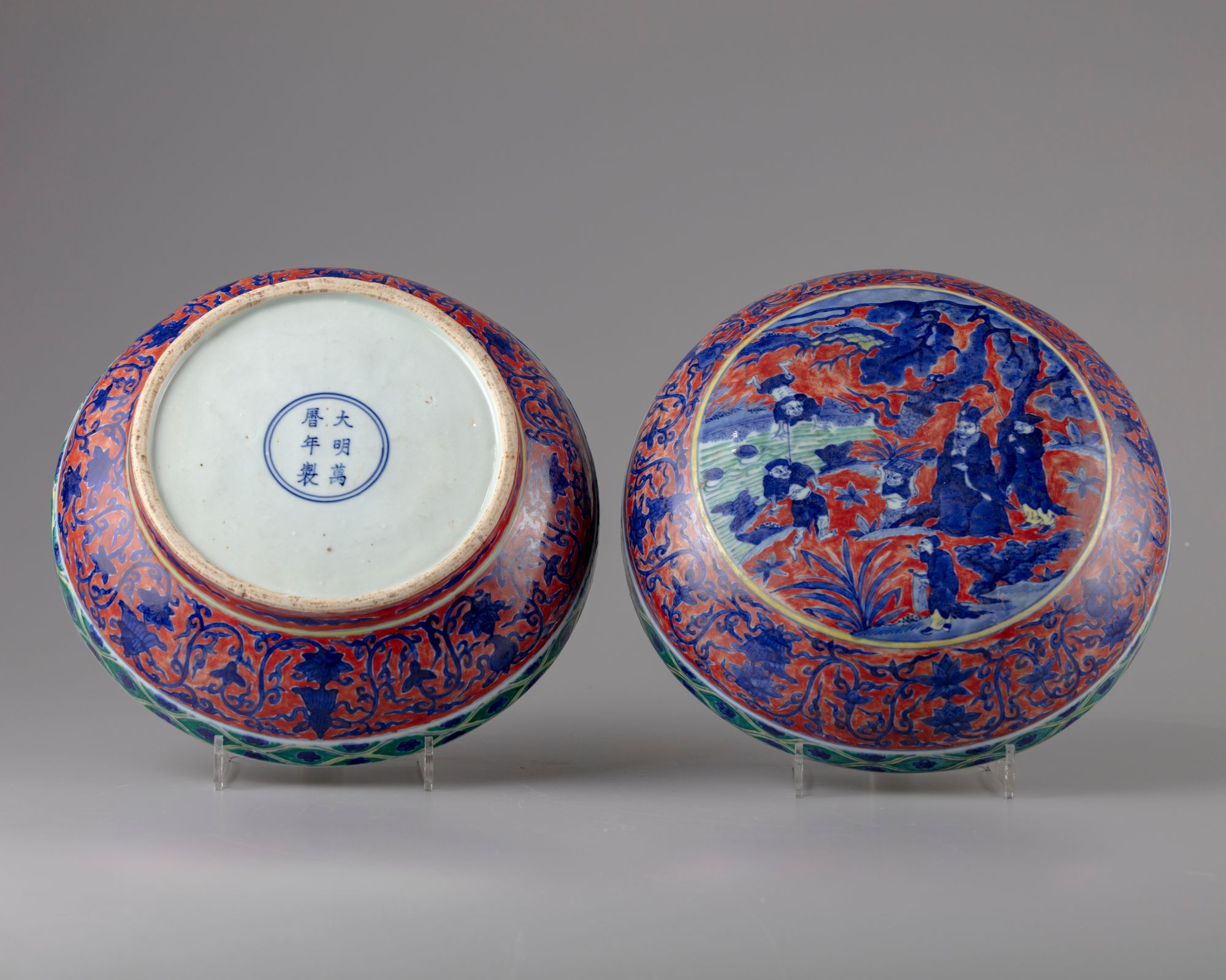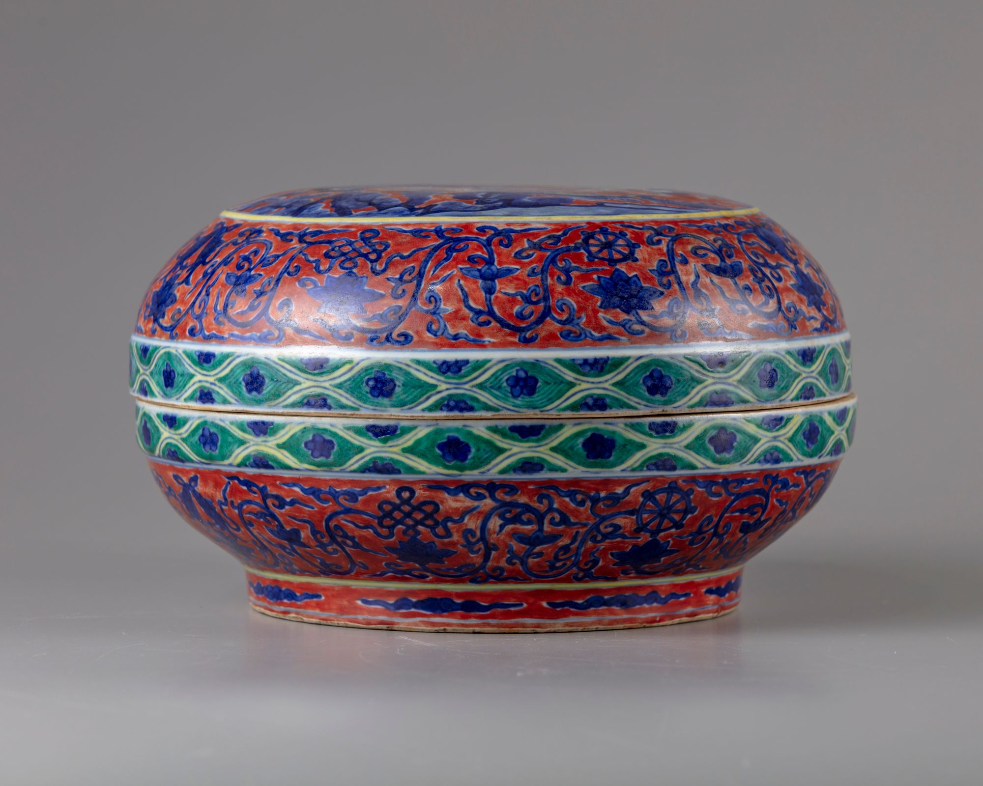 The cover is decorated with a roundel enclosing a Shou lao figure with demons and assistant in a landscape,The side in blue with lotus scrolls interspersed with Daoist emblems with foliage band. The box decorated with lotus scrolls with Daoist emblems and clouds, All on an iron-red ground The bottom with a Wanli Chinese six character mark.