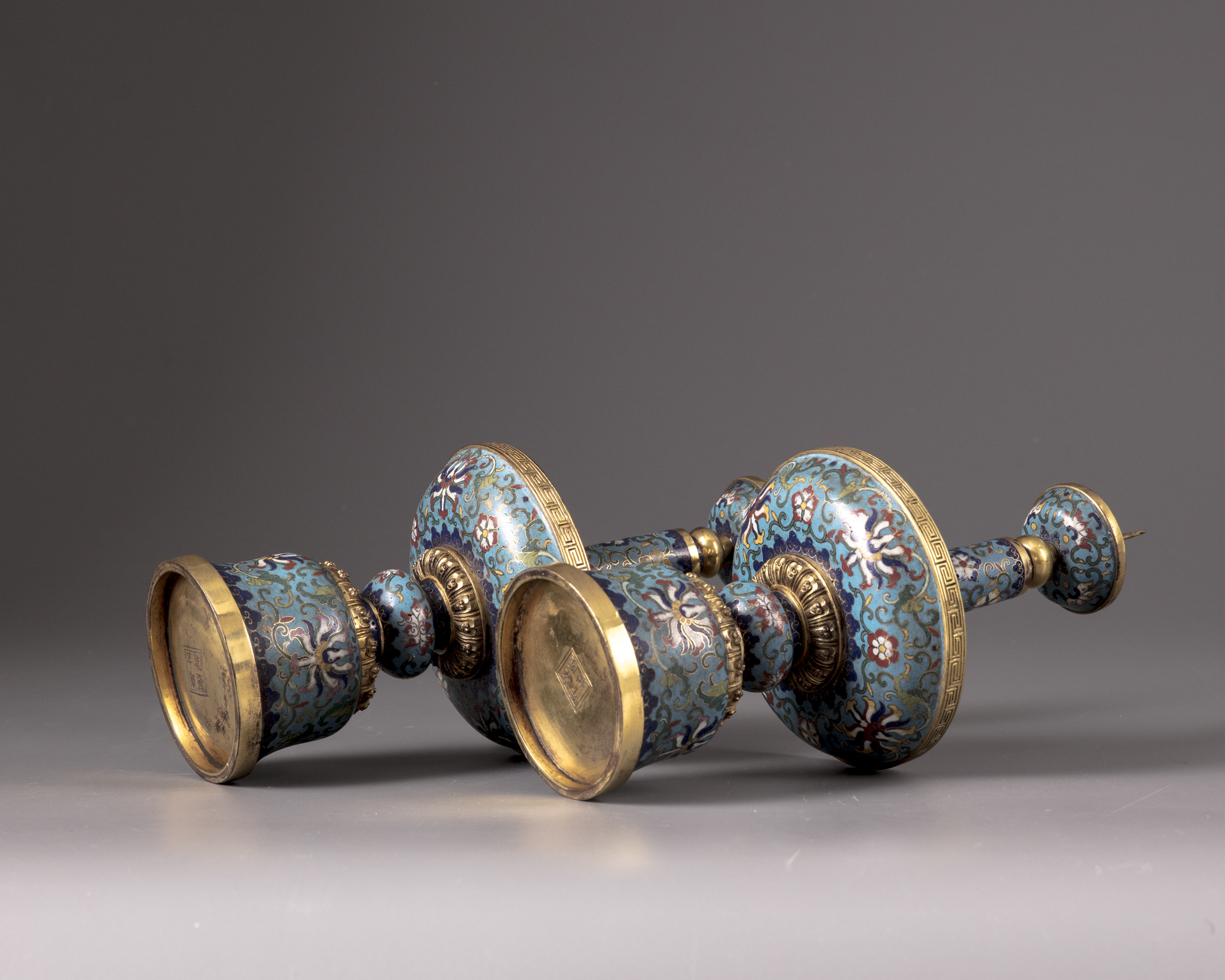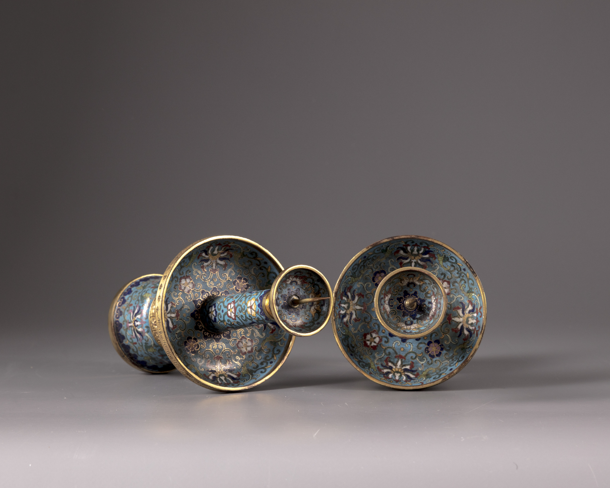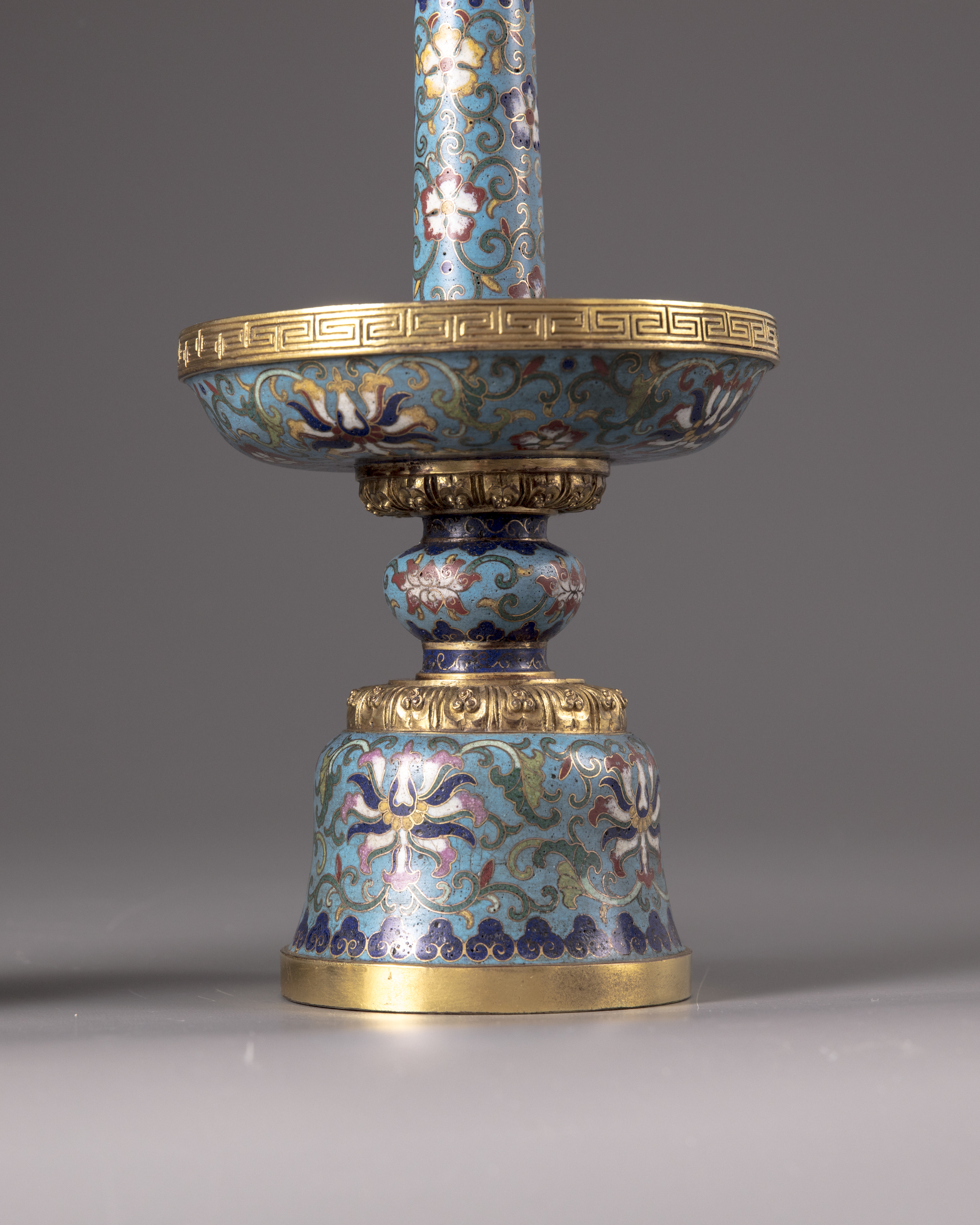 Of typical shape with a bell-shaped foot and a large and a small drip pan, covered all over with lotus flowers and scrolls on a blue ground. At the base an apocryphal Qianlong four-character mark in a double square.