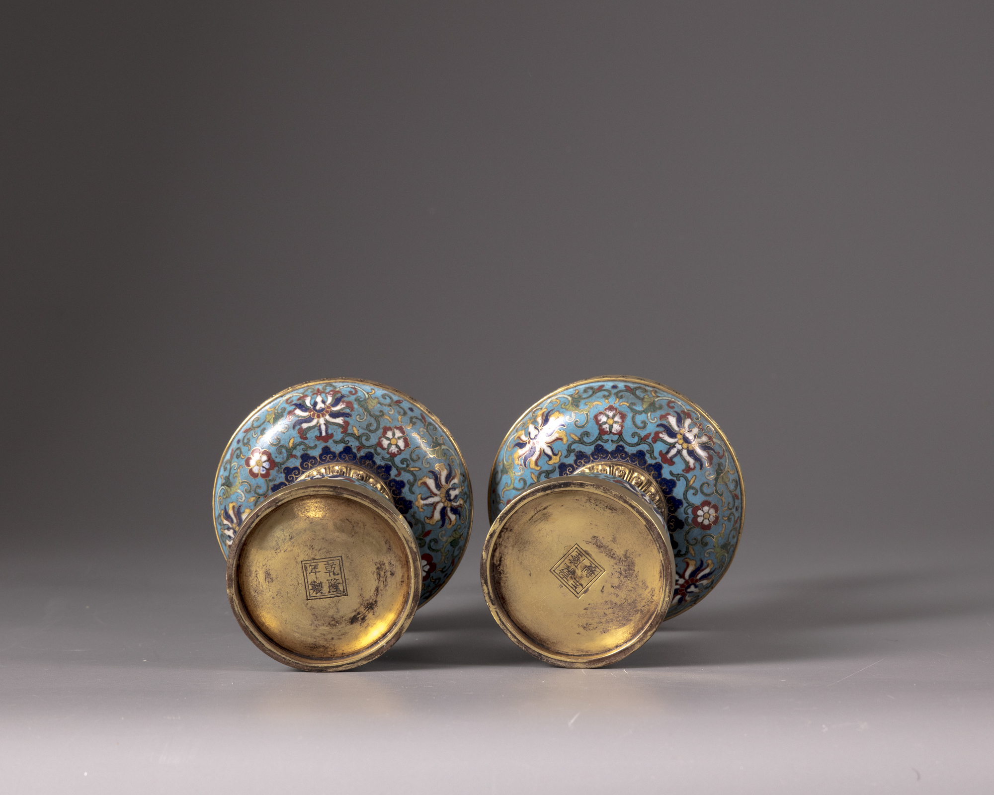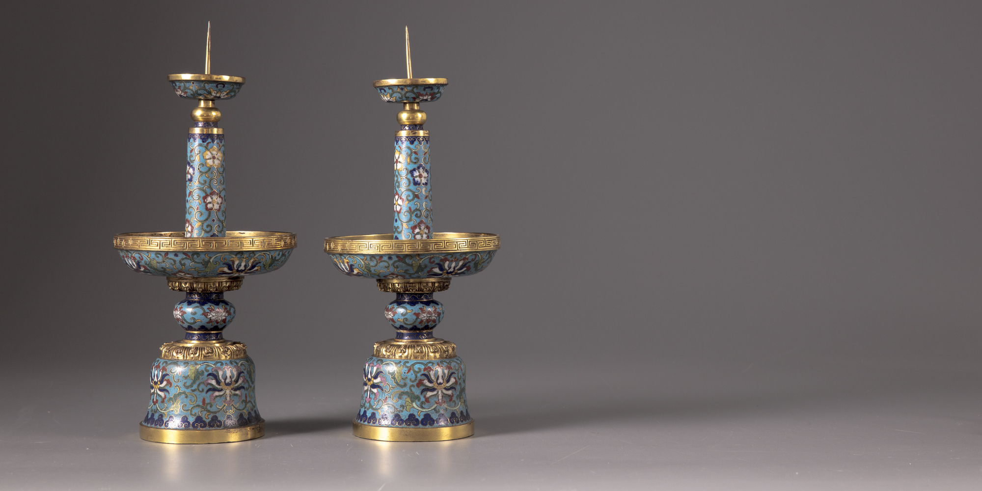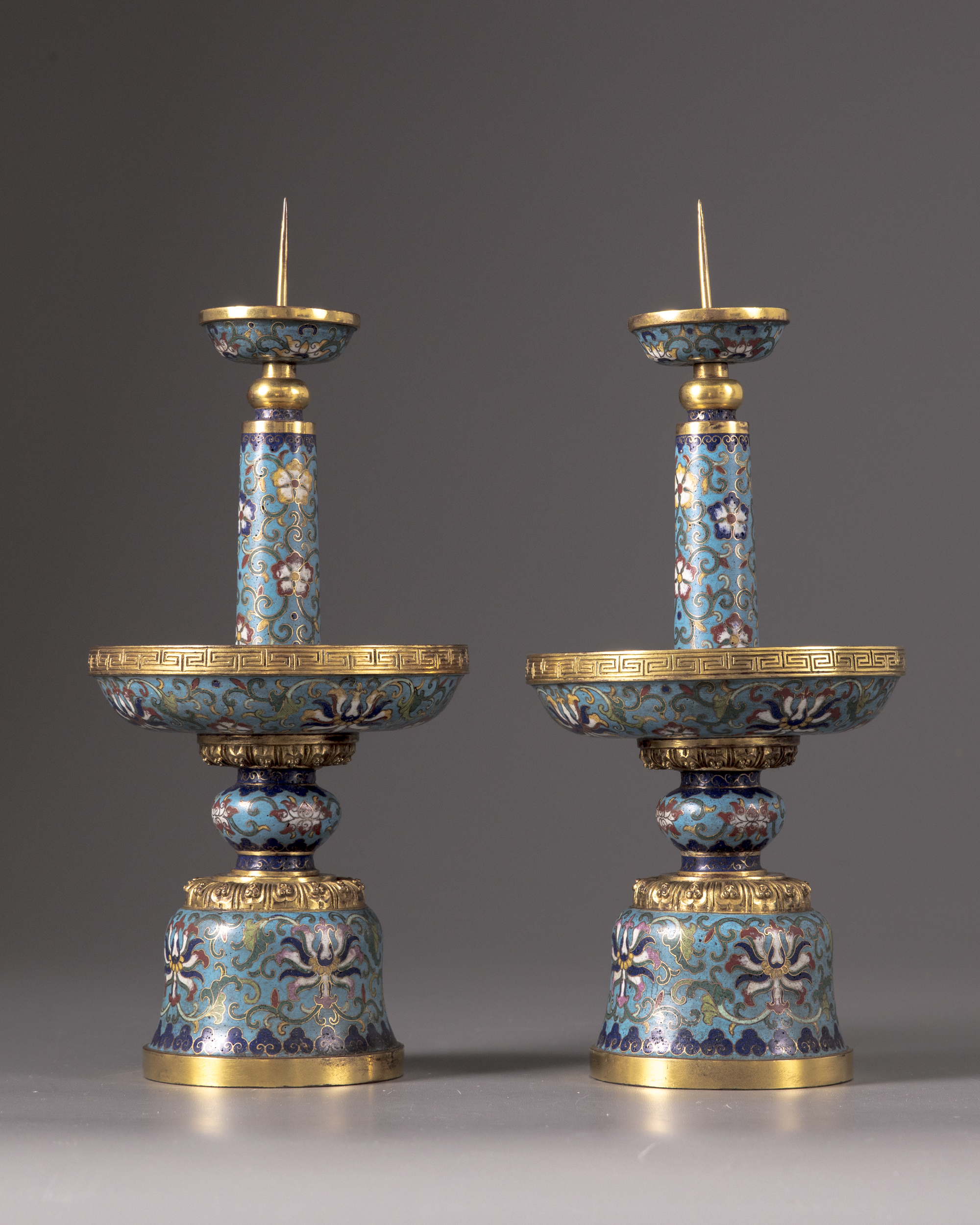 Of typical shape with a bell-shaped foot and a large and a small drip pan, covered all over with lotus flowers and scrolls on a blue ground. At the base an apocryphal Qianlong four-character mark in a double square.