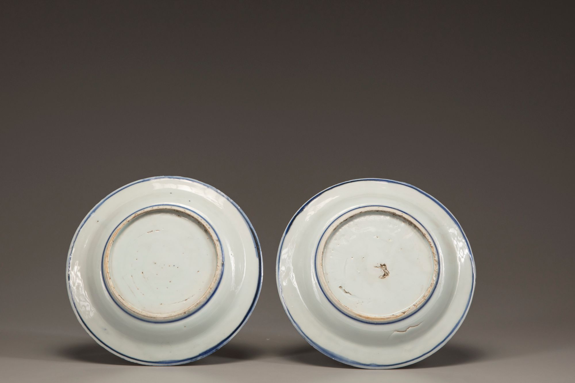 Each dish is decorated to the centre with a circular panel enclosing a scene of a scholar in a mountainous river landscape. The panel is surrounded by a floral band to the rim.