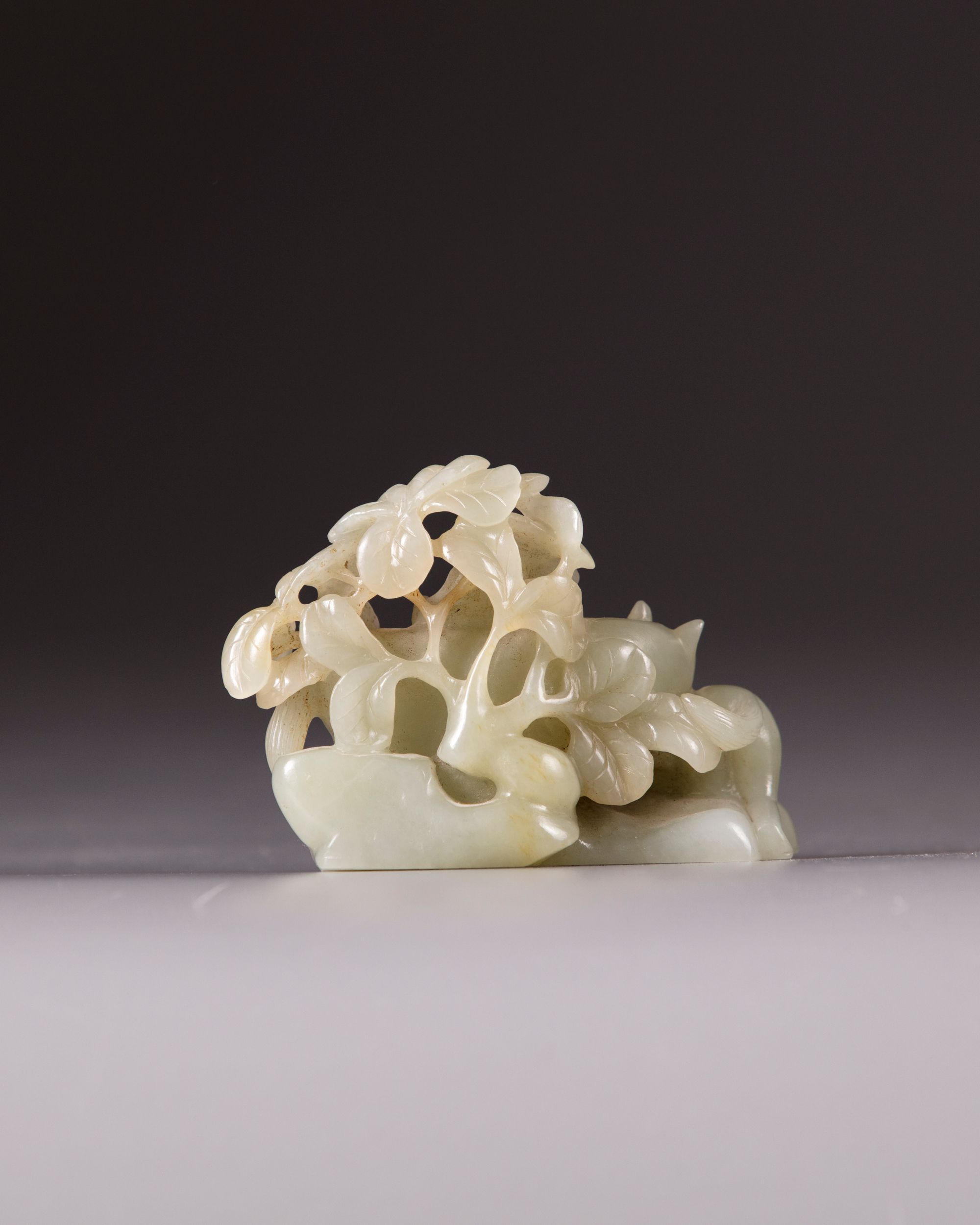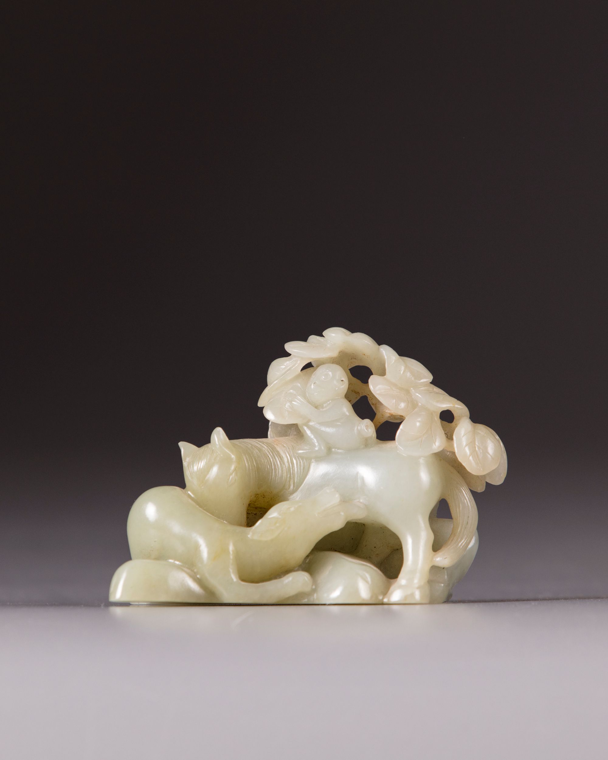 The piece is carved in the round as a horse and monkey below a leafy branch, with a further crouching animal with its tongue out below, all amongst rocks. The stone is of a pale celadon tone with fine veins.