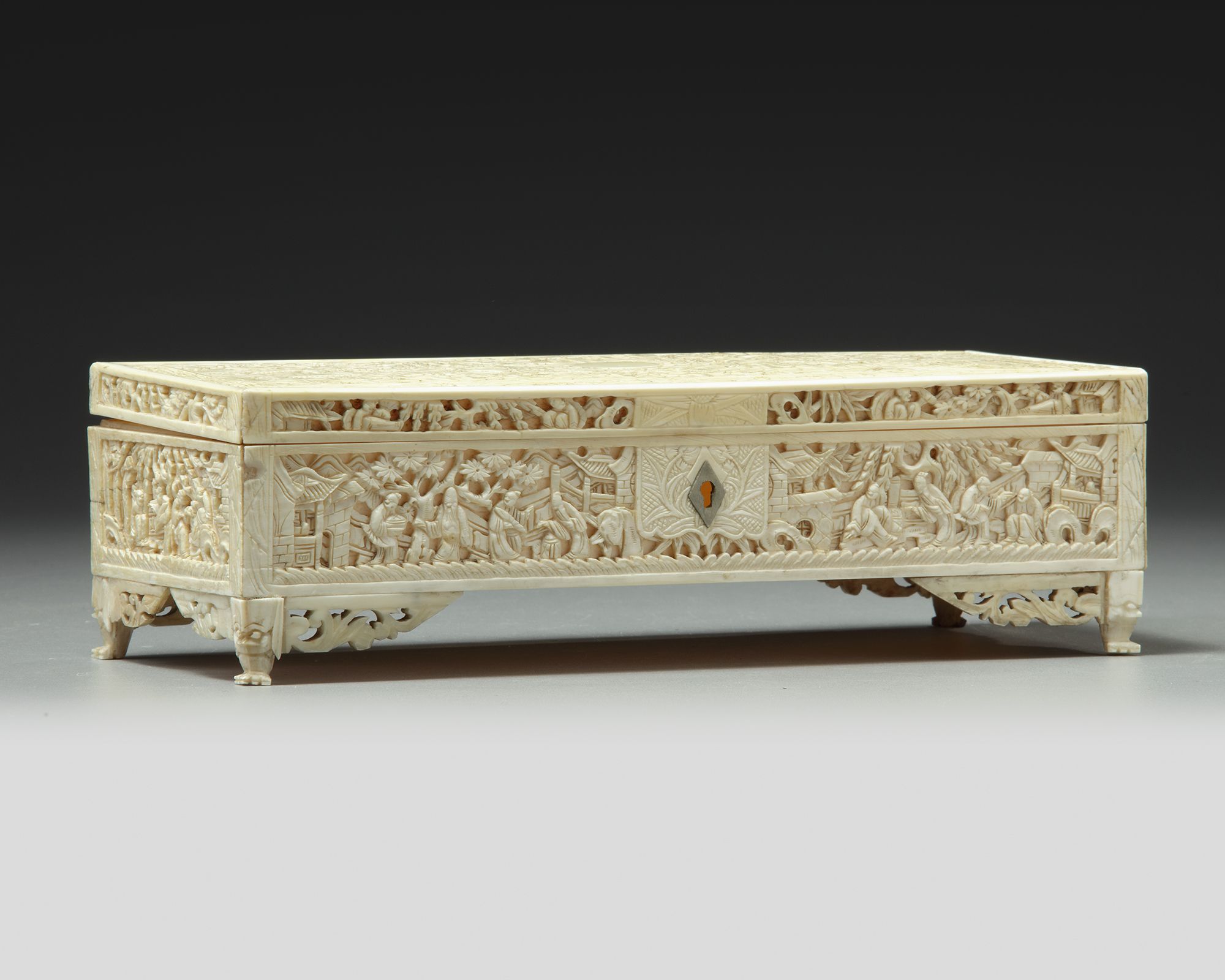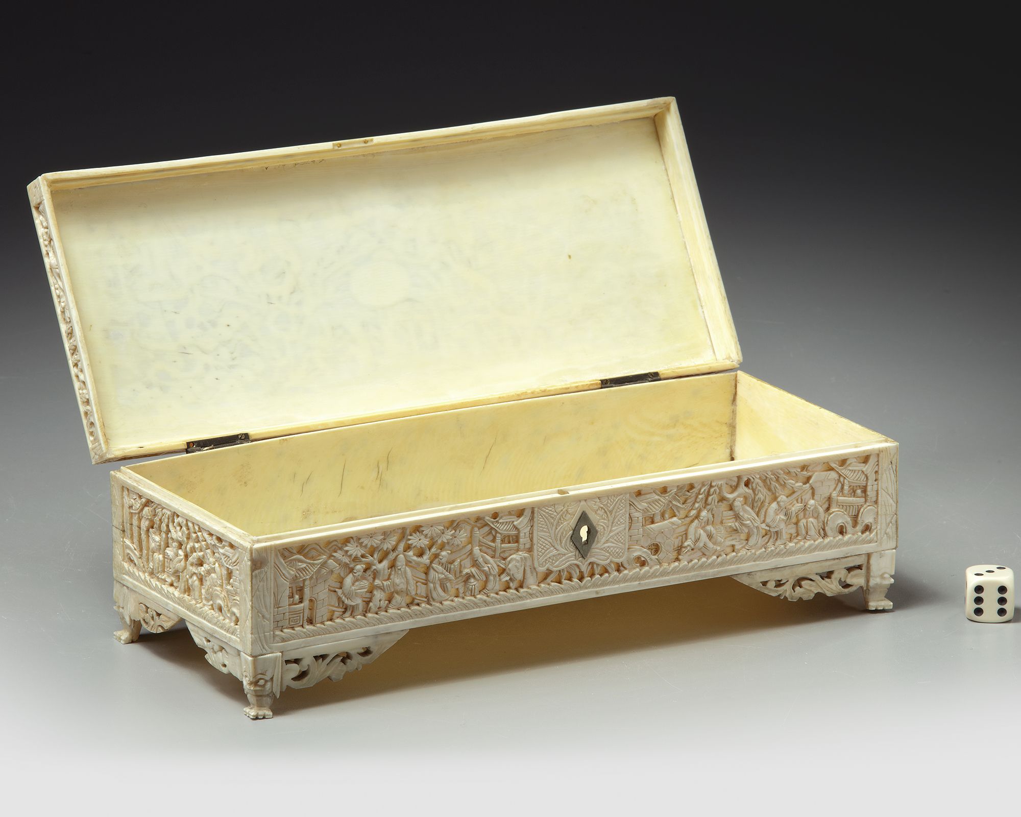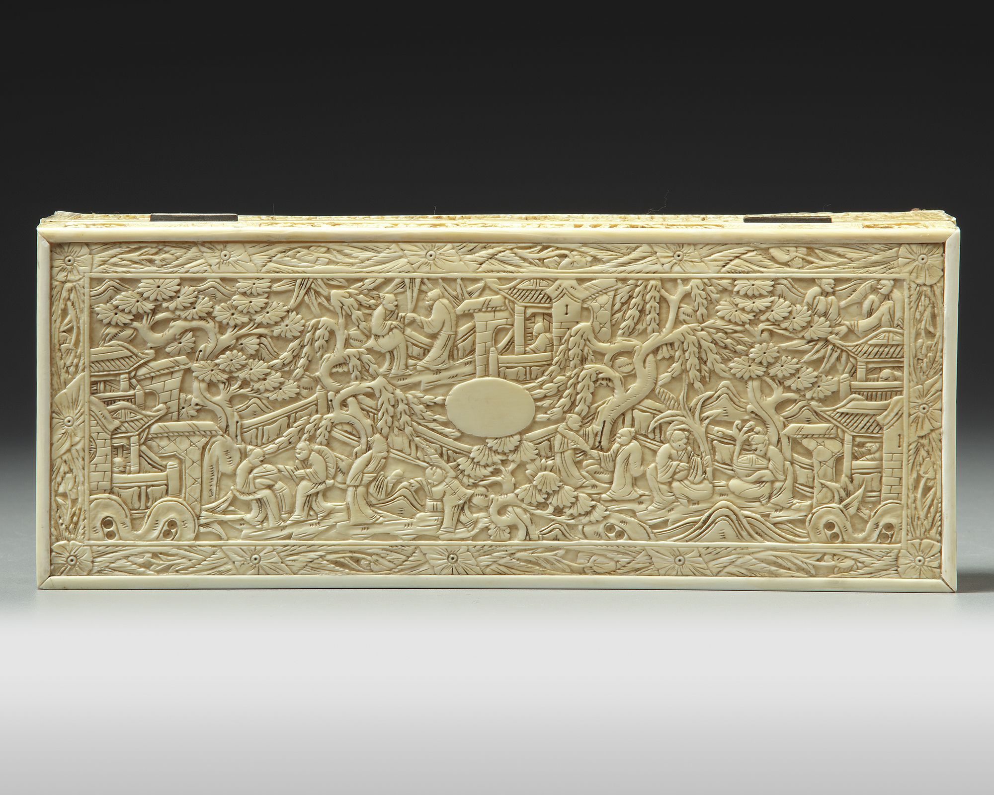 Carved with panels depicting figures amongst trees and pavilions. 10 by 24 cm.