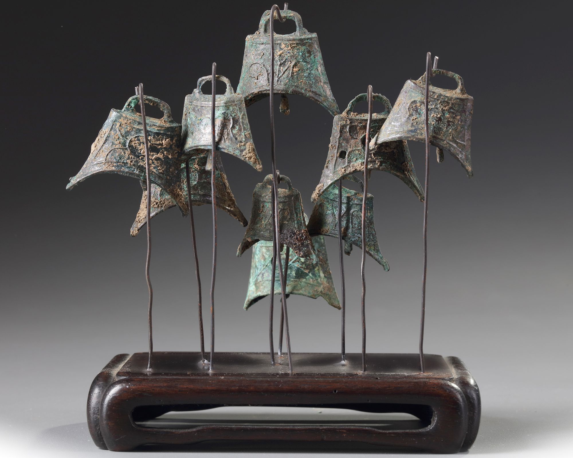 The bells of various sizes, cast of lenticular section with a concave lower rim, each surface with a different design in relief.