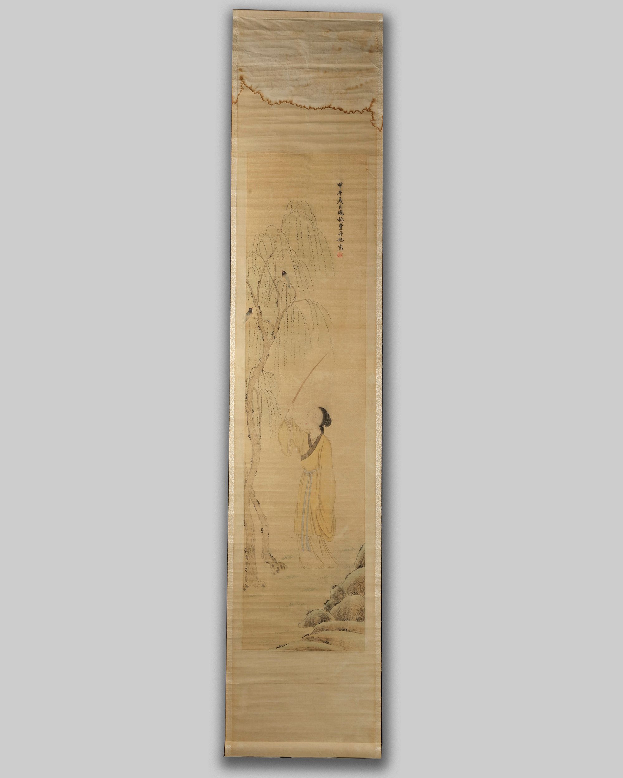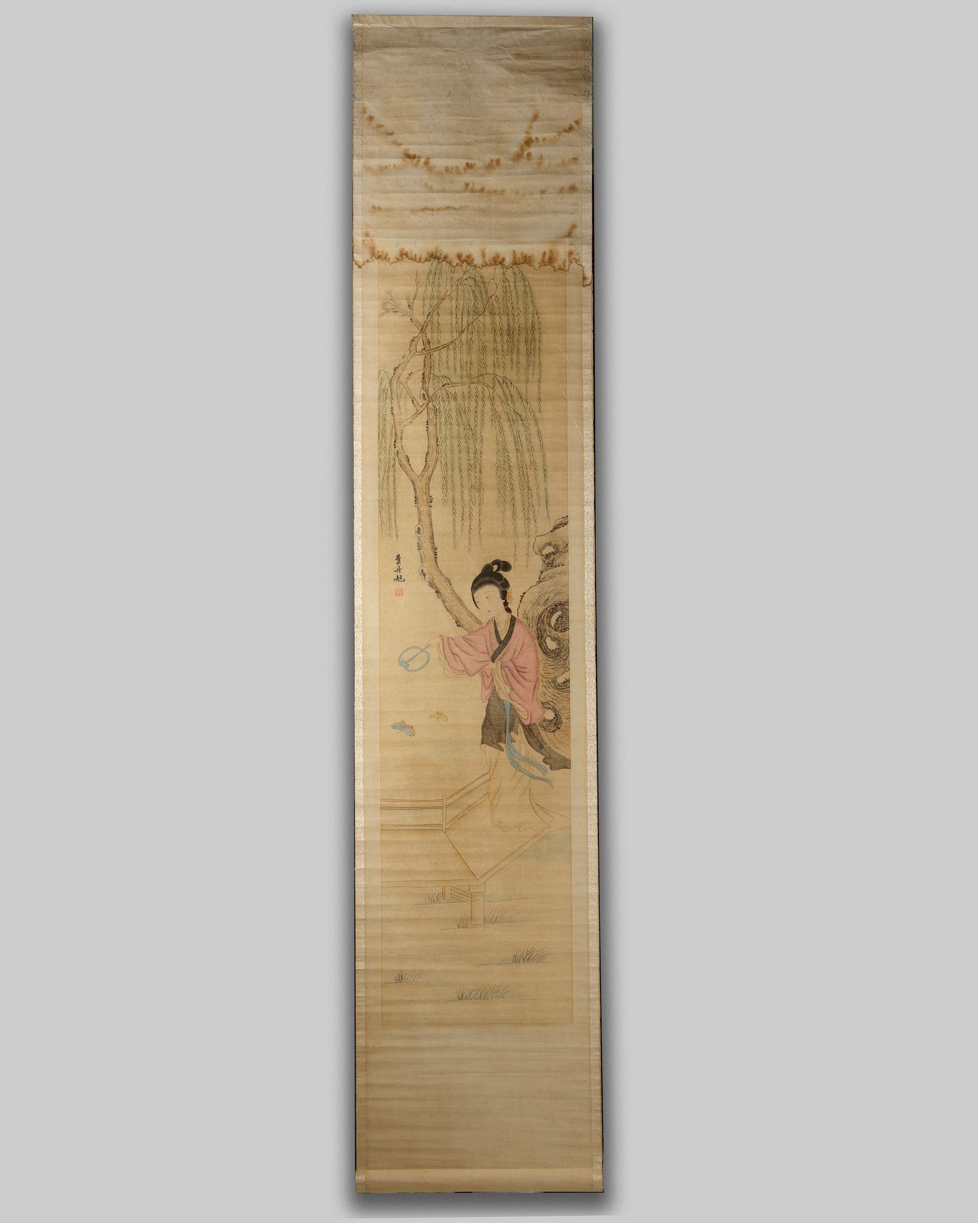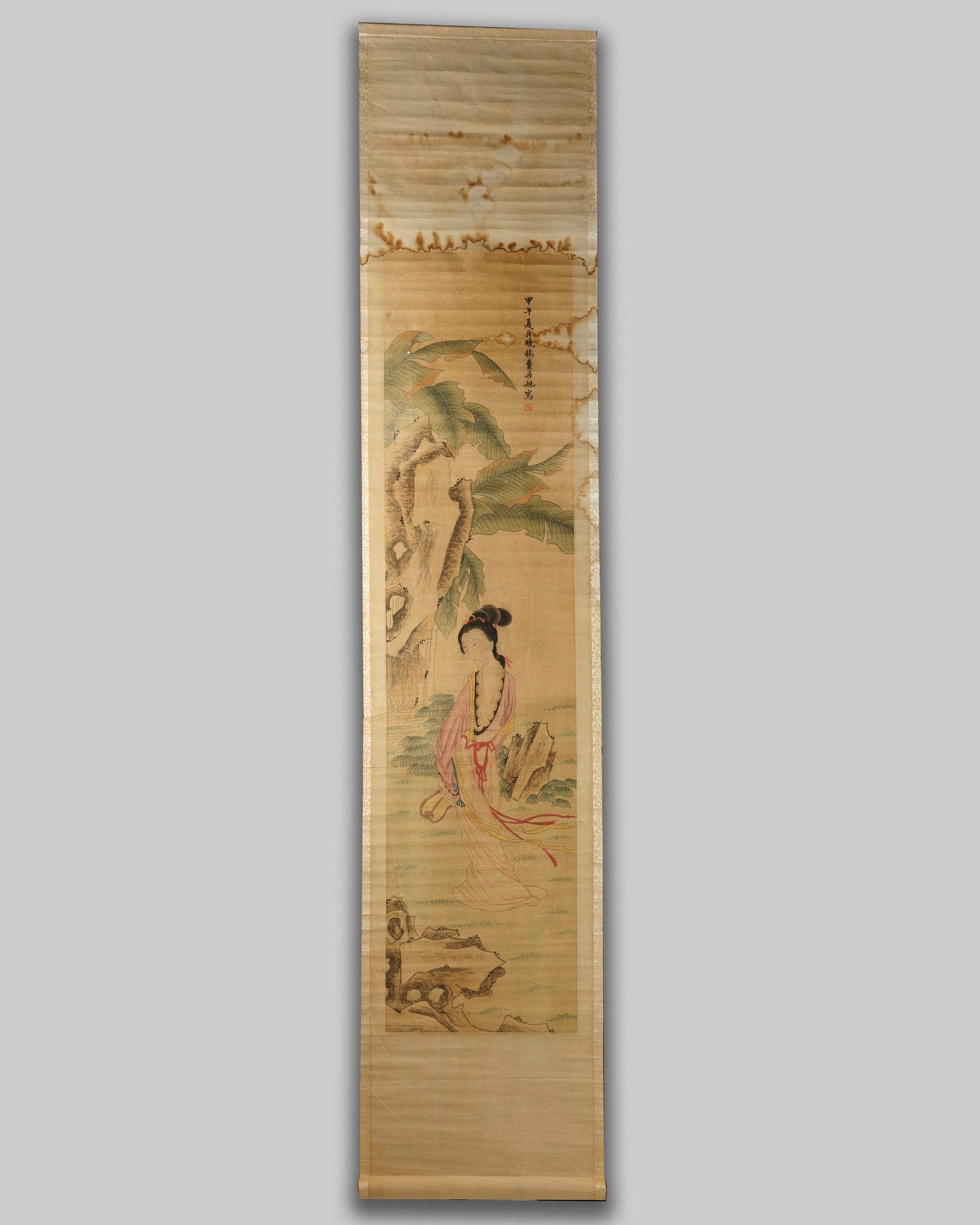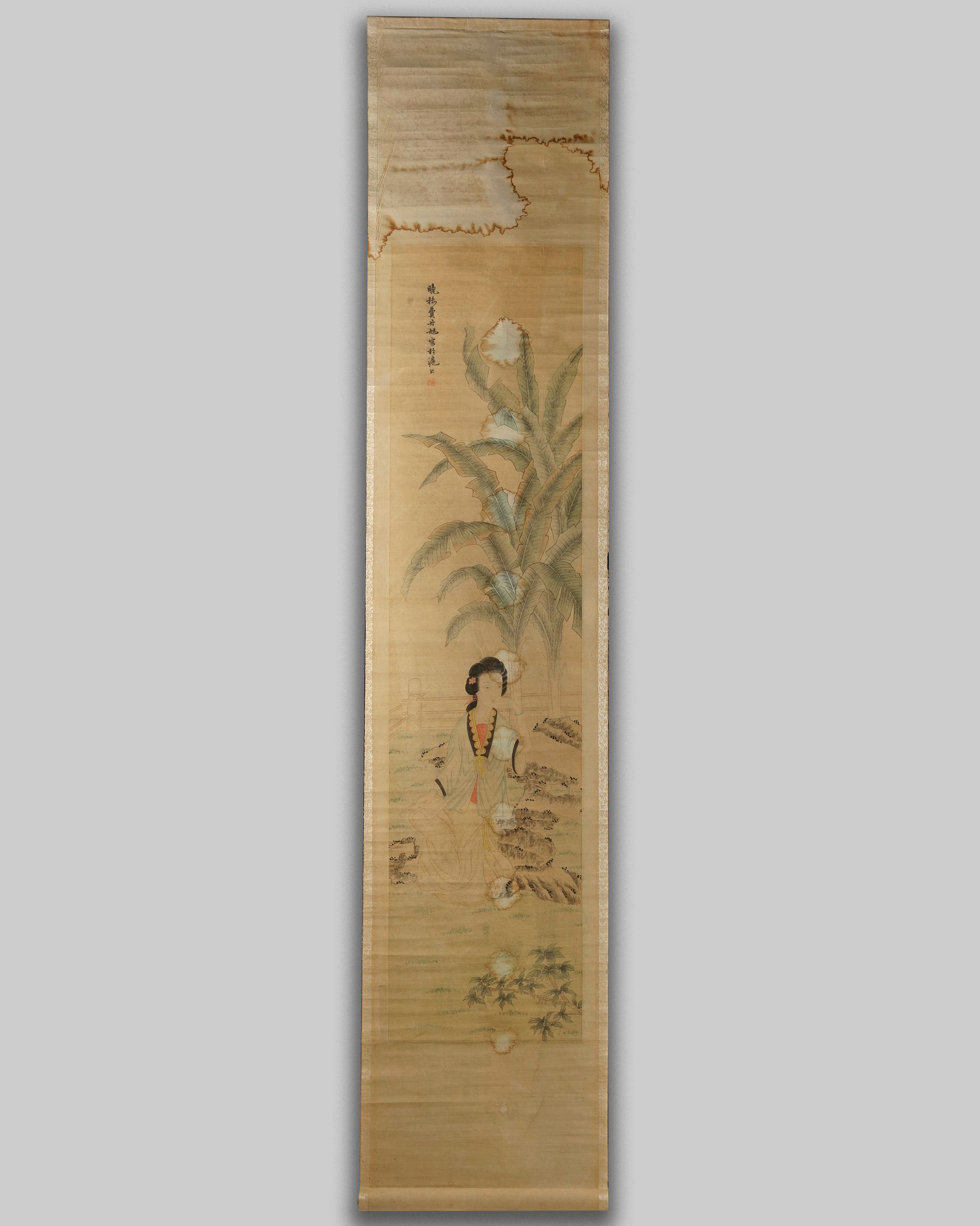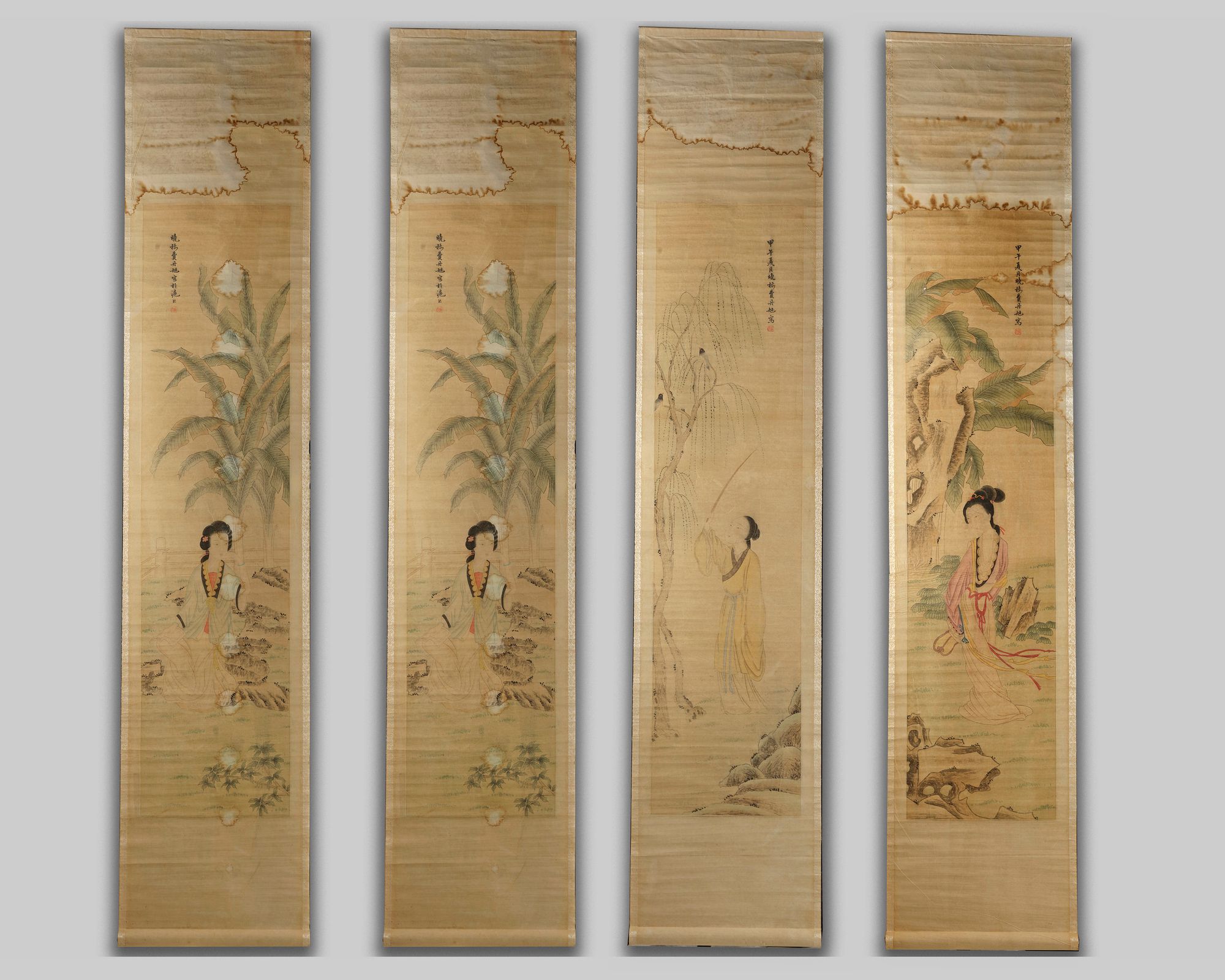 Ink and colour on paper. painted each with a lady in variety of postures beside plantain leaves. With signature of Fei Danxu.