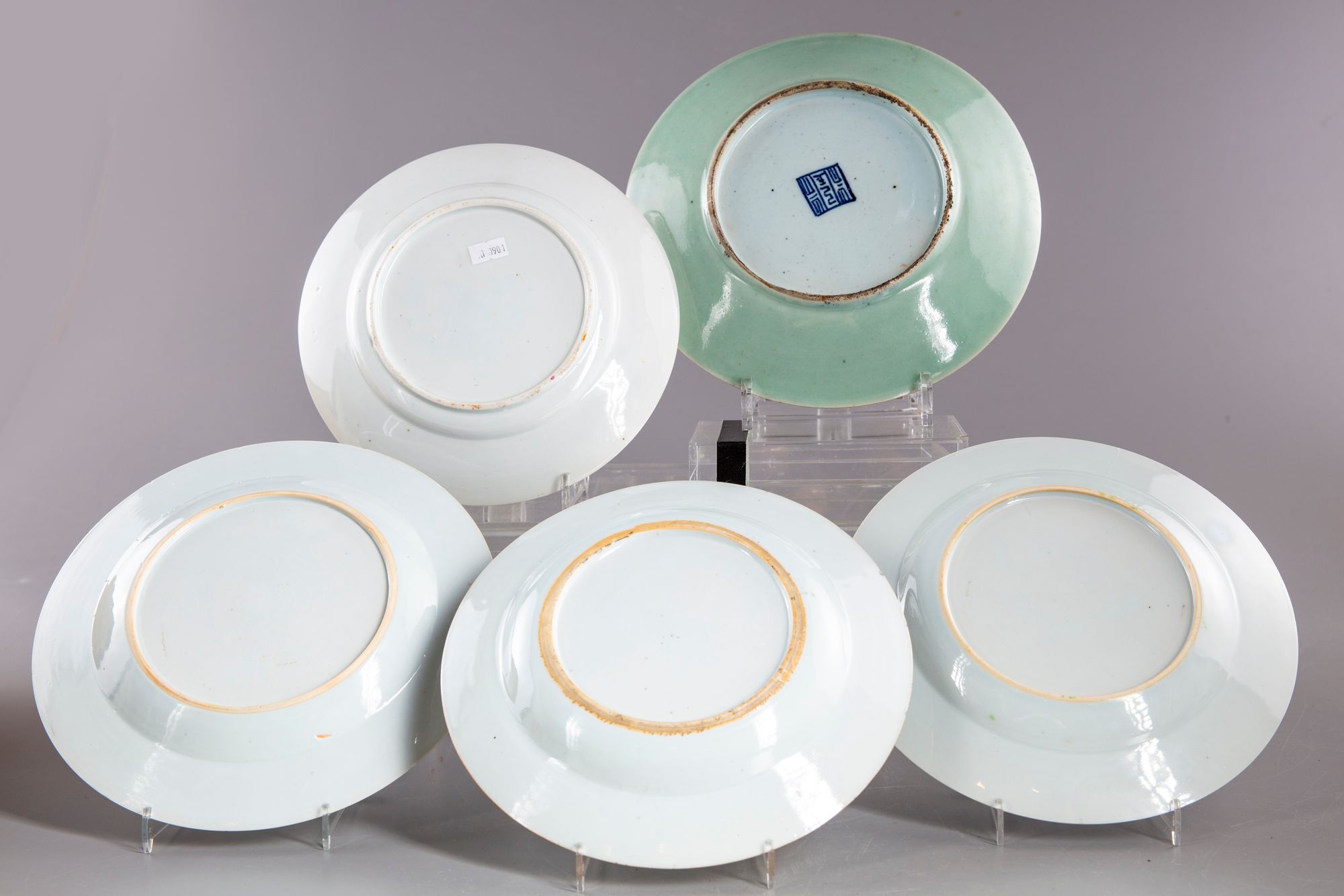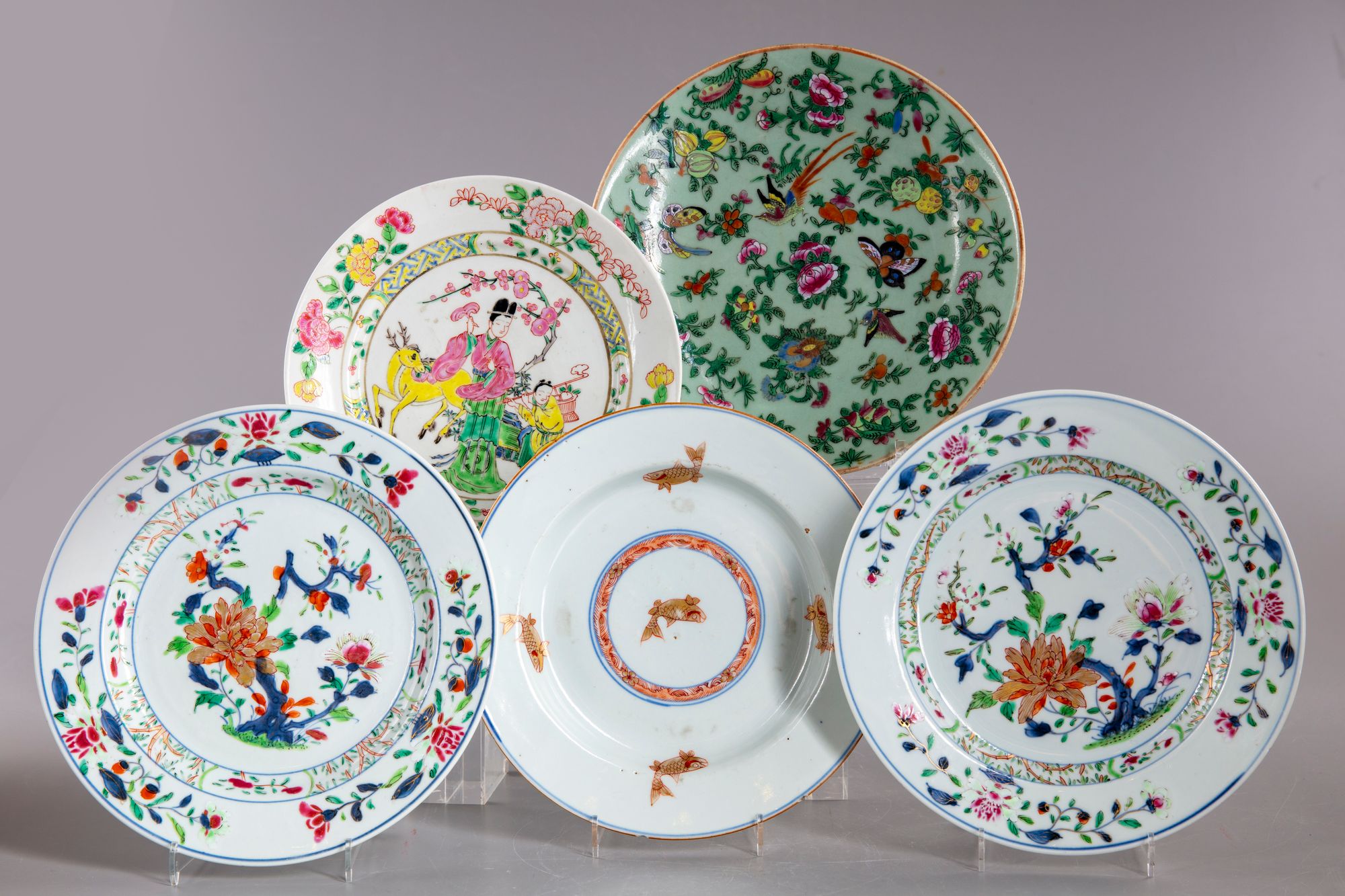 A lot of five dishes: - Two Chinese famille rose dishes decorated with chrysanthemum flowering branches. - A kangxi gilt dish decorated with fish. - A famille rose dish decorated with an elegant lady beside a deer and a kid. - A famille rose dish decorated dith a bird and butterflies amongst flowers and foliage.