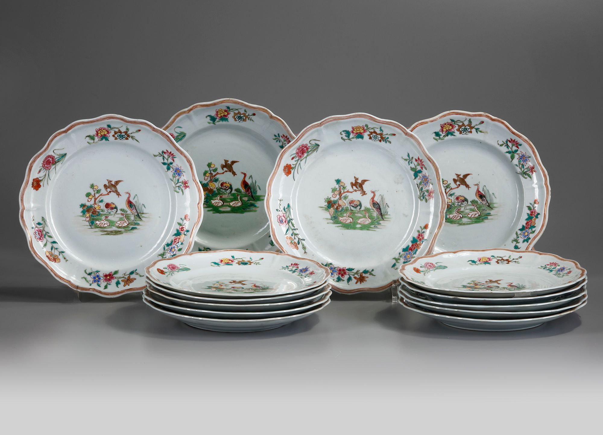 A LOT OF FOURTEEN CHINESE FAMILLE ROSE PLATES, LATE 18TH CENTURY
