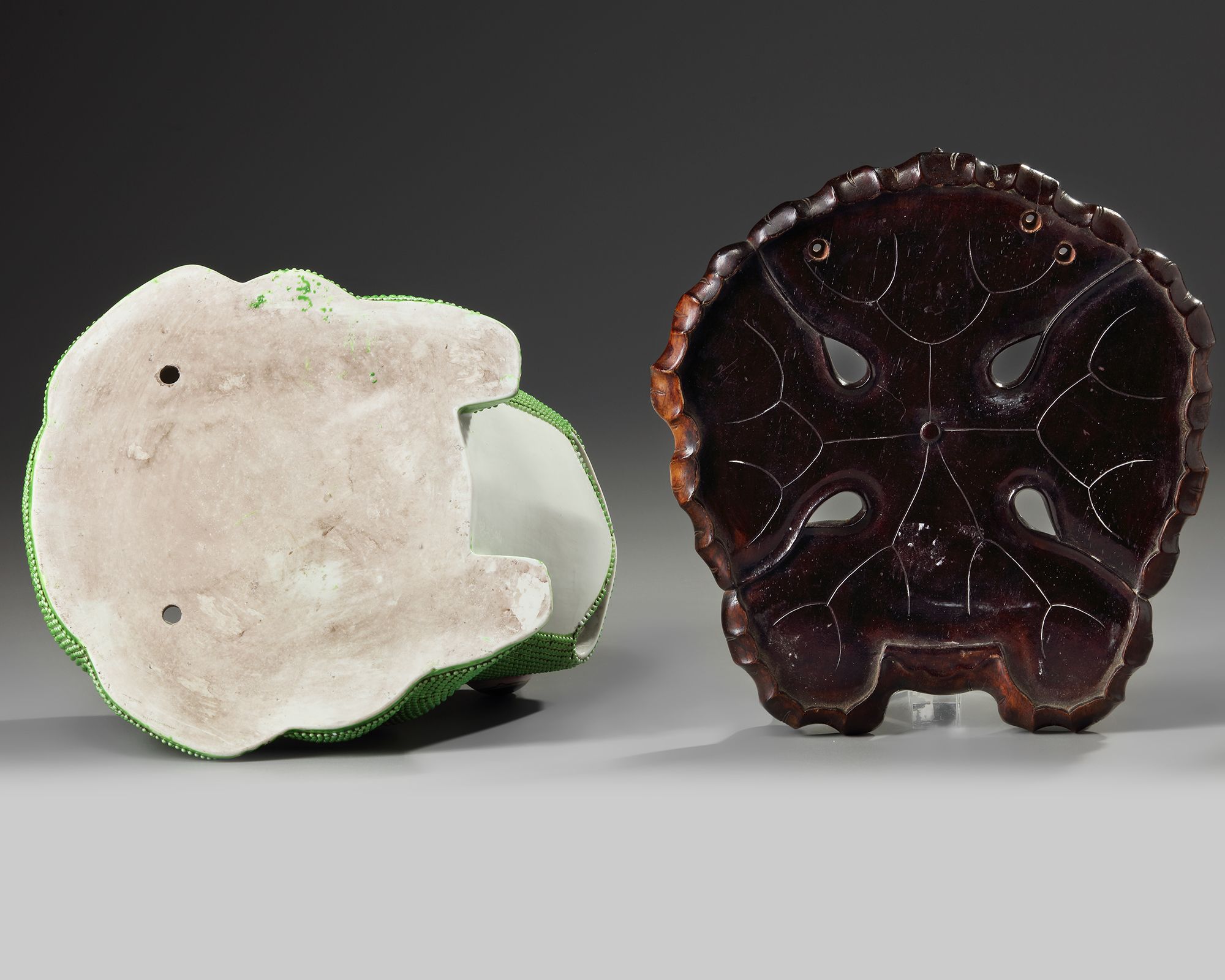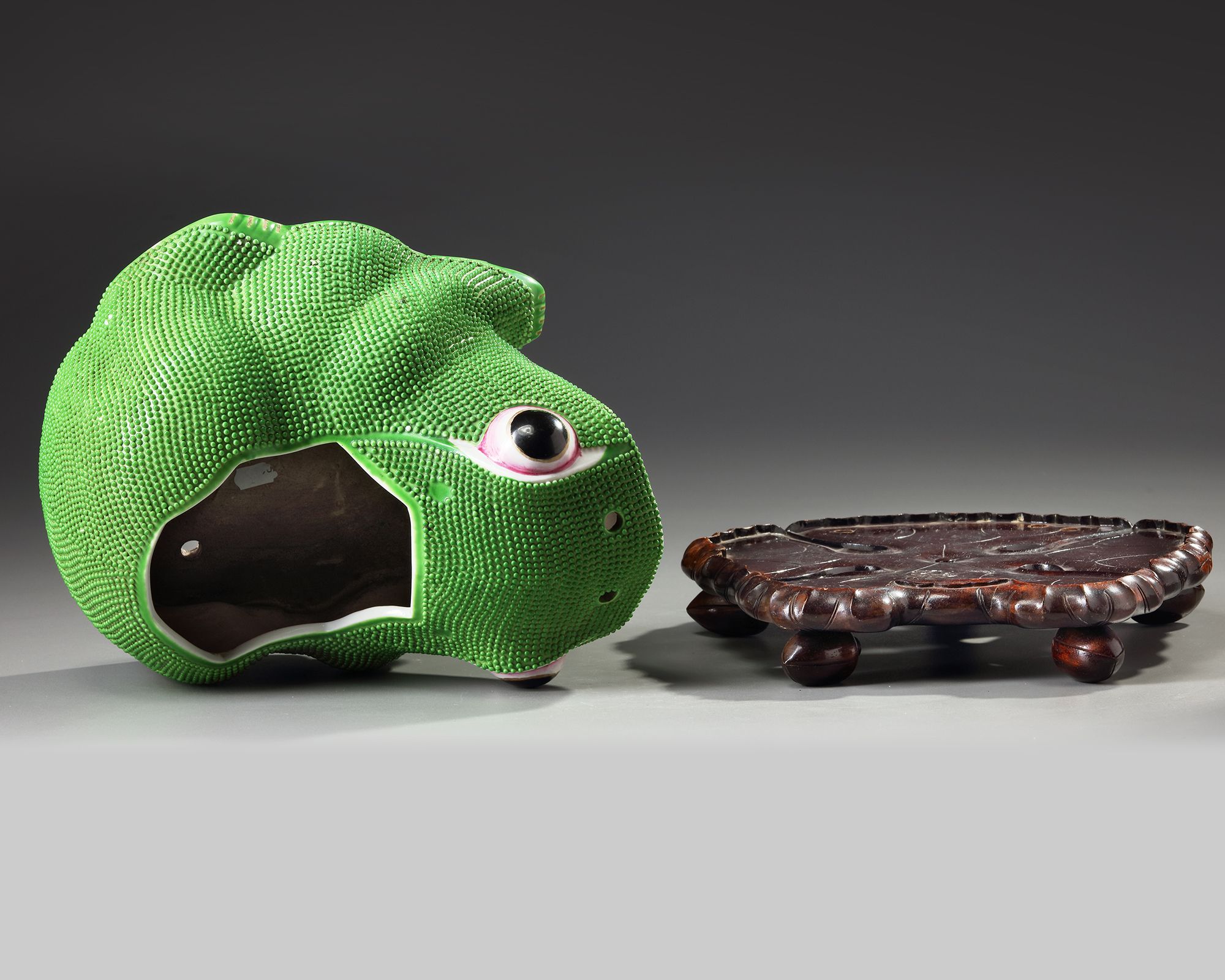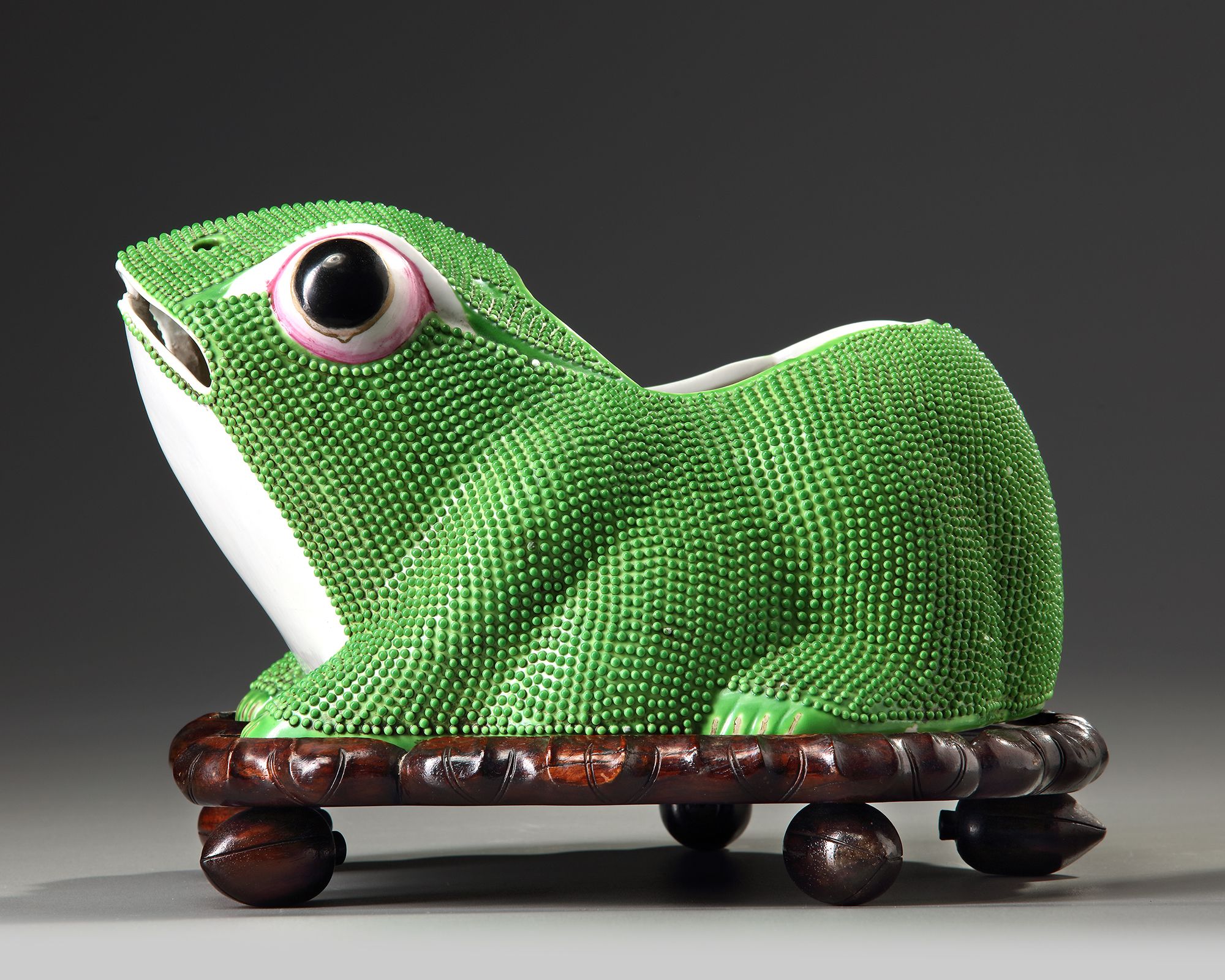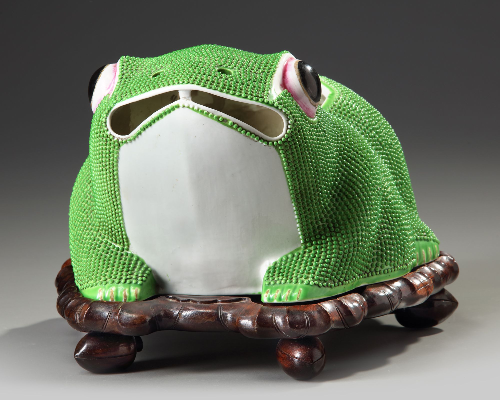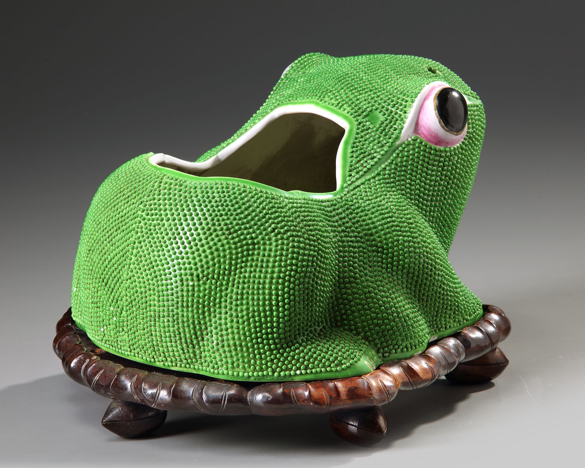 A Chinese green glazed jardinière shaped as a frog, with wooden stand.